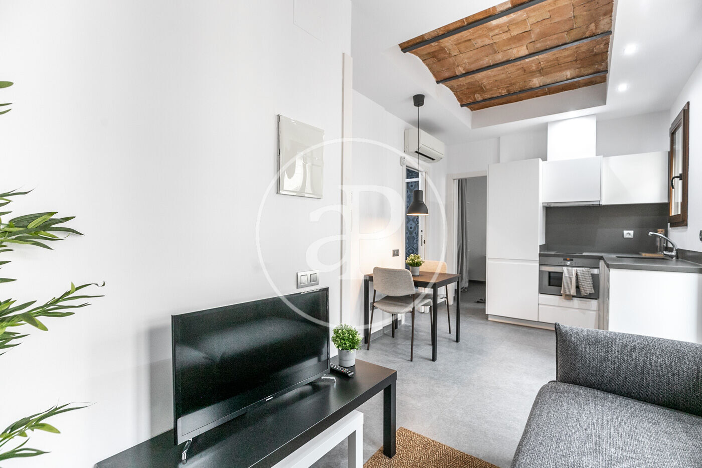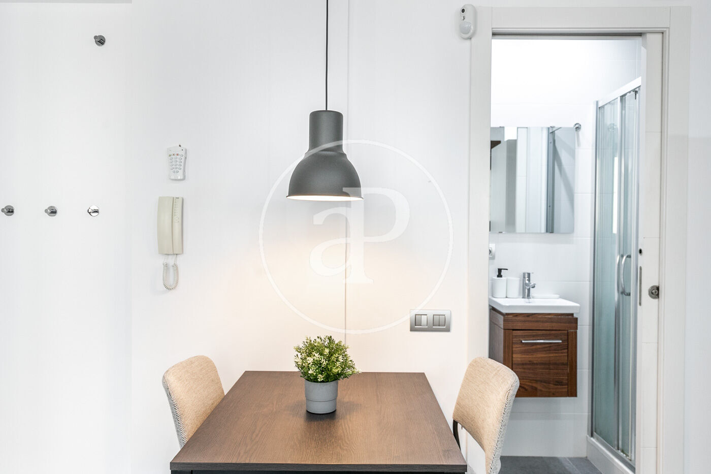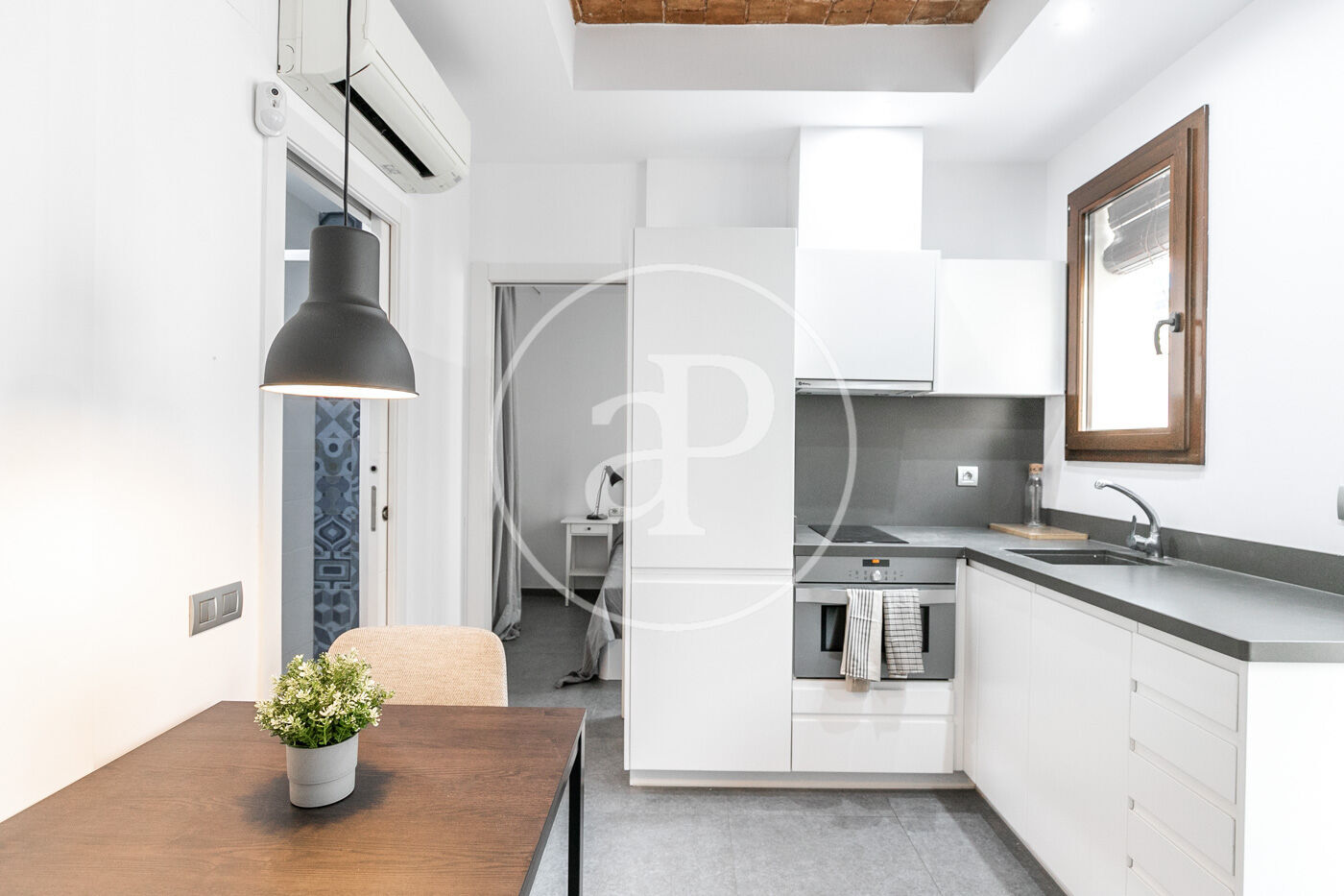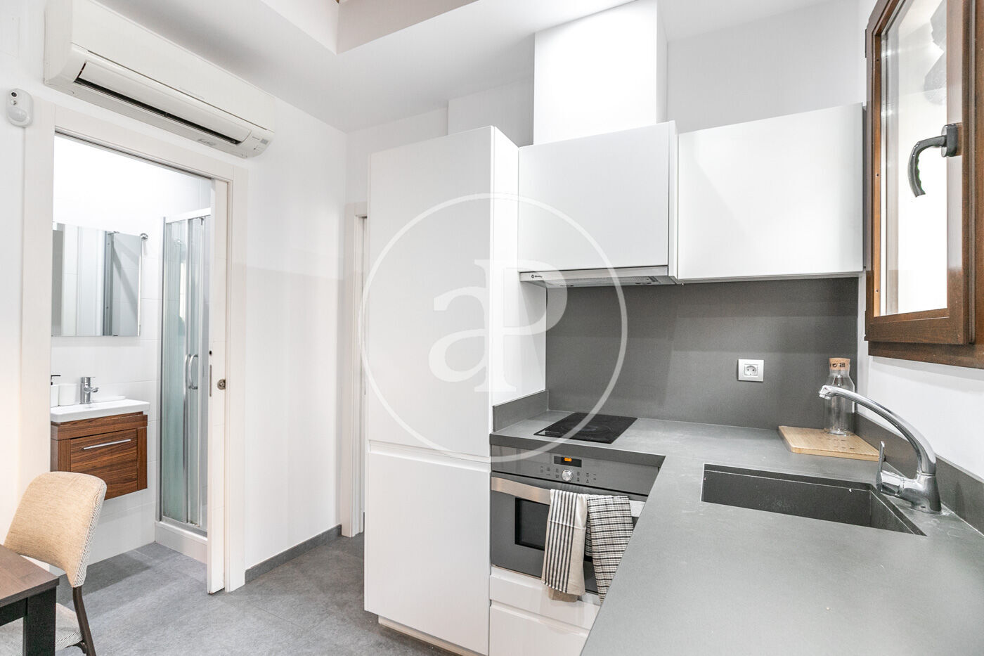 Aquesta propietat es distribueix en una sola planta de 32 m² útils. En entrar, trobem un acollidor saló-menjador amb cuina oberta. Tot el pis és exterior i té accés a un petit balcó. La cuina està completament equipada amb electrodomèstics i parament. El sostre de l’habitatge és de volta catalana.