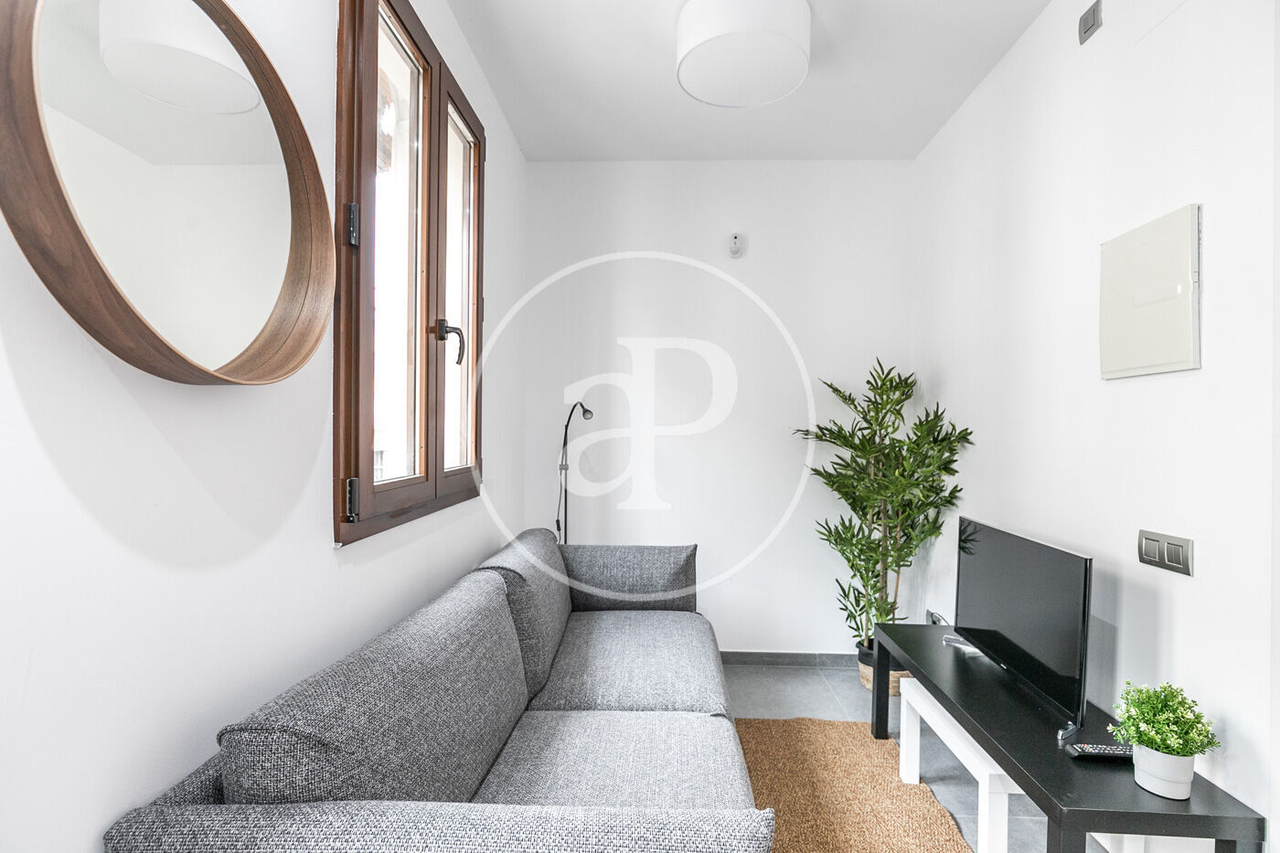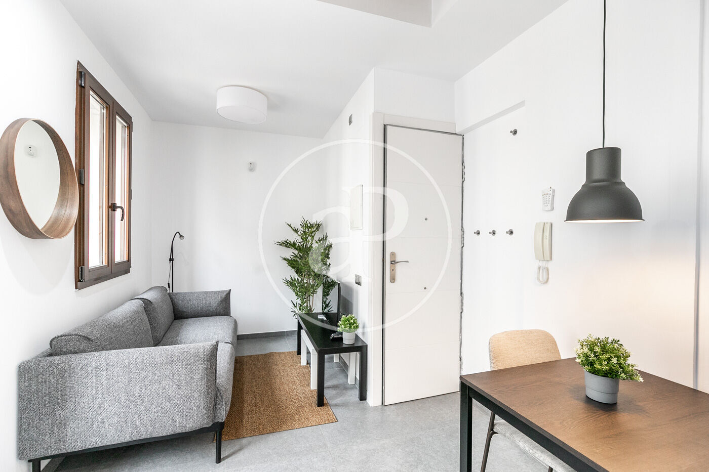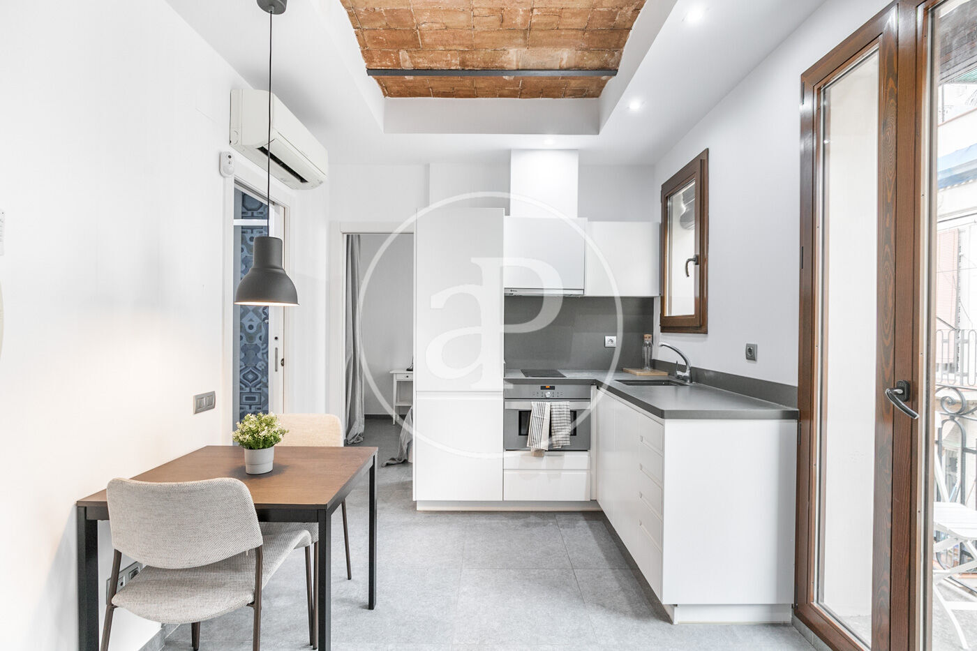 Aquesta propietat es distribueix en una sola planta de 32 m² útils. En entrar, trobem un acollidor saló-menjador amb cuina oberta. Tot el pis és exterior i té accés a un petit balcó. La cuina està completament equipada amb electrodomèstics i parament. El sostre de l’habitatge és de volta catalana.