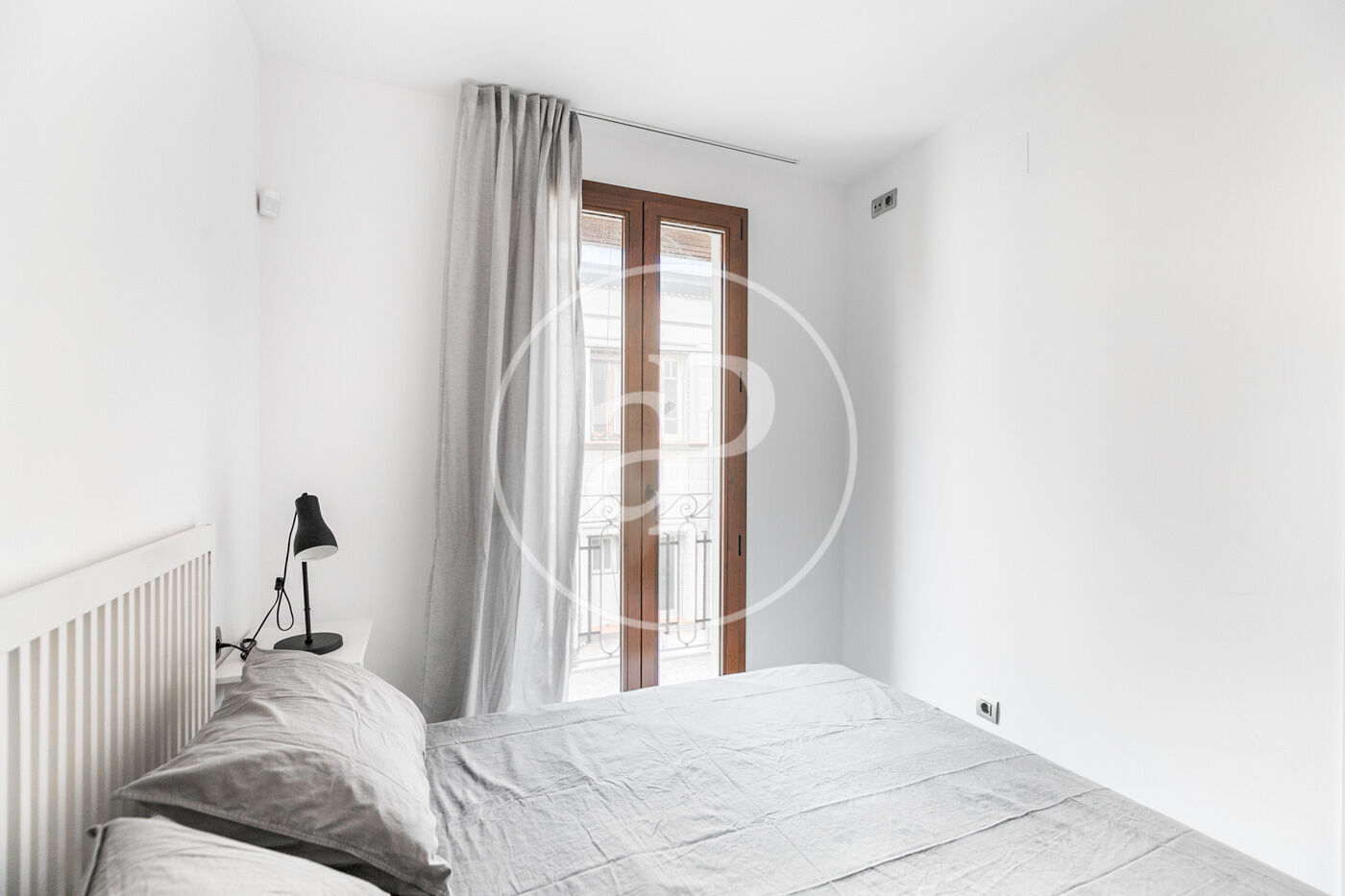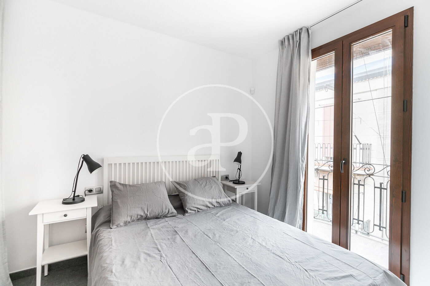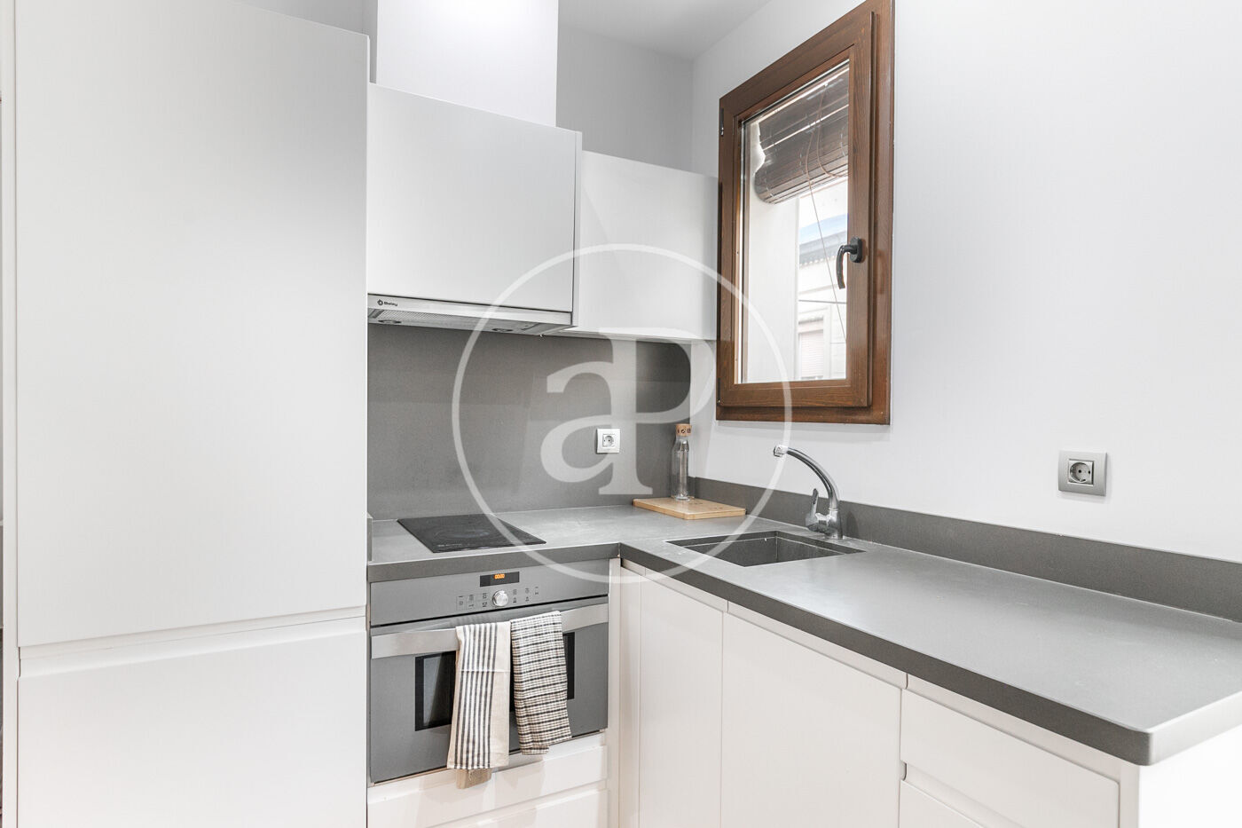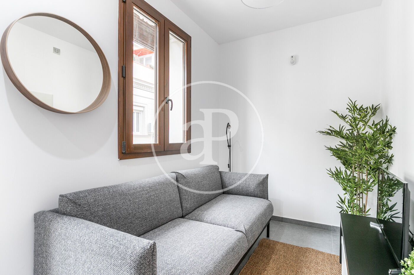 Aquesta propietat es distribueix en una sola planta de 32 m² útils. En entrar, trobem un acollidor saló-menjador amb cuina oberta. Tot el pis és exterior i té accés a un petit balcó. La cuina està completament equipada amb electrodomèstics i parament. El sostre de l’habitatge és de volta catalana.