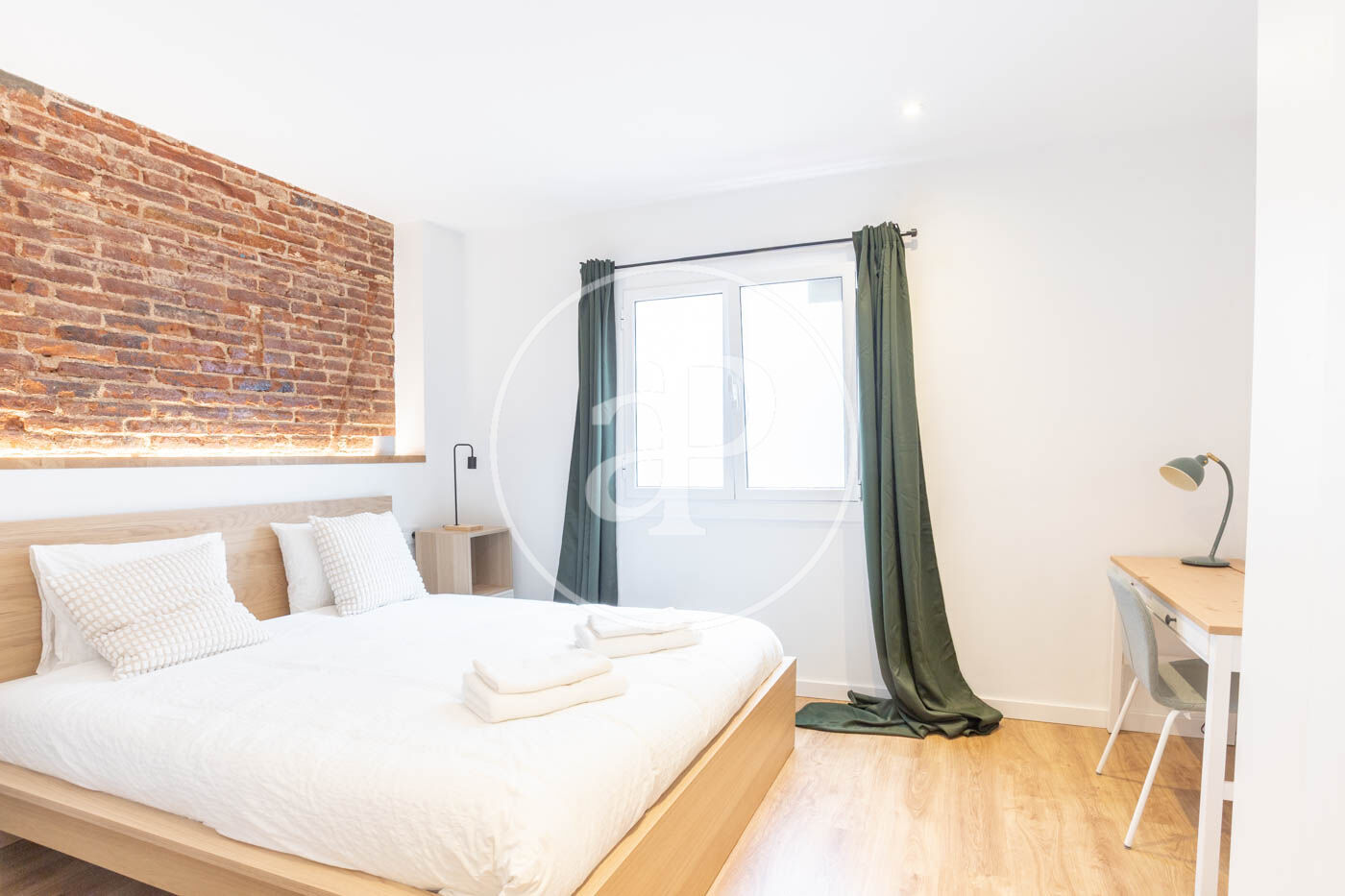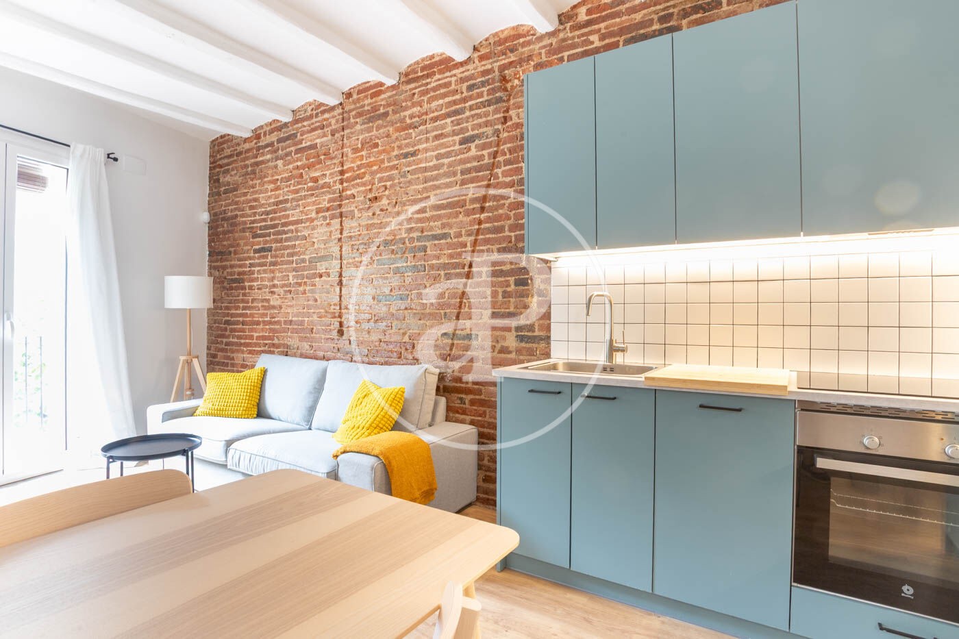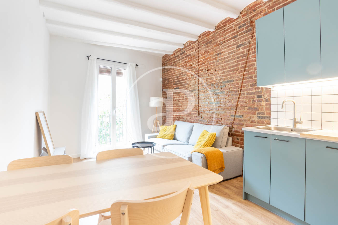 En la reforma realitzada s’han conservat detalls com parets amb obra vista i bigues antigues. A més, s’han fet servir colors originals molt en sintonia amb l’estil autèntic del pis.