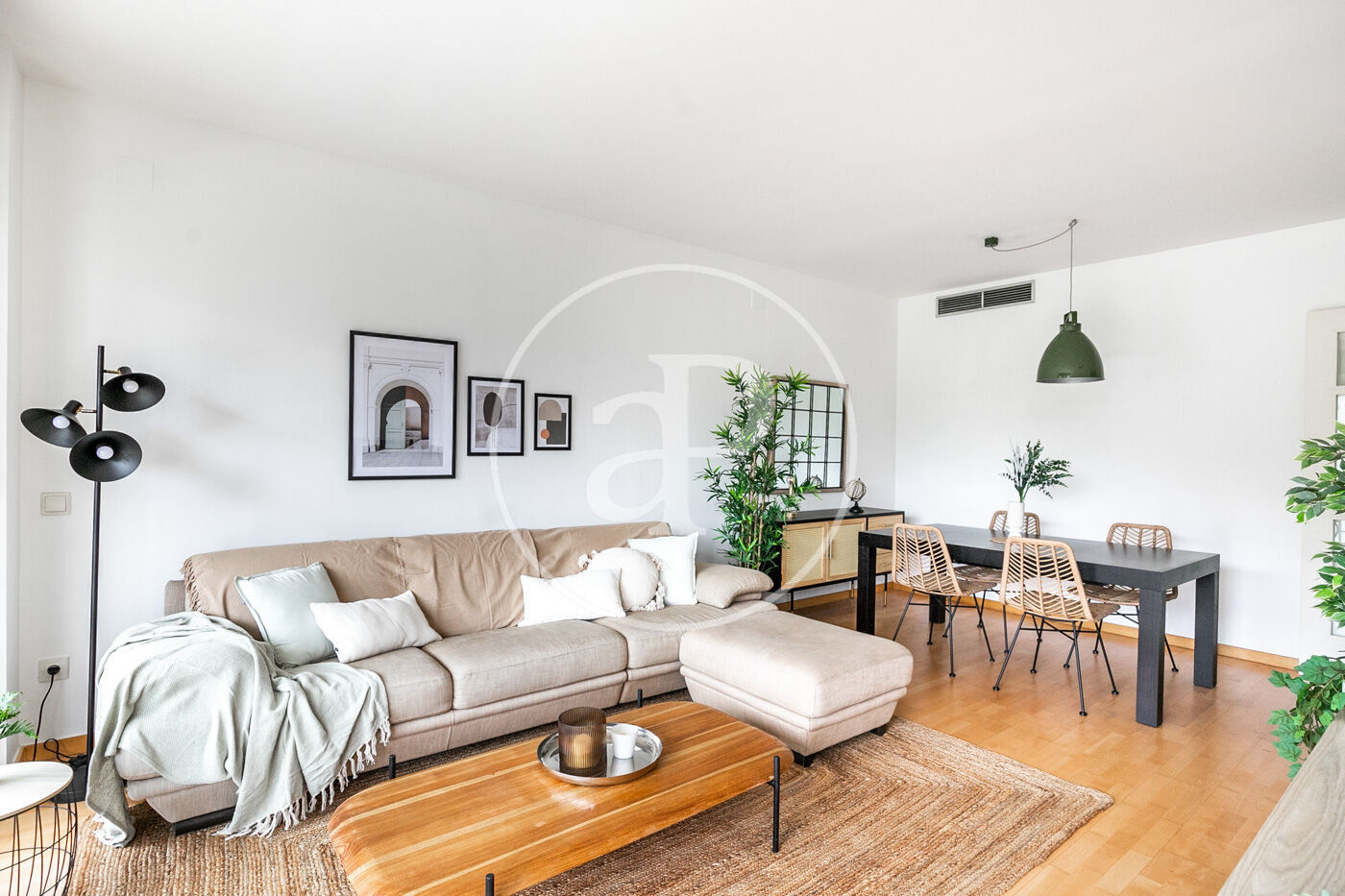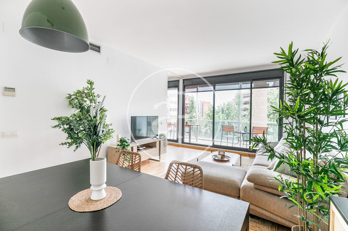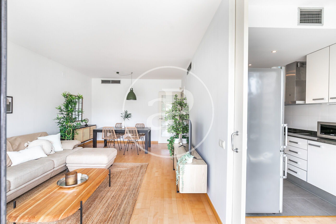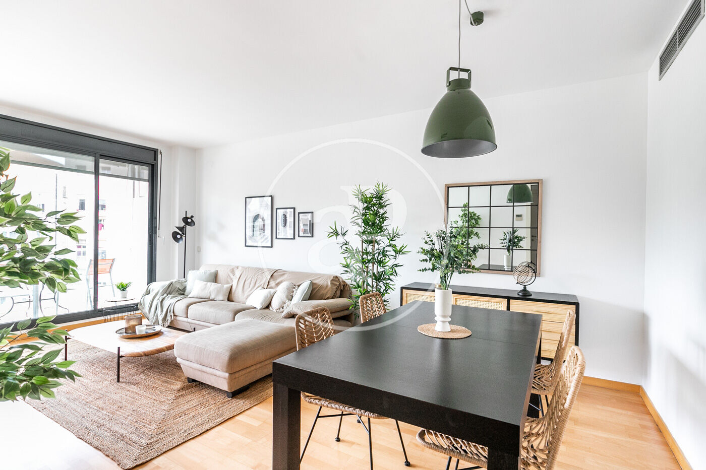 El saló menjador lluminós et rep i dóna la benvinguda a aquest preciós i molt ben dissenyat pis. Els detalls de fusta dels mobles ens donen la sensació d'un espai íntim i molt acollidor. Els finestrals ubicats de paret a paret, omplen l'espai de molta lluminositat i permeten l'accés cap a la terrassa amb vista als Jardins de Margarida Comas.