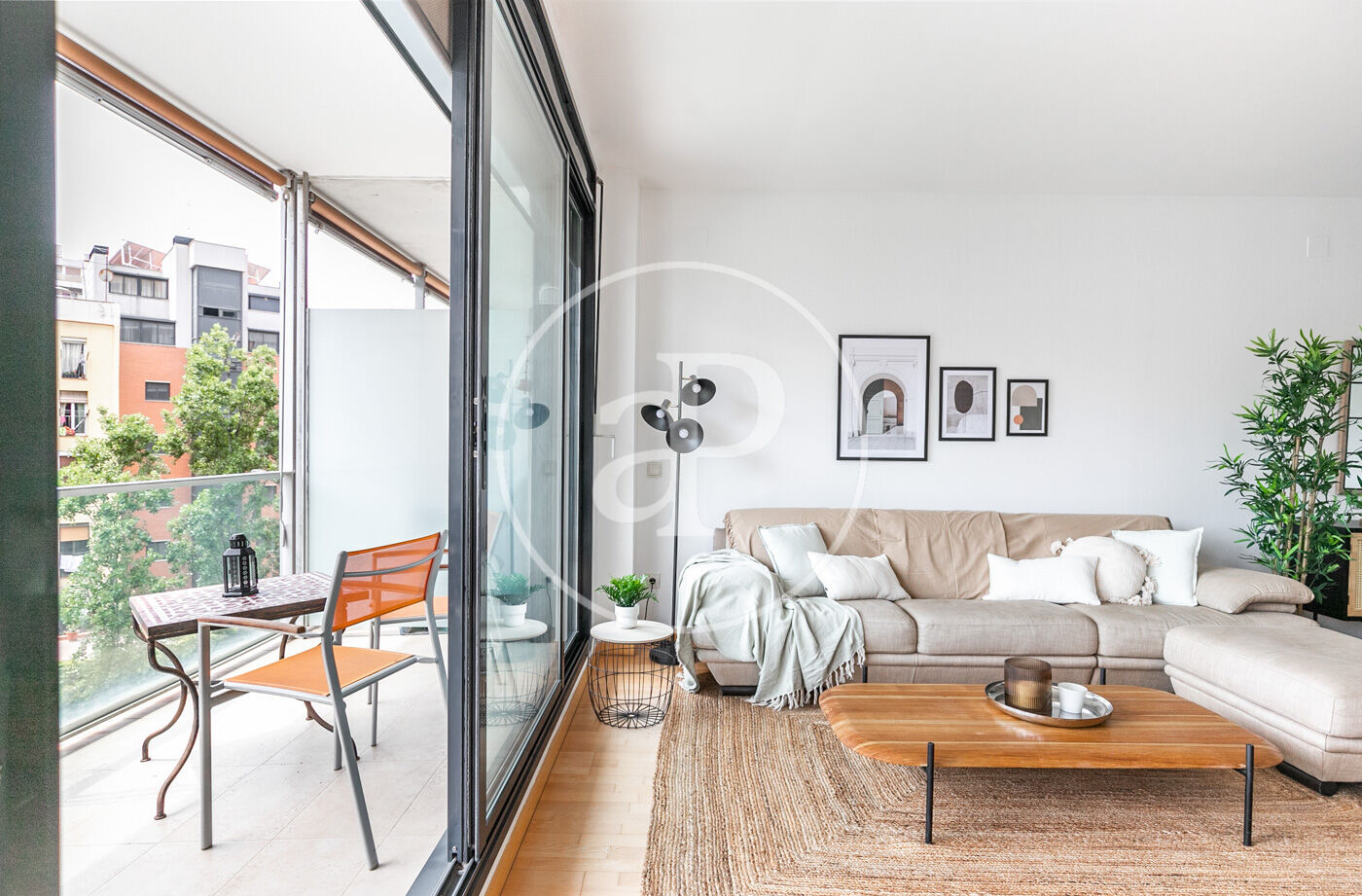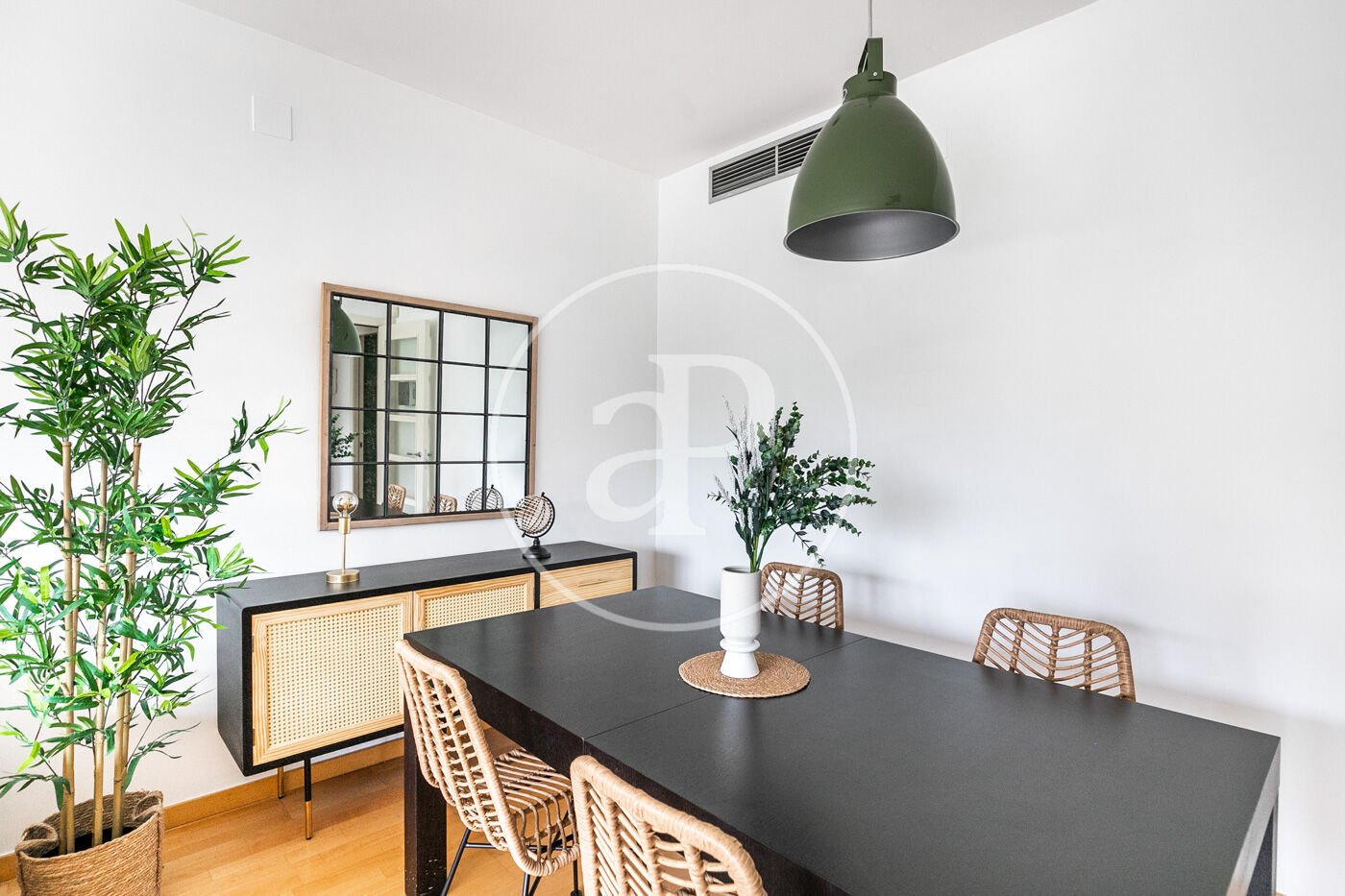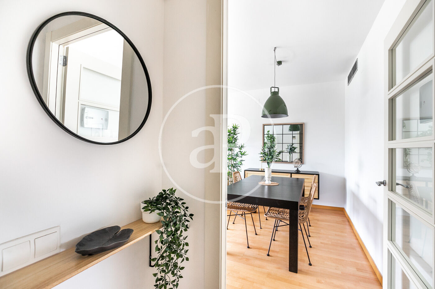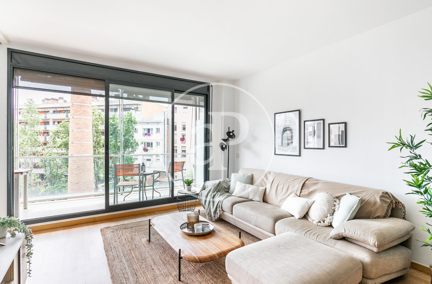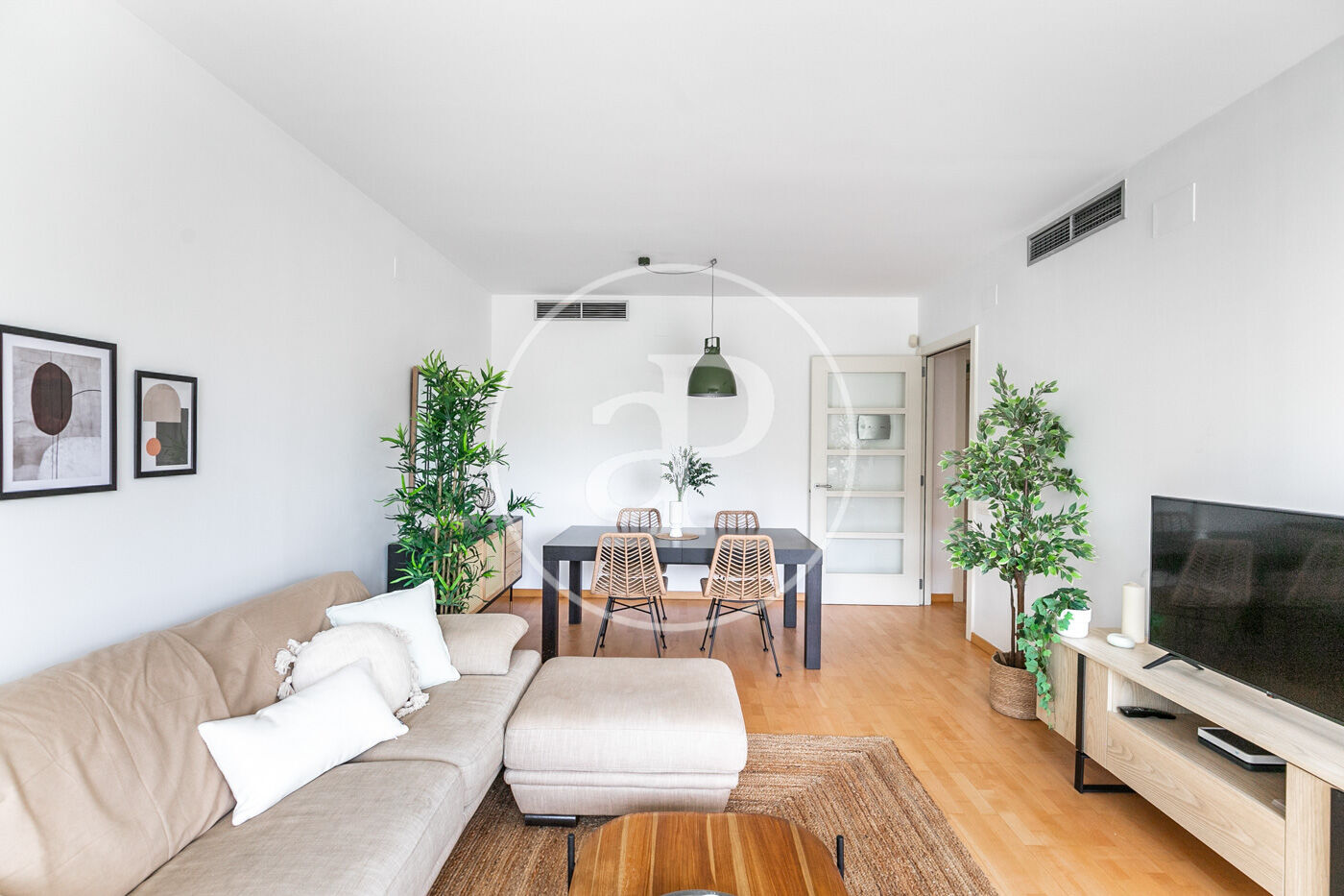 El saló menjador lluminós et rep i dóna la benvinguda a aquest preciós i molt ben dissenyat pis. Els detalls de fusta dels mobles ens donen la sensació d'un espai íntim i molt acollidor. Els finestrals ubicats de paret a paret, omplen l'espai de molta lluminositat i permeten l'accés cap a la terrassa amb vista als Jardins de Margarida Comas.