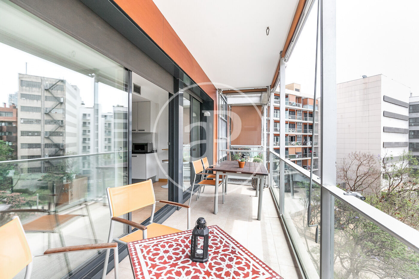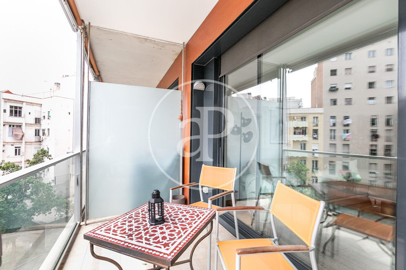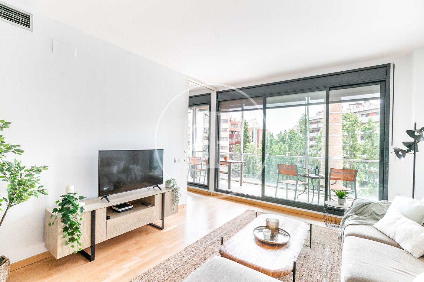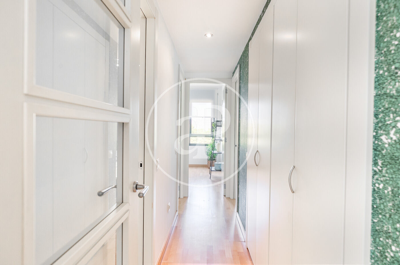 El saló menjador lluminós et rep i dóna la benvinguda a aquest preciós i molt ben dissenyat pis. Els detalls de fusta dels mobles ens donen la sensació d'un espai íntim i molt acollidor. Els finestrals ubicats de paret a paret, omplen l'espai de molta lluminositat i permeten l'accés cap a la terrassa amb vista als Jardins de Margarida Comas.
