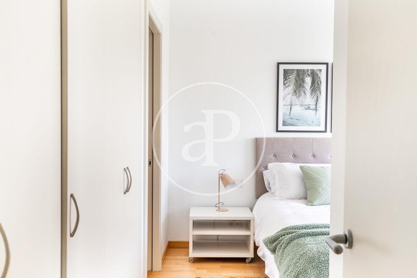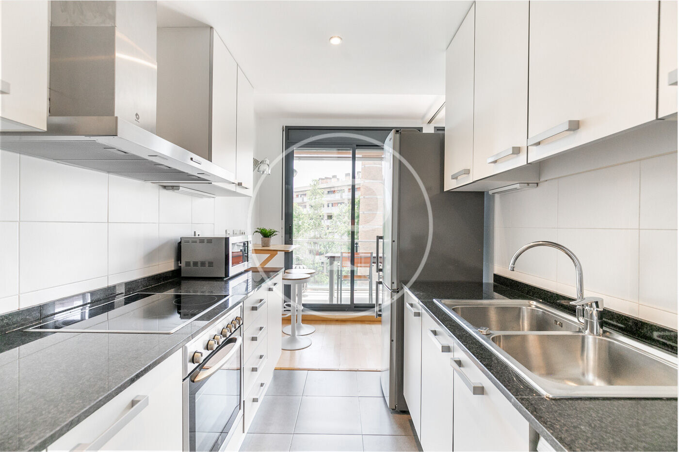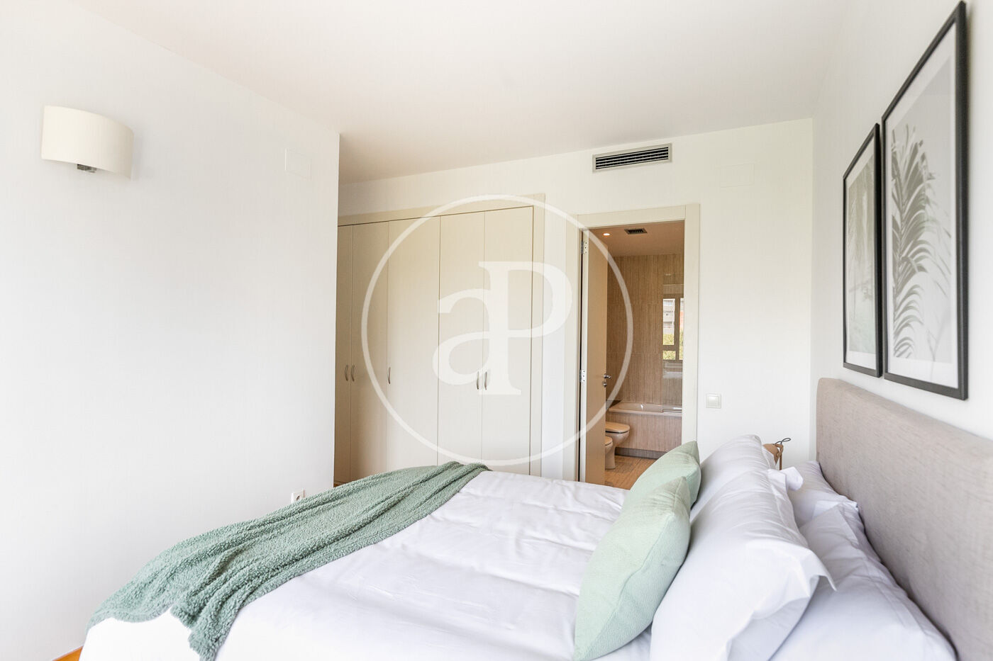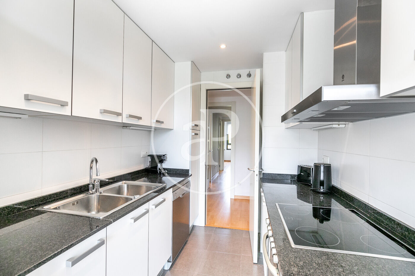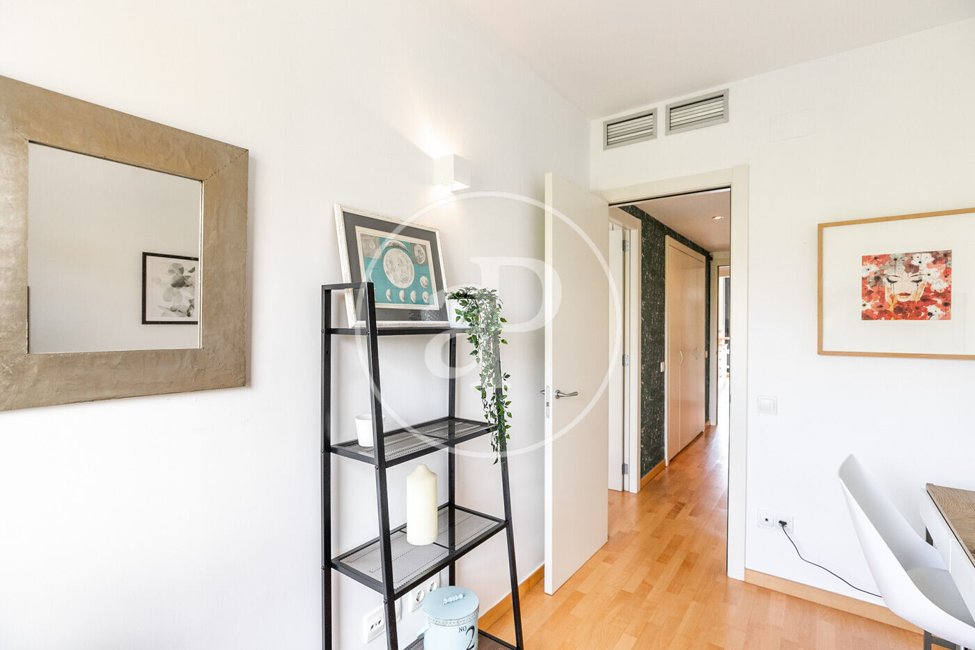 El saló menjador lluminós et rep i dóna la benvinguda a aquest preciós i molt ben dissenyat pis. Els detalls de fusta dels mobles ens donen la sensació d'un espai íntim i molt acollidor. Els finestrals ubicats de paret a paret, omplen l'espai de molta lluminositat i permeten l'accés cap a la terrassa amb vista als Jardins de Margarida Comas.