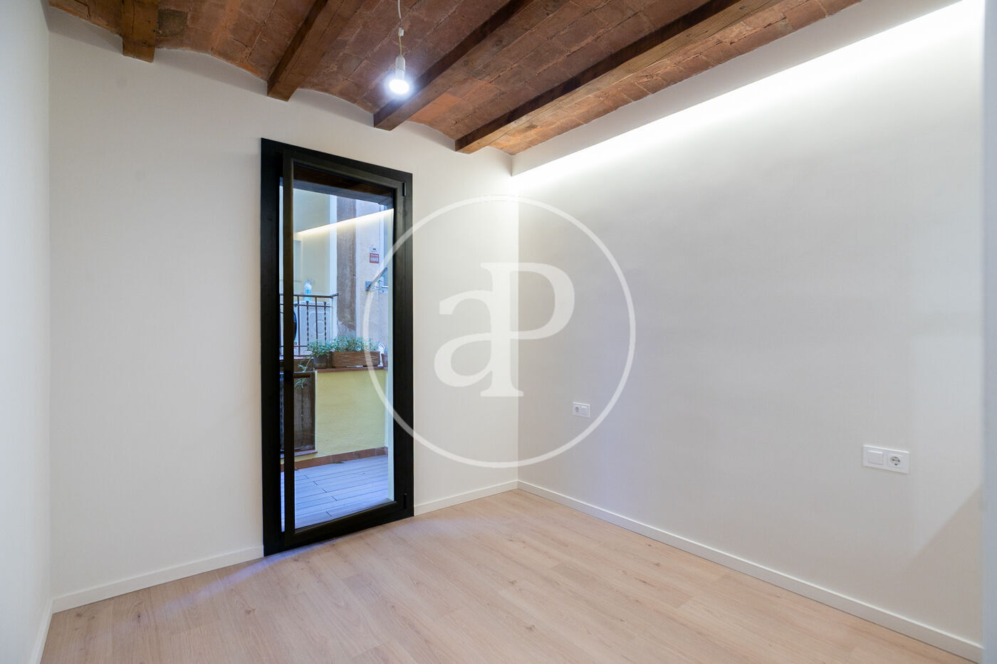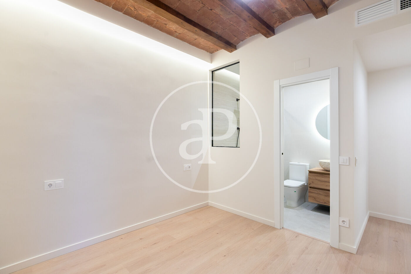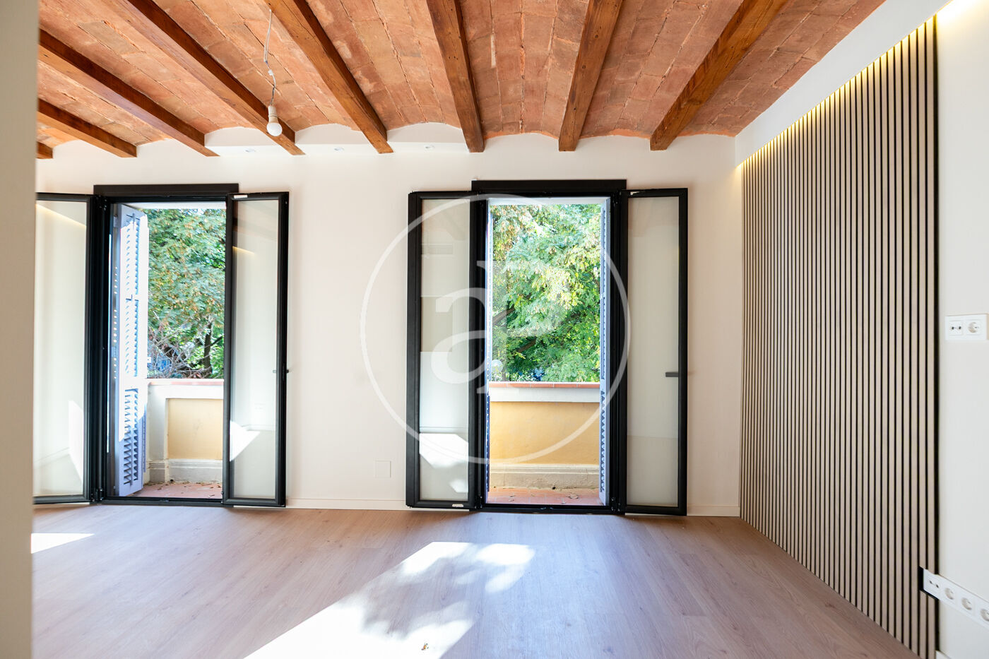 El pis ha estat completament reformat amb materials i acabats d’alta qualitat, cuidant cada detall. El seu disseny modern i funcional s’integra harmoniosament amb el caràcter original de l’habitatge, destacant els sostres alts amb volta catalana. Té una superfície de 71 m², a més d’una agradable terrassa interior d’aproximadament 15 m².
