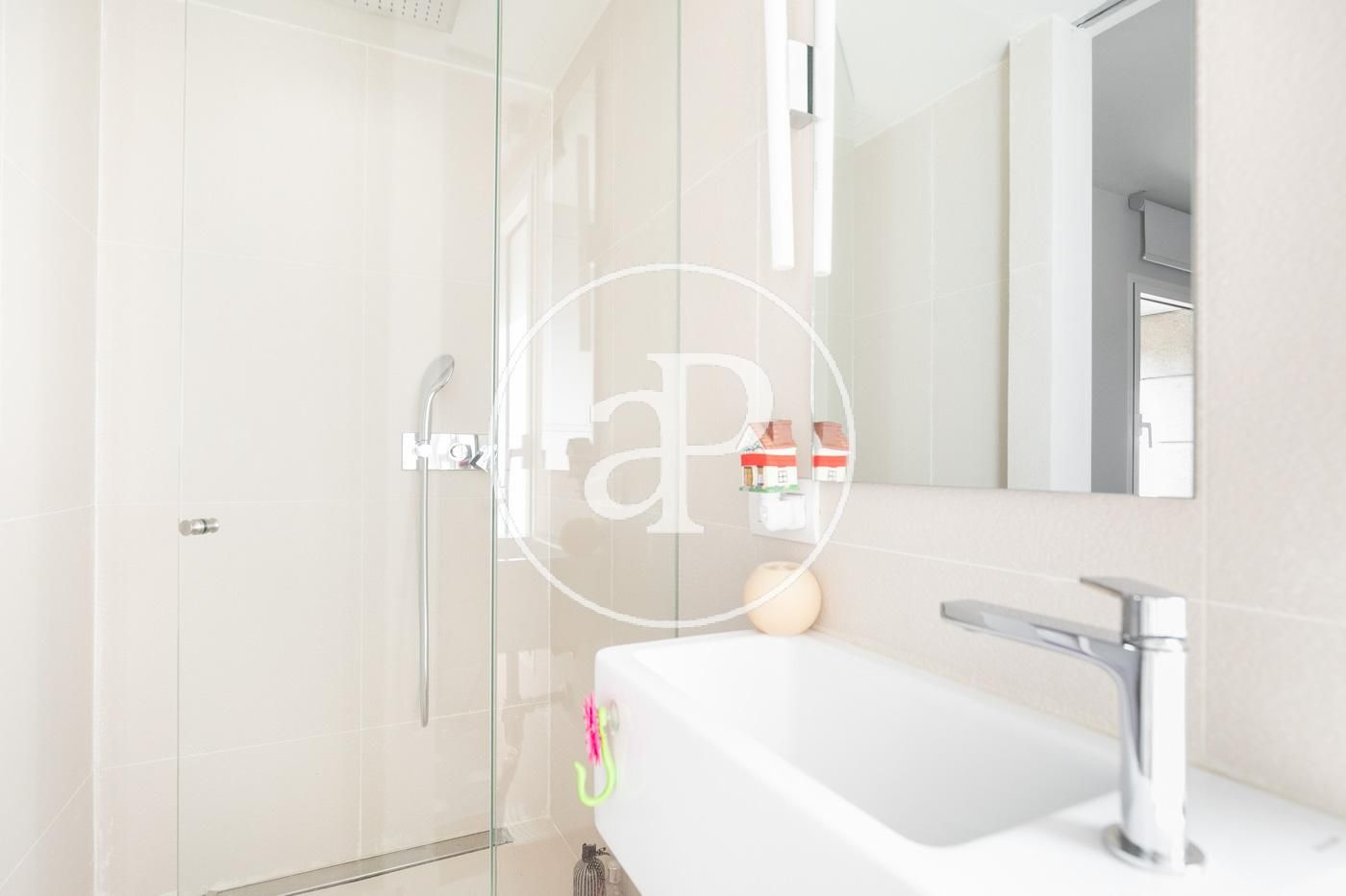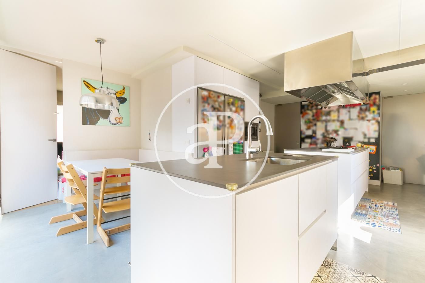 A la cobejada zona de La Misió, molt a prop de les Rambles, trobem aquest àtic de 145 m² que combina amplitud, llum natural i un disseny modern amb tocs càlids. Disposa d’una terrassa de 10 m² amb vistes obertes, perfecta per gaudir del clima mediterrani. El saló-menjador, ampli i lluminós amb sortida directa a la terrassa, destaca pel seu estil contemporani i acollidor, amb una cuidada selecció de mobles i detalls decoratius que aporten personalitat: sofàs en tons blaus, taula de centre en fusta natural i peces úniques que creen un ambient elegant i relaxat. La il·luminació també juga un paper clau, amb làmpades de disseny que aporten calidesa i caràcter. La cuina oberta és minimalista i funcional, amb mobles blancs, electrodomèstics integrats i una illa central en fusta que afegeix contrast i sofisticació. És un espai pensat per gaudir tant del dia a dia com de trobades informals. Les habitacions mantenen la mateixa línia estètica: la principal amb bany en suite amb banyera i armaris encastats, combina tons neutres amb una paret en gris fosc que aporta profunditat, mentre que la segona habitació ofereix un ambient versàtil, ideal com a dormitori o despatx, amb detalls en fibres naturals i tèxtils colorits. Disposa d’un altre bany complet amb plat de dutxa. Els sòls de parquet fosc, les finestres de gran format i la il·luminació acurada reforcen la sensació de confort i estil a tot l’àtic. Té aire condicionat per splits i calefacció a gas. Inclou plaça d’aparcament i traster, i es lloga completament moblat i equipat. A més, les despeses d’aigua, comunitat i IBI estan incloses en el preu, cosa que el converteix en una opció còmoda i sense sorpreses. Mascotes a consultar. T’imagines vivint aquí? Esperem la teva trucada.
