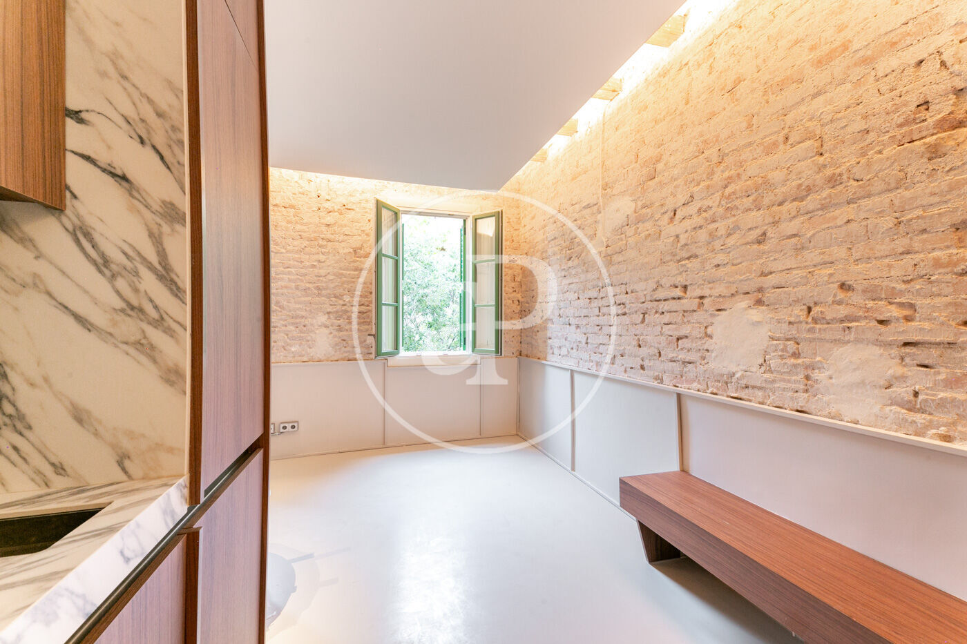 Paviments continus, emmarcats de marbre, revestiment ceràmic artesanal, encimera Porcelanosa, aixetes encastades, dutxa efecte pluja i armaris a mida.