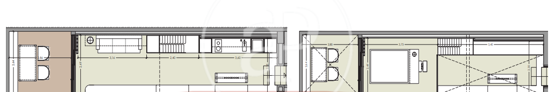 Amb una alçada de 6 metres i finestrals panoràmics a un pati de 9 m², la superfície de 67 m² d’aquest habitatge es distribueix en dues plantes. A la planta baixa hi trobem un espai obert, en comunicació directa amb el pati, on es troben la cuina i el bany integrats a la paret longitudinal. A la planta superior, amb vistes a les dobles alçades del pati i de la sala, es troba l’habitació doble.