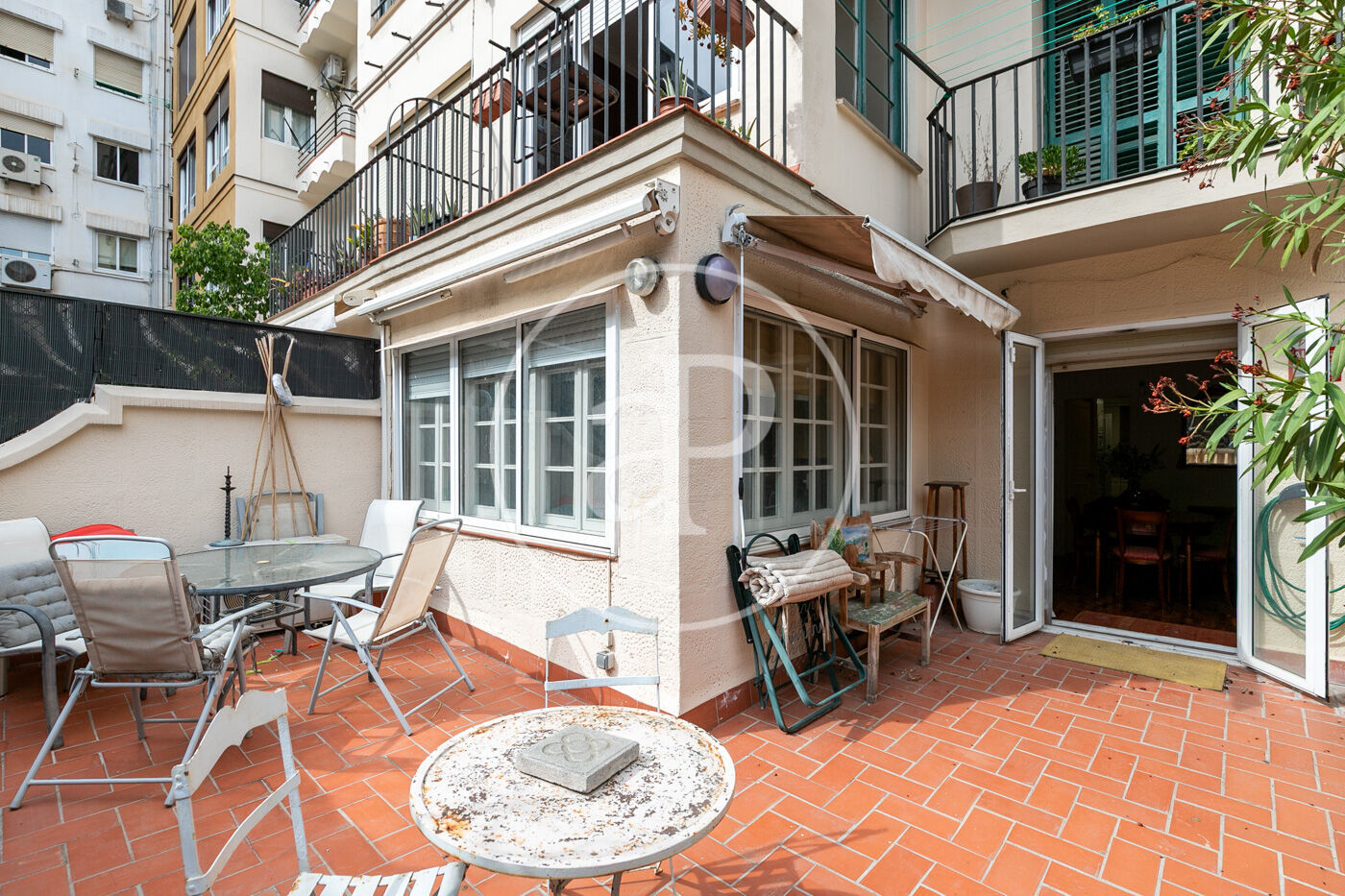 Àmplia terrassa tipus pati interior, envoltada de vegetació i amb espai per a sofàs i taules. Ofereix un ambient fresc i natural, ideal per relaxar-se o gaudir amb convidats a l’aire lliure.