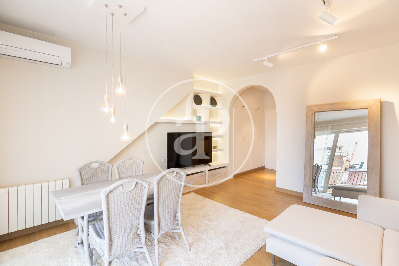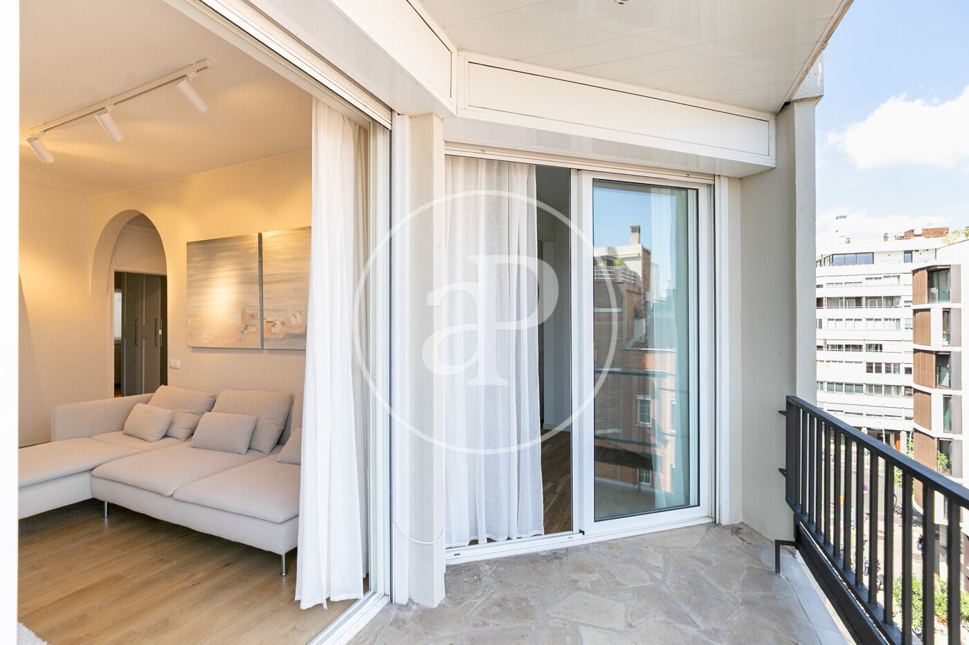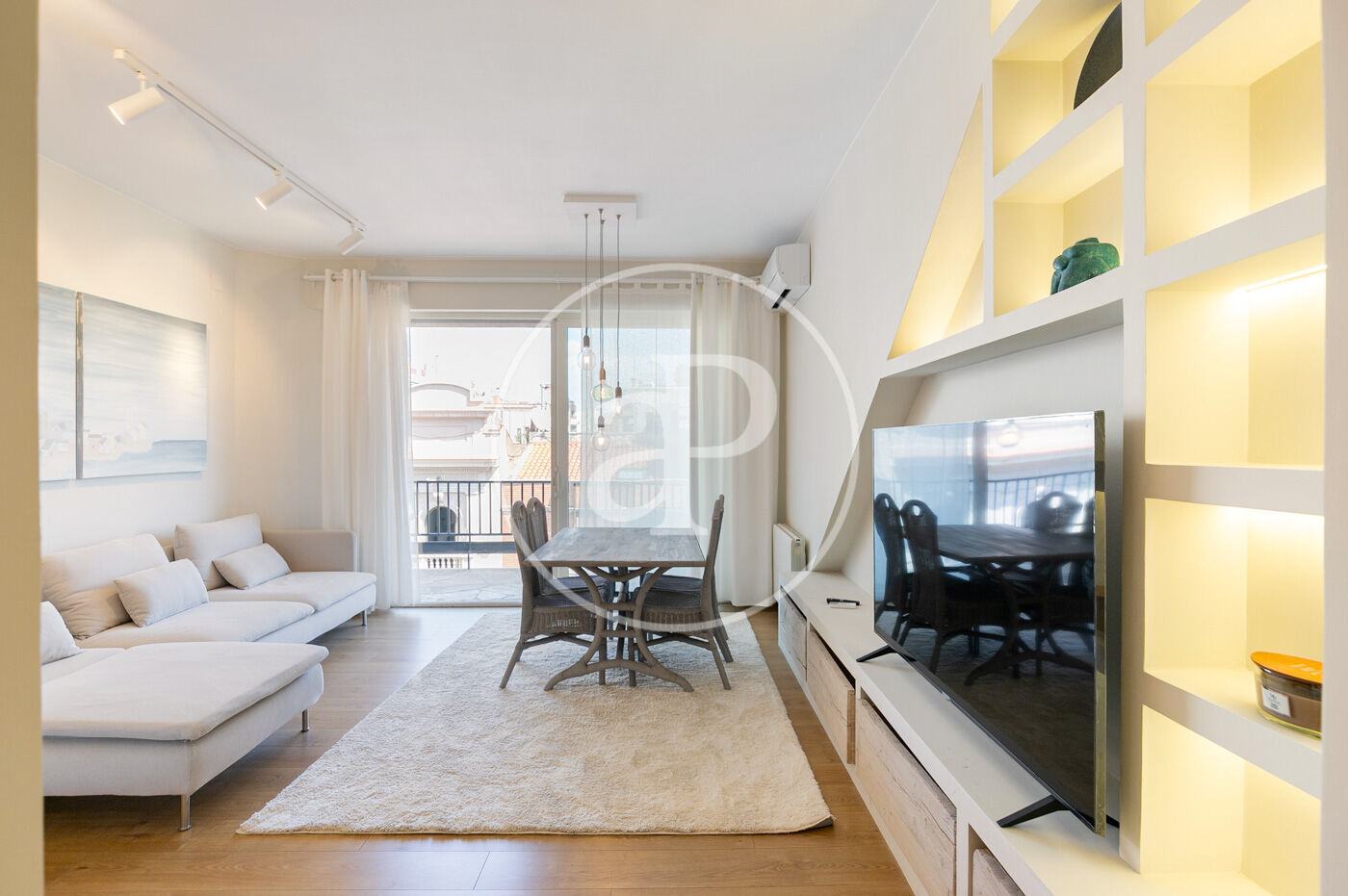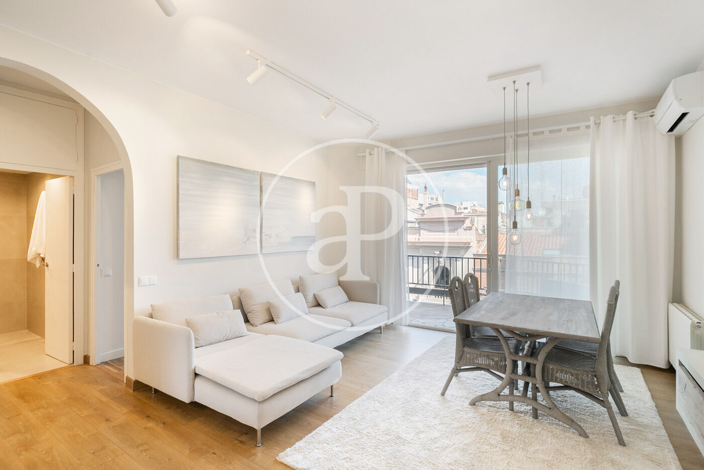 L’habitatge ha estat íntegrament reformat i es presenta llest per estrenar, amb una distribució pràctica i molt lluminosa. En accedir-hi, ens rep la zona de dia, composta per un ampli saló-menjador amb sortida directa a la terrassa, amb vistes clares al carrer Muntaner. Un espai obert i ple de llum natural, ideal per gaudir en família o amb amics.