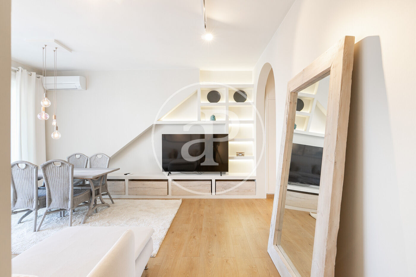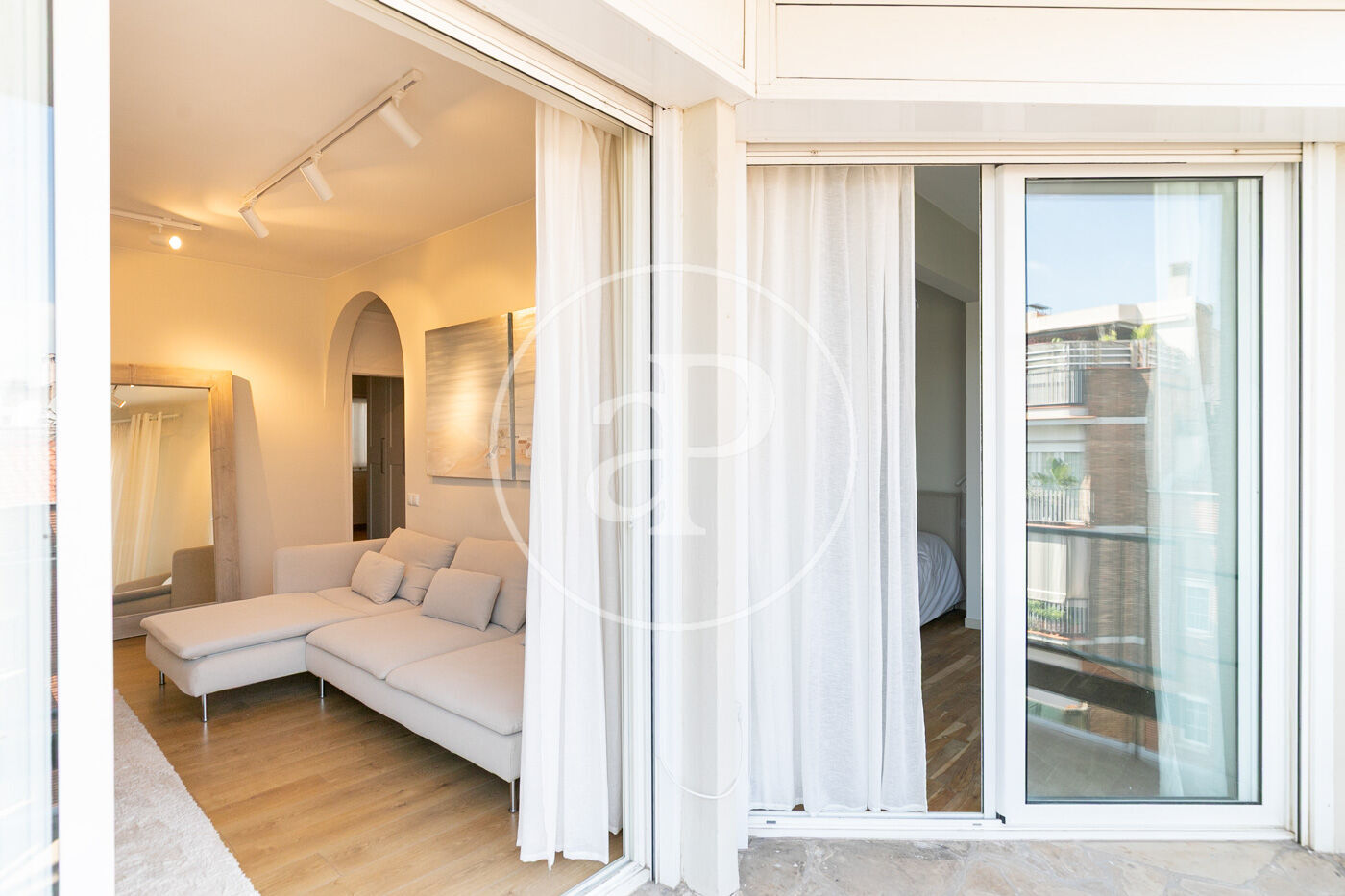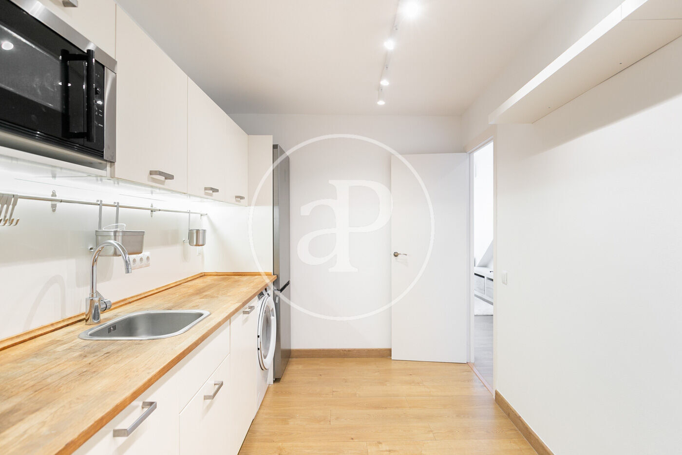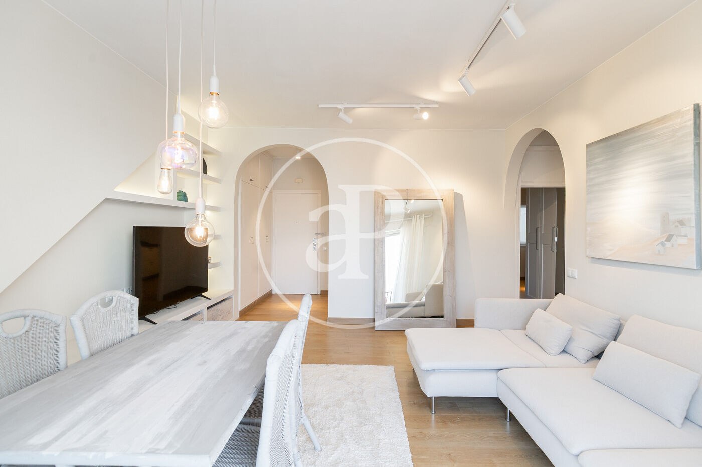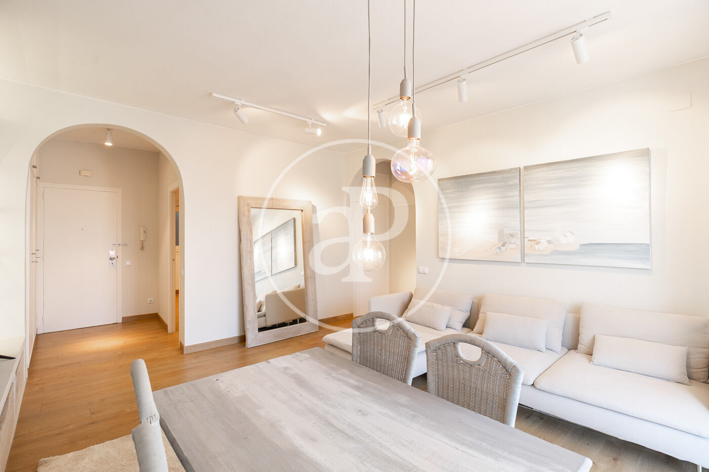 L’habitatge ha estat íntegrament reformat i es presenta llest per estrenar, amb una distribució pràctica i molt lluminosa. En accedir-hi, ens rep la zona de dia, composta per un ampli saló-menjador amb sortida directa a la terrassa, amb vistes clares al carrer Muntaner. Un espai obert i ple de llum natural, ideal per gaudir en família o amb amics.
