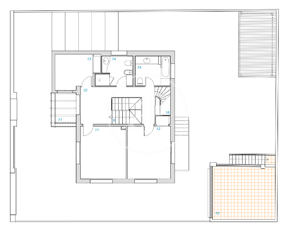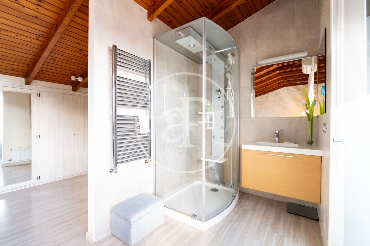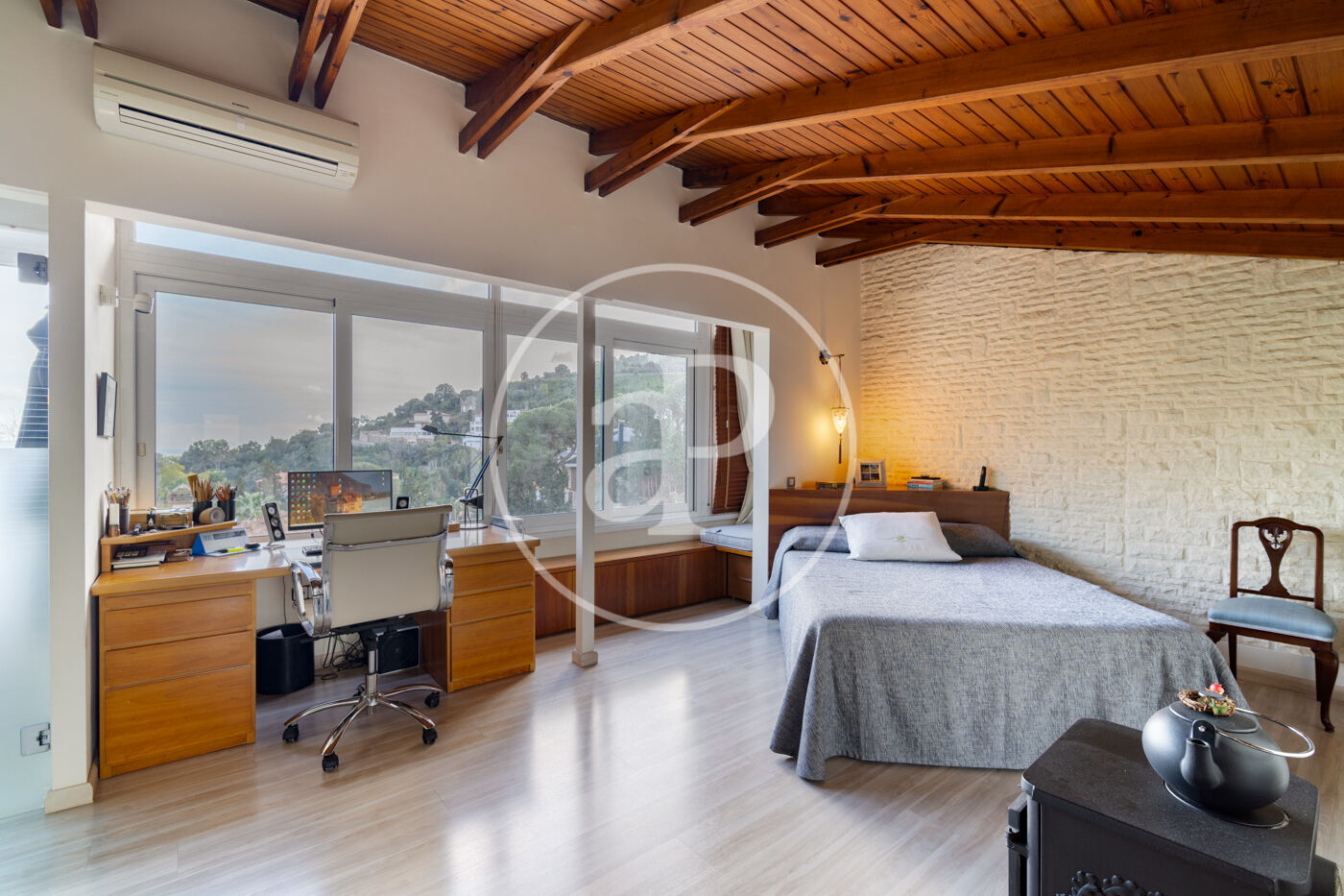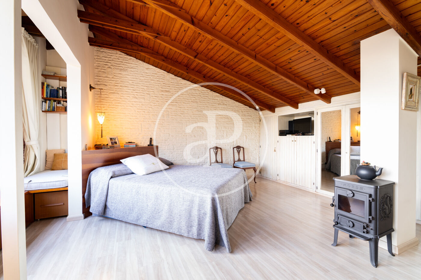 La segona planta està dedicada a una espectacular suite d’aproximadament 47 m². Un espai íntim i lluminós, amb bany integrat (possibilitat d’independitzar-lo), hammam, xemeneia, amplis armaris encastats i vistes obertes que reforcen la sensació de calma i amplitud.