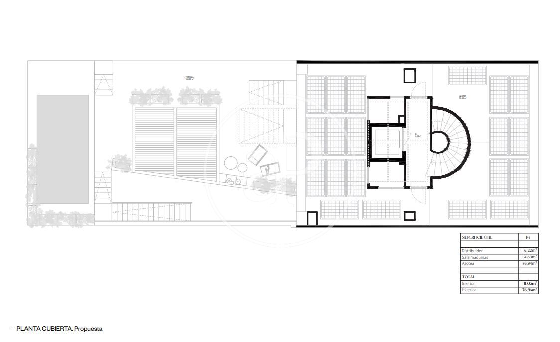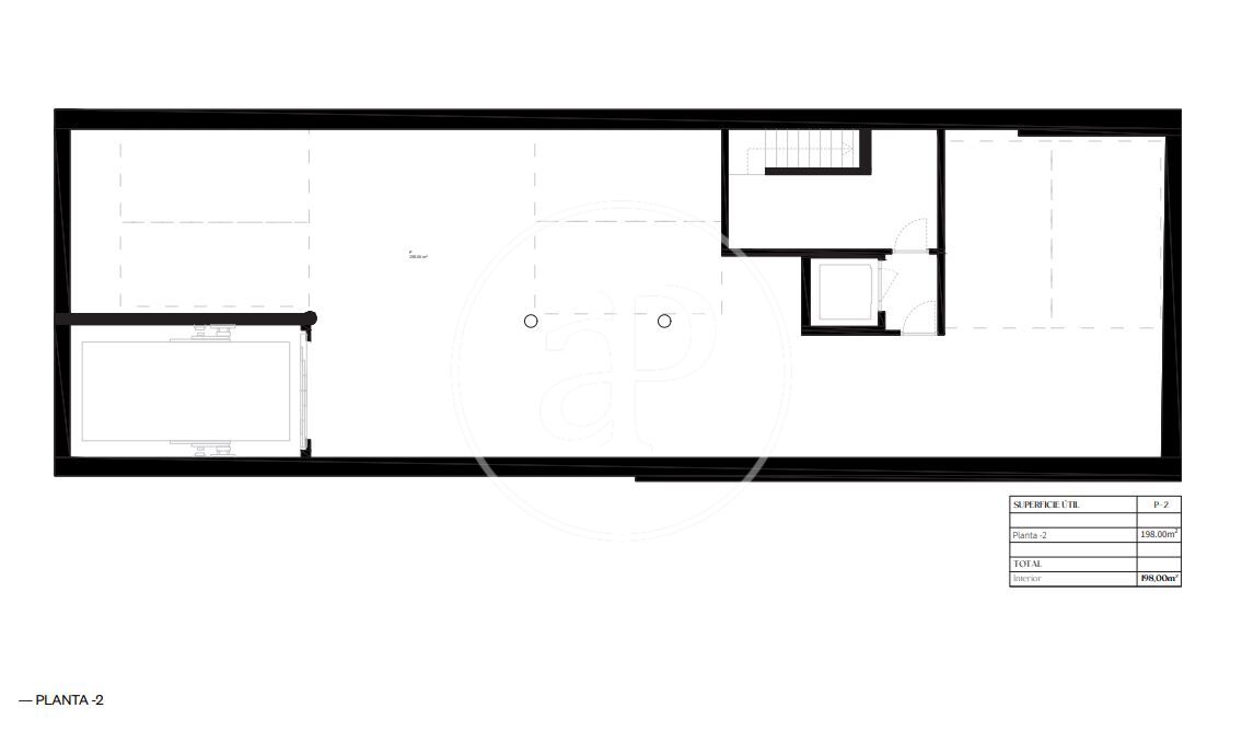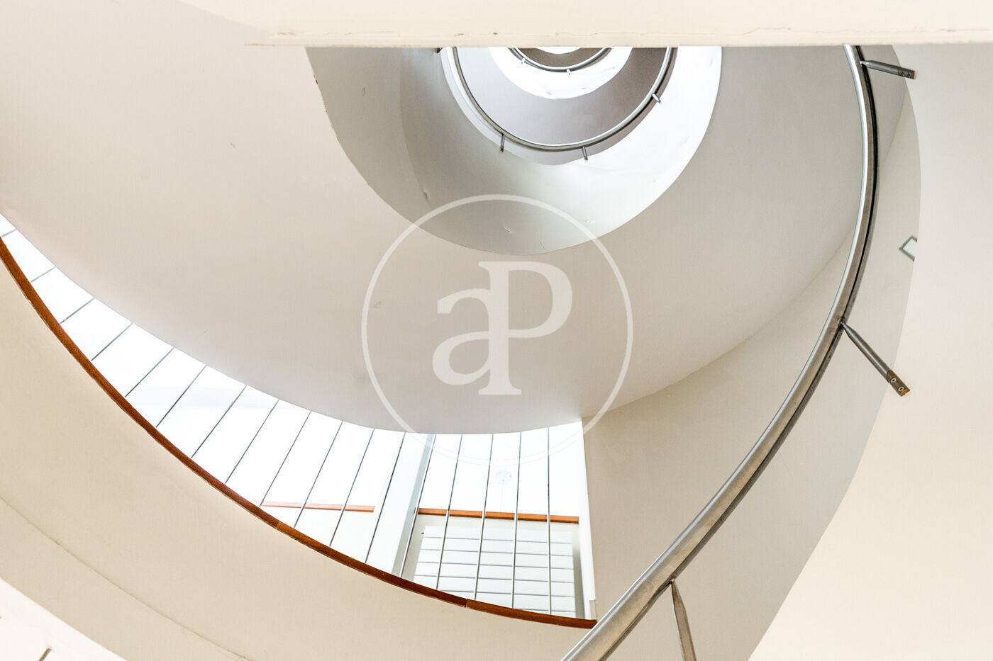 Aquesta distribuïda en sis plantes amb ascensor, dos d'elles estan destinades a aparcament amb una capacitat per a 10 cotxes, quatre motos, amplis trasters i zona d'aigües d'uns 50 m².