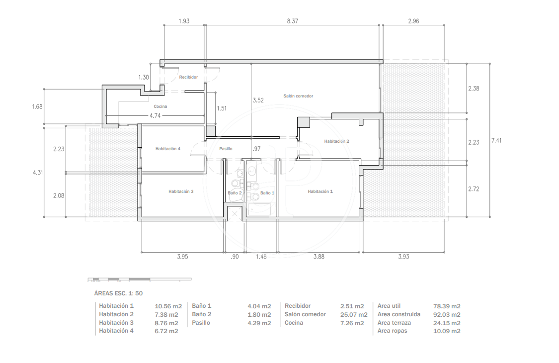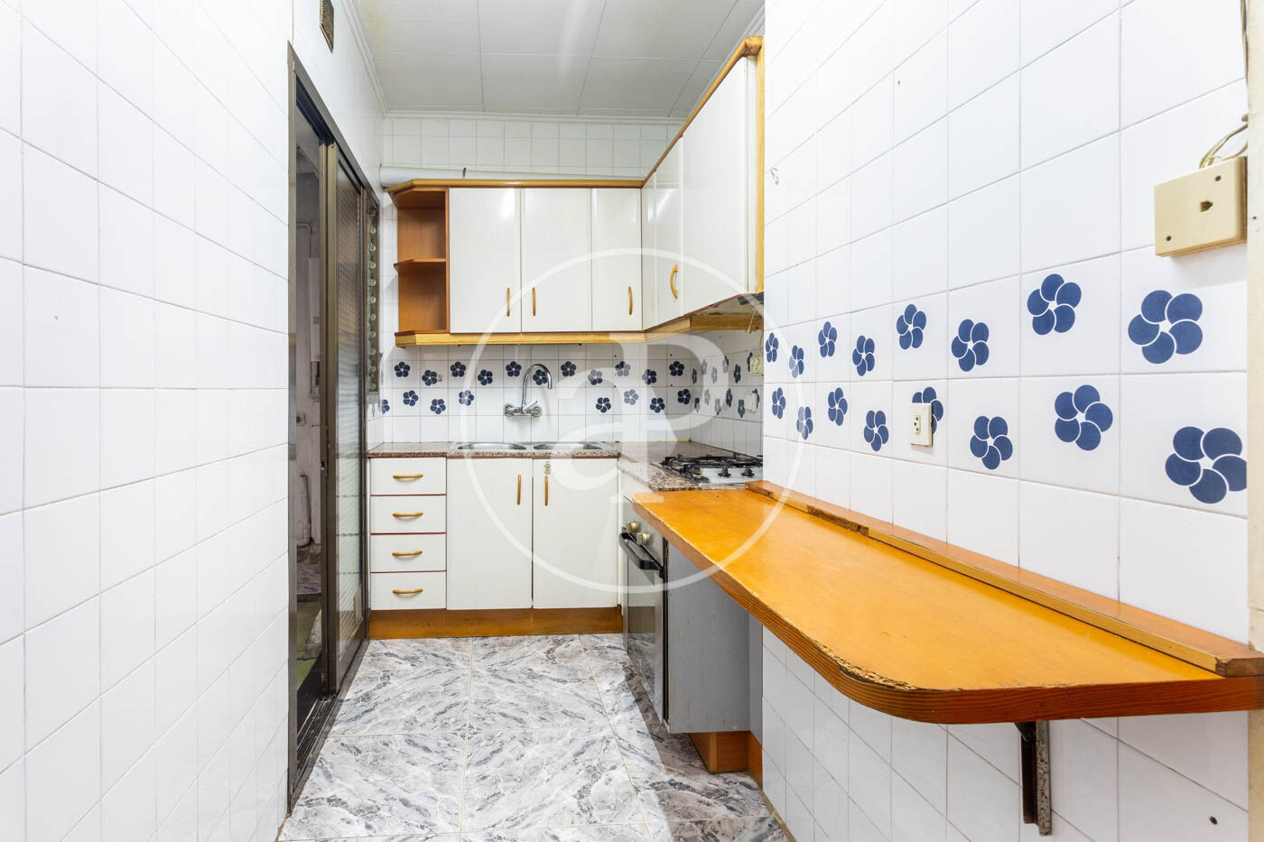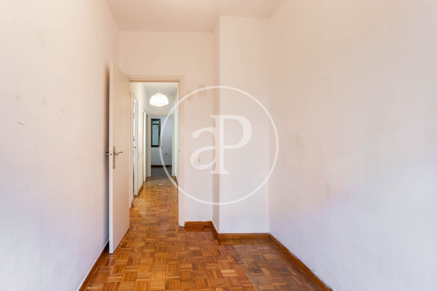La seva distribució actual es compon d'un rebedor, cuina independent amb sortida a pati interior i zona d'aigües de 10 m2, saló menjador amb sortida a la gran terrassa exterior a pati de poma de 24 m², dos dormitoris exteriors, un bany complet amb banyera, un lavabo amb dutxa, dos dormitoris interiors a pati d'edifici. Té moltes possibilitats de reforma i distribució gràcies a la seva construcció per pilars.