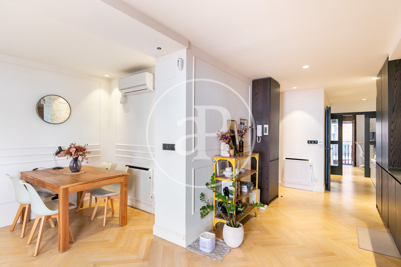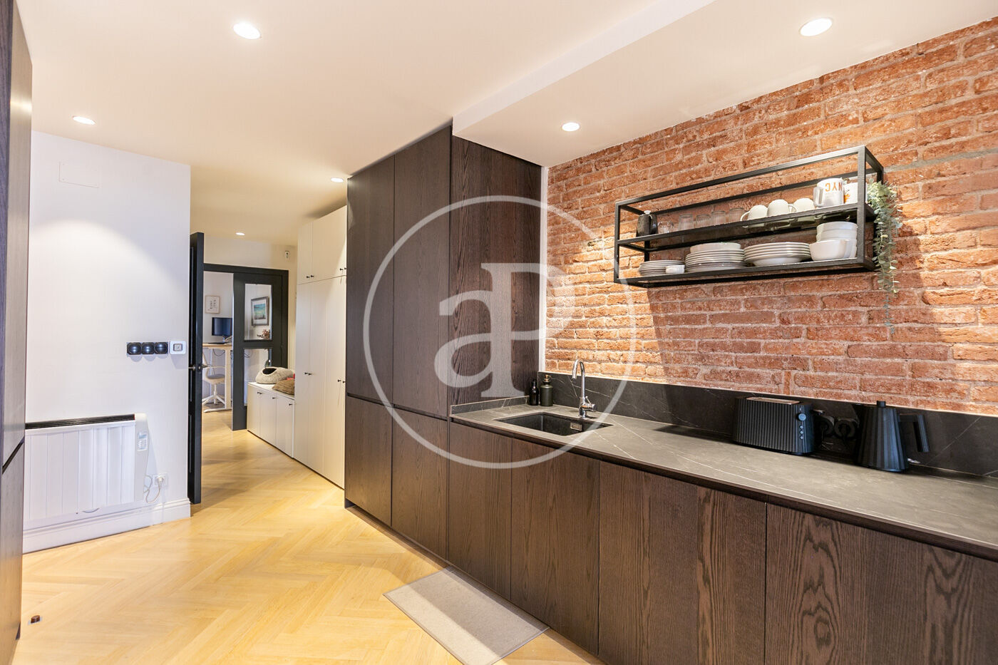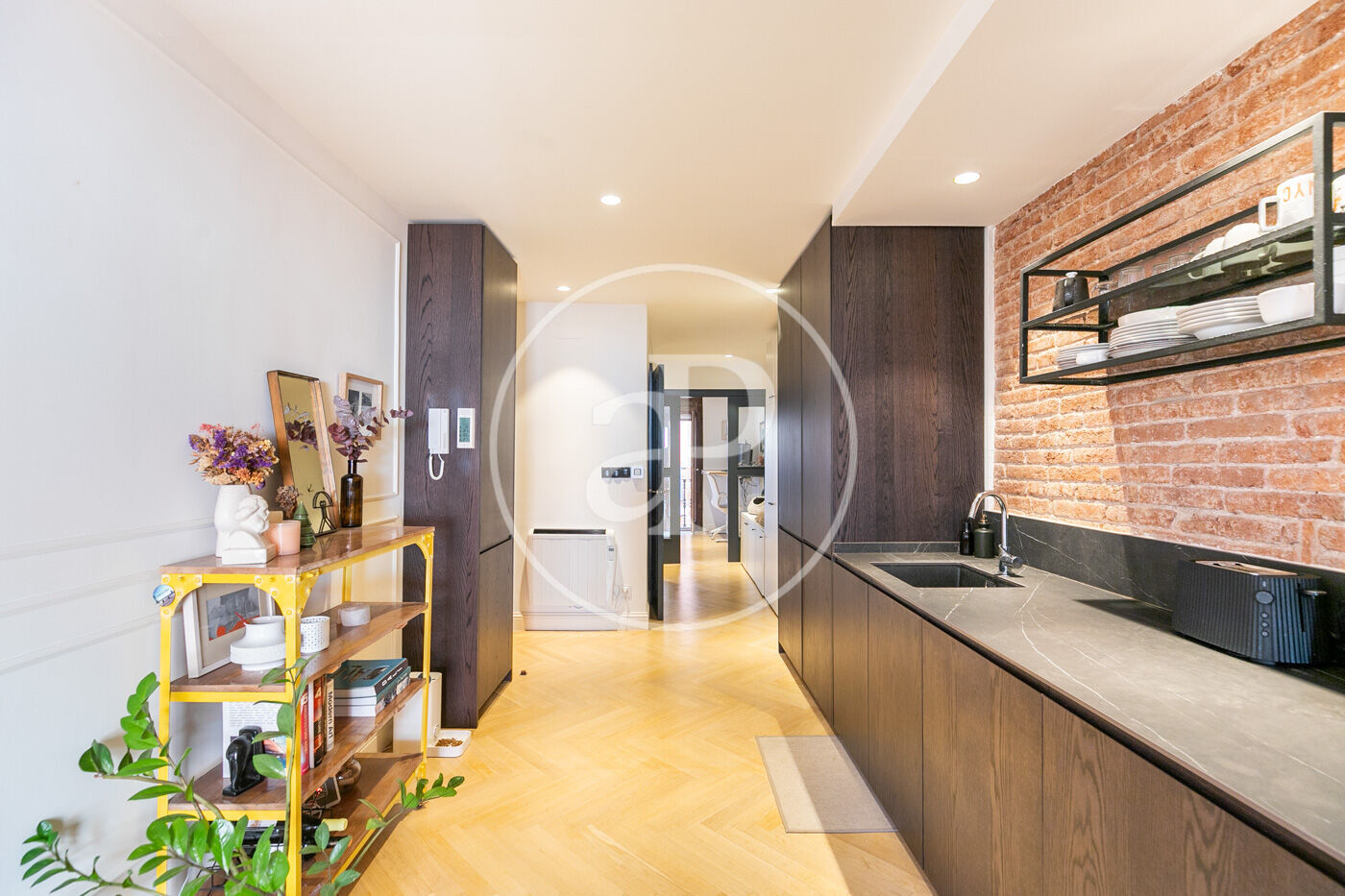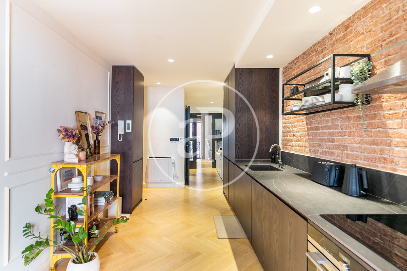 A mà dreta trobem la zona de dia, amb un bany complet i la cuina office, dissenyada amb molt de gust, que inclou els electrodomèstics. A continuació, l'ampli saló amb dues sortides al balcó i tots els acabats molt ben harmonitzats, en combinació amb els terres de parquet en espiga a totes les estances, excepte als banys, on s'ha instal·lat gres de disseny modern i actual.