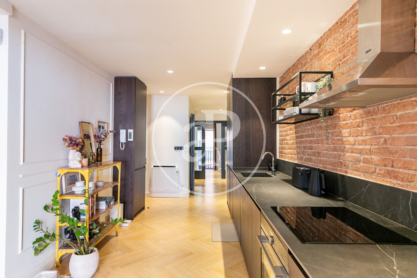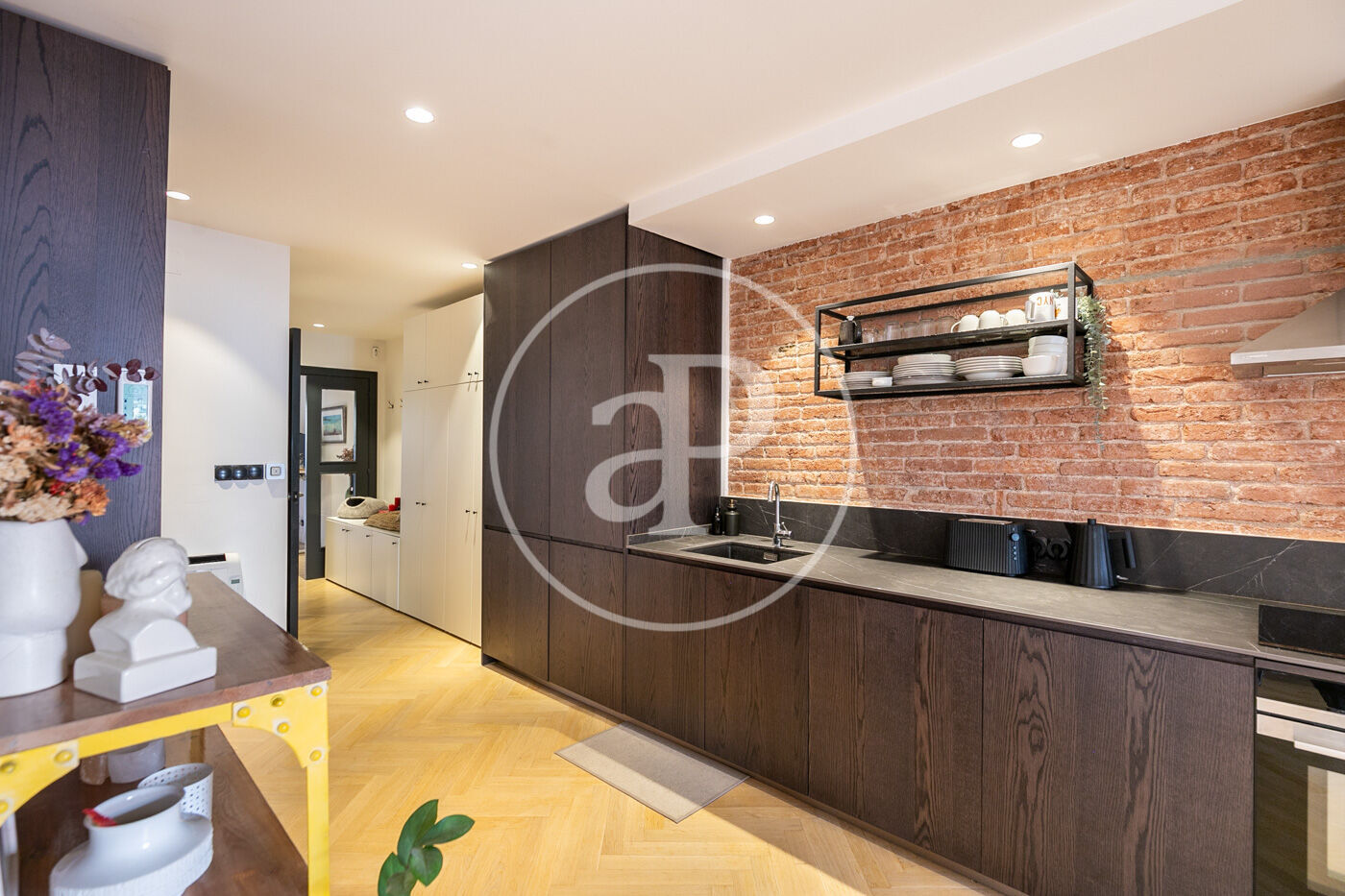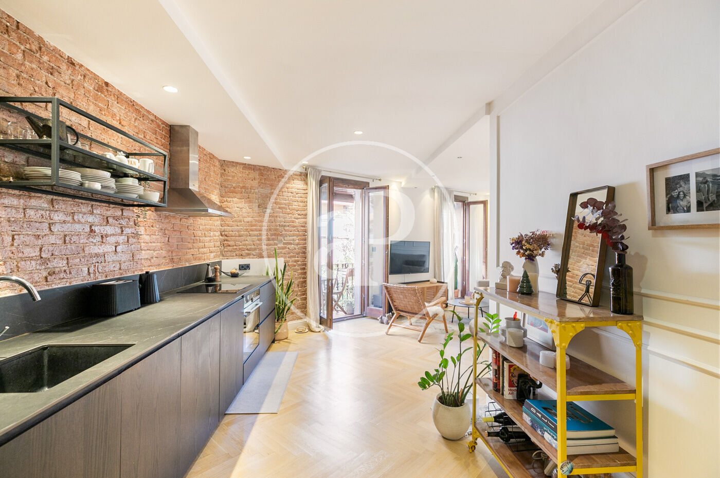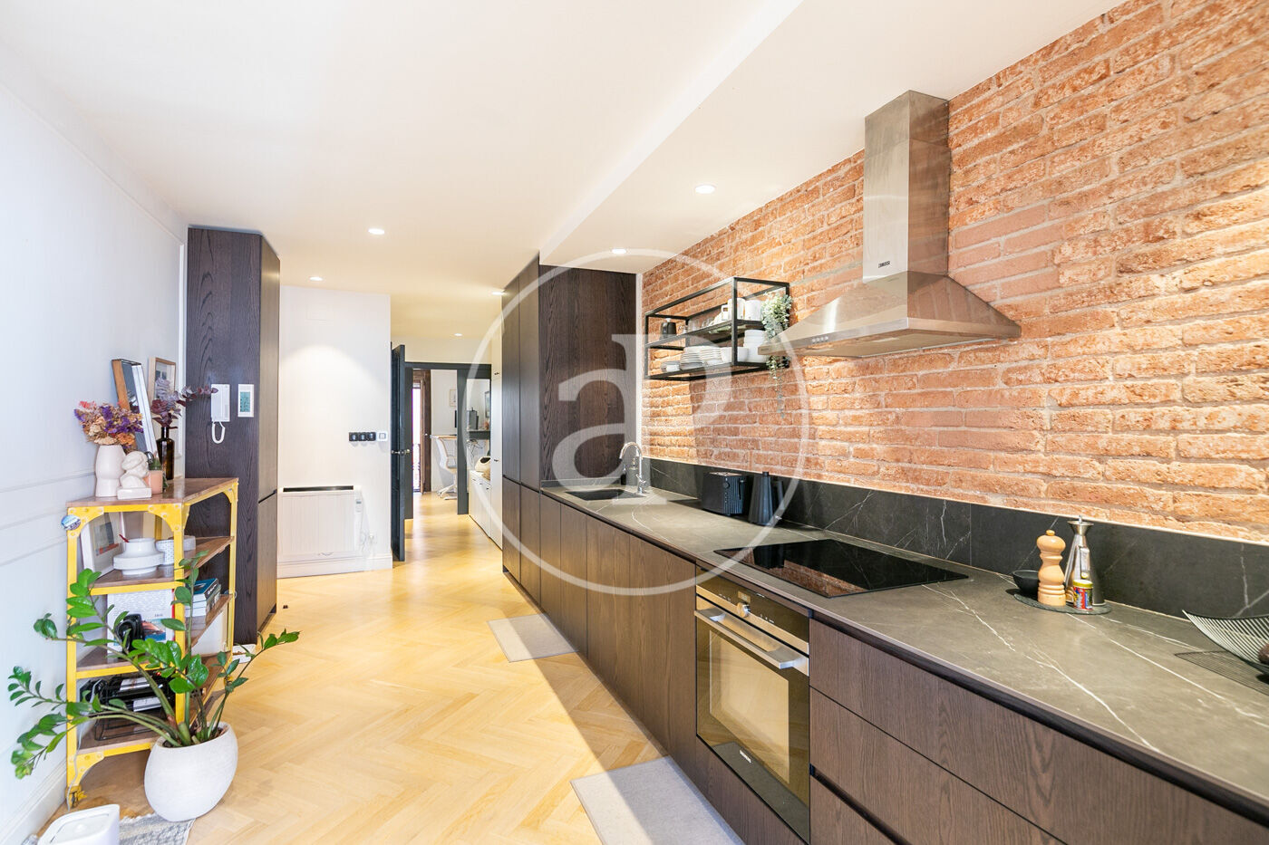 A mà dreta trobem la zona de dia, amb un bany complet i la cuina office, dissenyada amb molt de gust, que inclou els electrodomèstics. A continuació, l'ampli saló amb dues sortides al balcó i tots els acabats molt ben harmonitzats, en combinació amb els terres de parquet en espiga a totes les estances, excepte als banys, on s'ha instal·lat gres de disseny modern i actual.