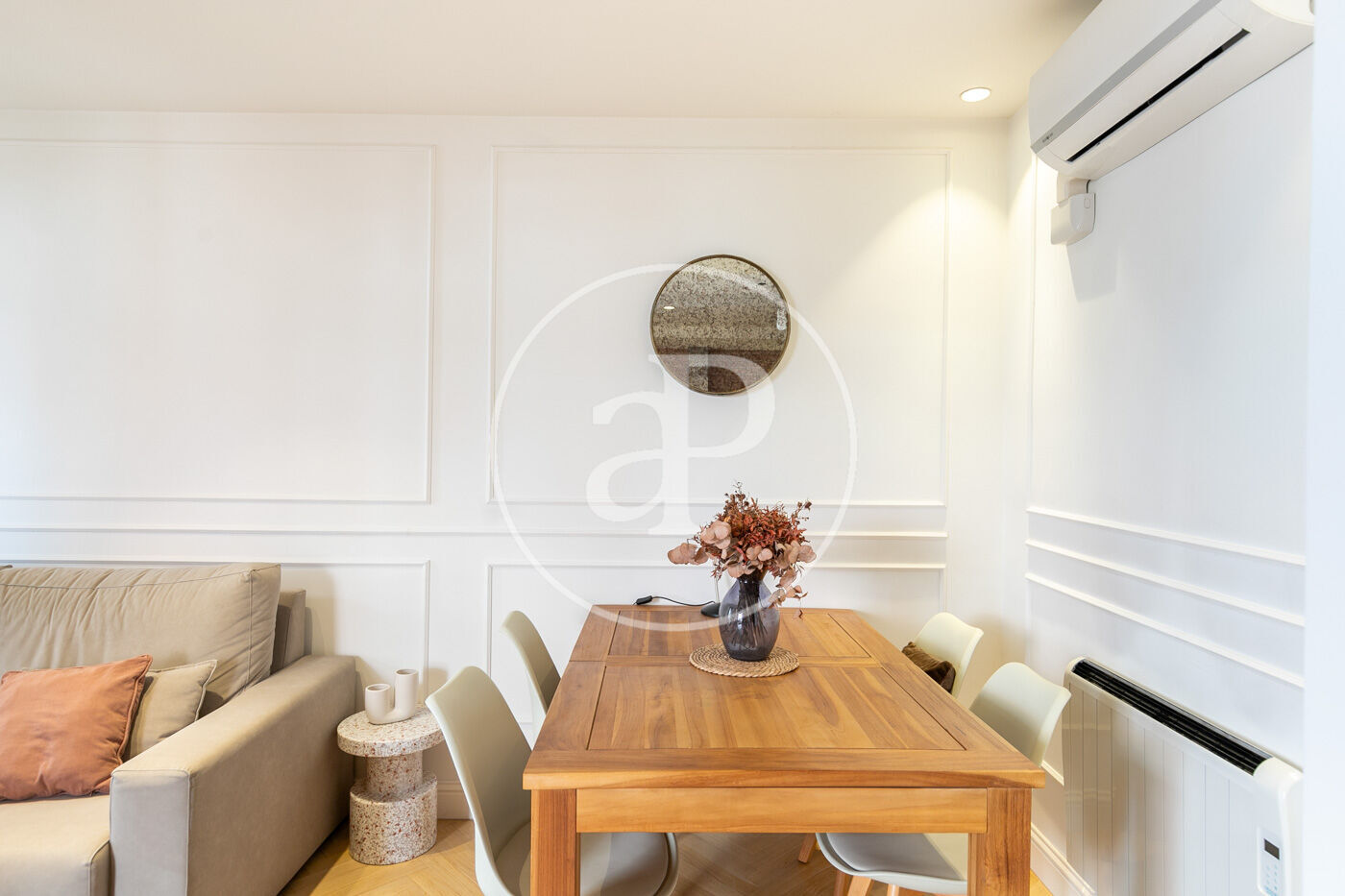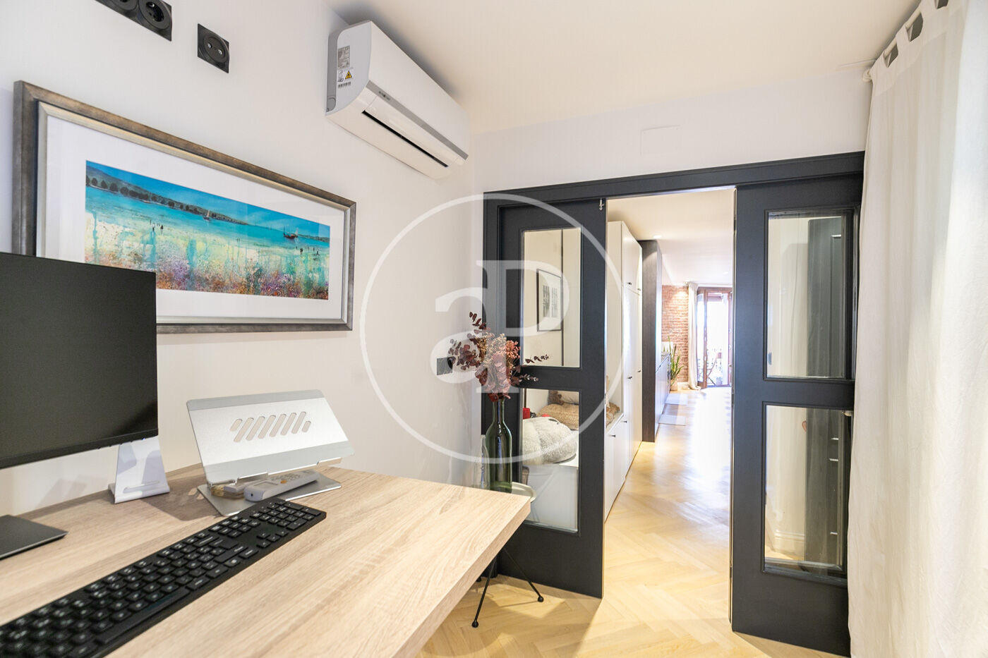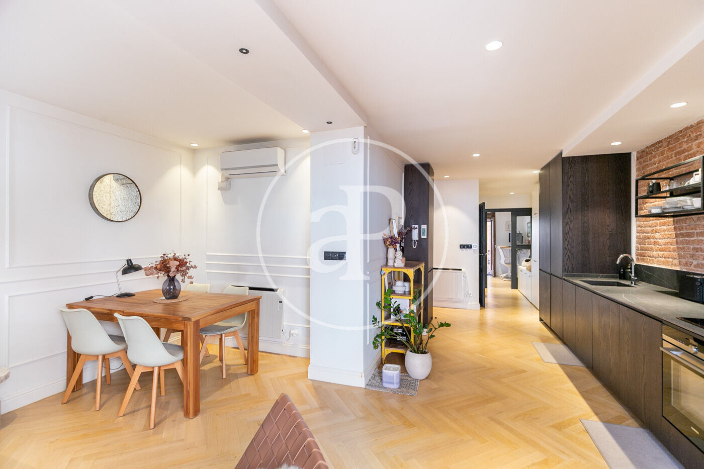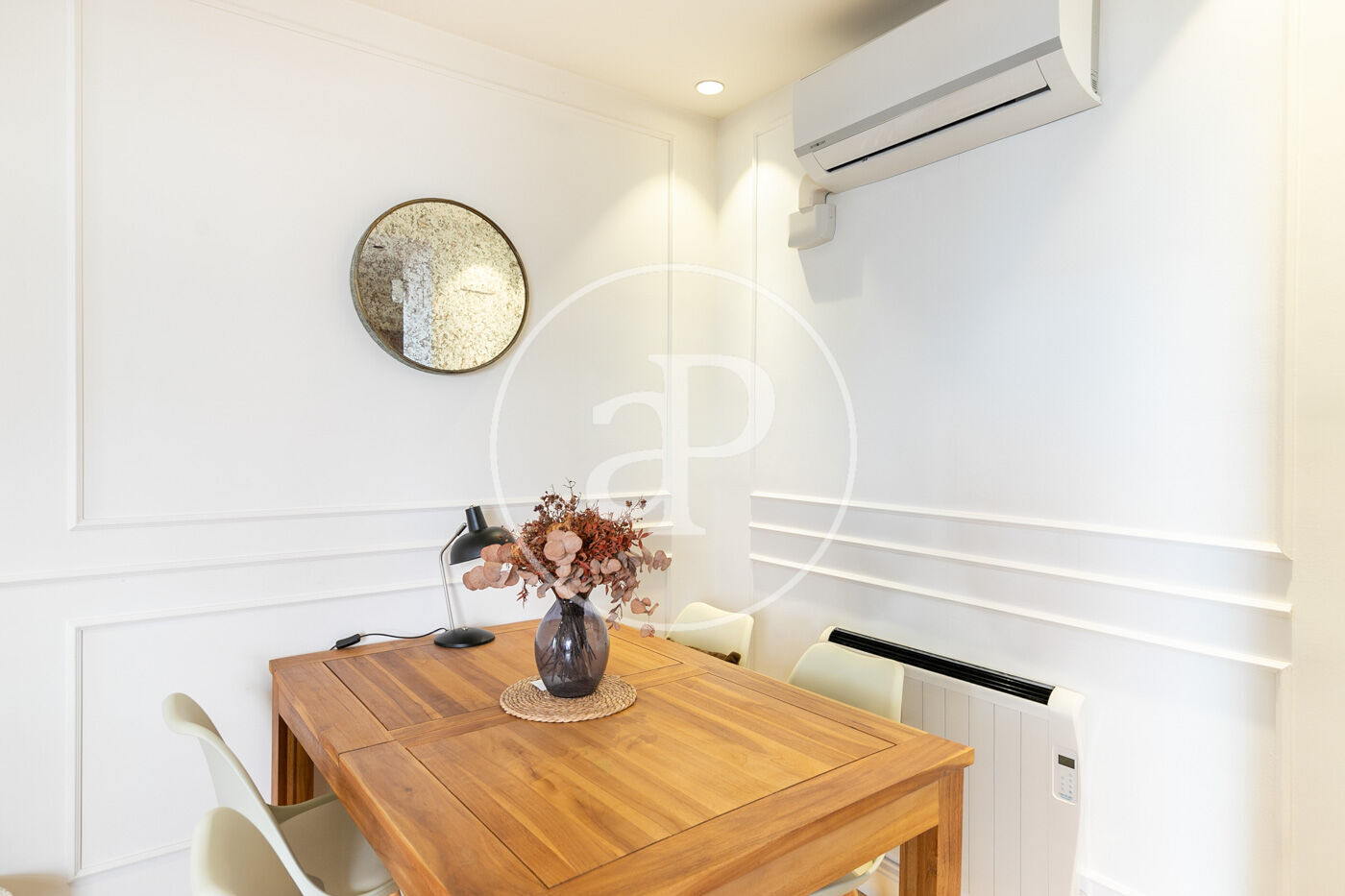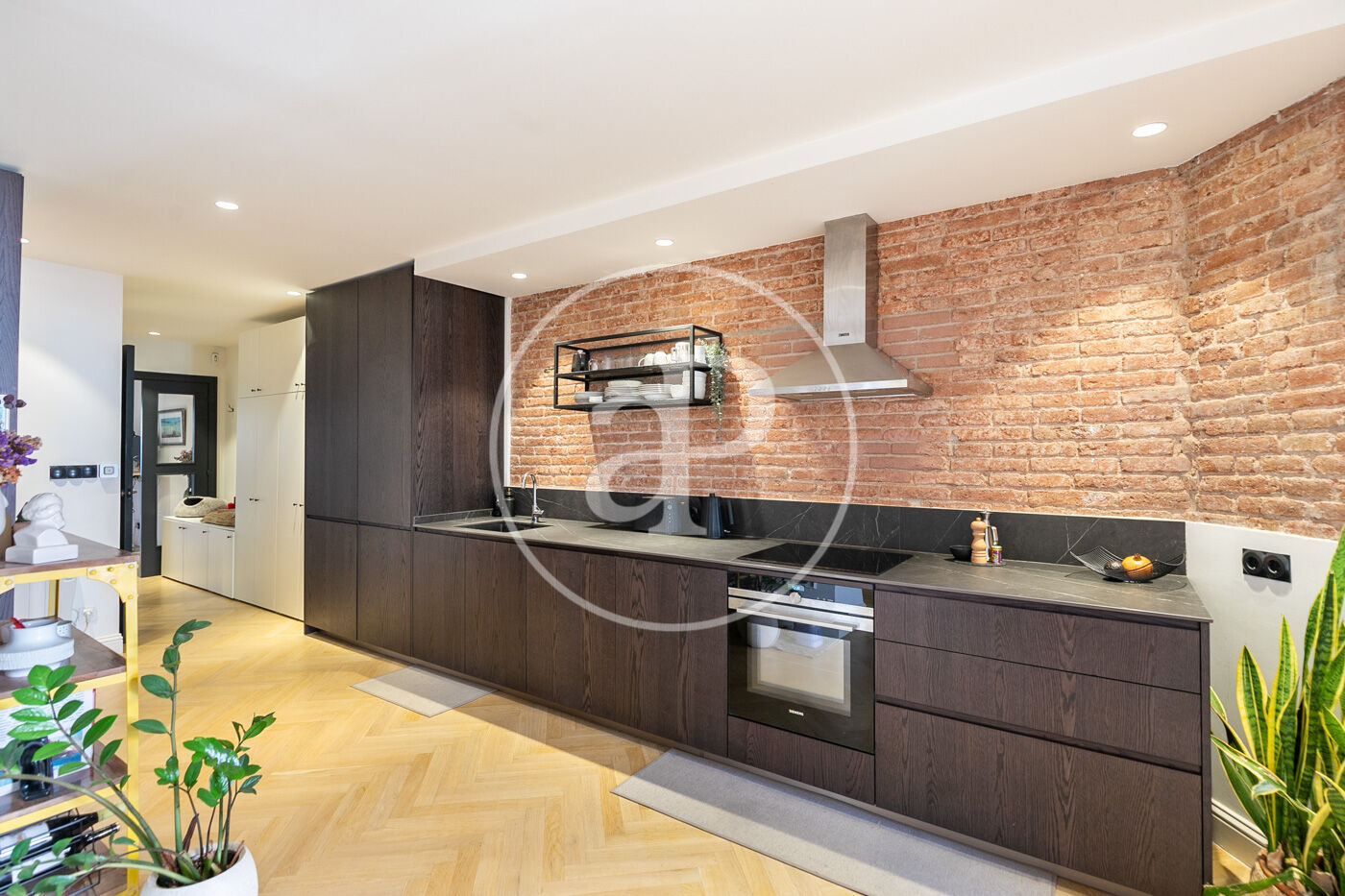 A mà dreta trobem la zona de dia, amb un bany complet i la cuina office, dissenyada amb molt de gust, que inclou els electrodomèstics. A continuació, l'ampli saló amb dues sortides al balcó i tots els acabats molt ben harmonitzats, en combinació amb els terres de parquet en espiga a totes les estances, excepte als banys, on s'ha instal·lat gres de disseny modern i actual.
