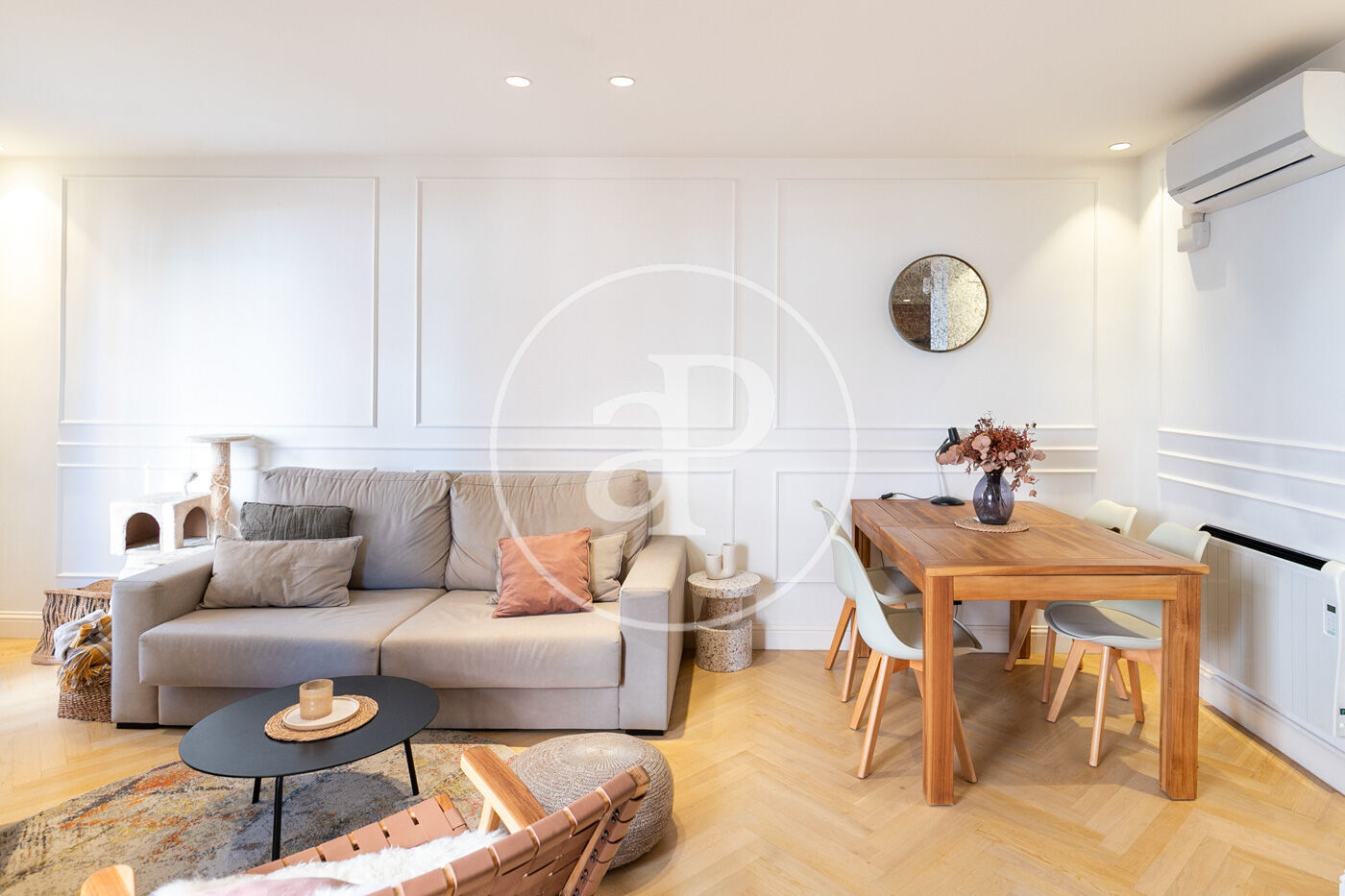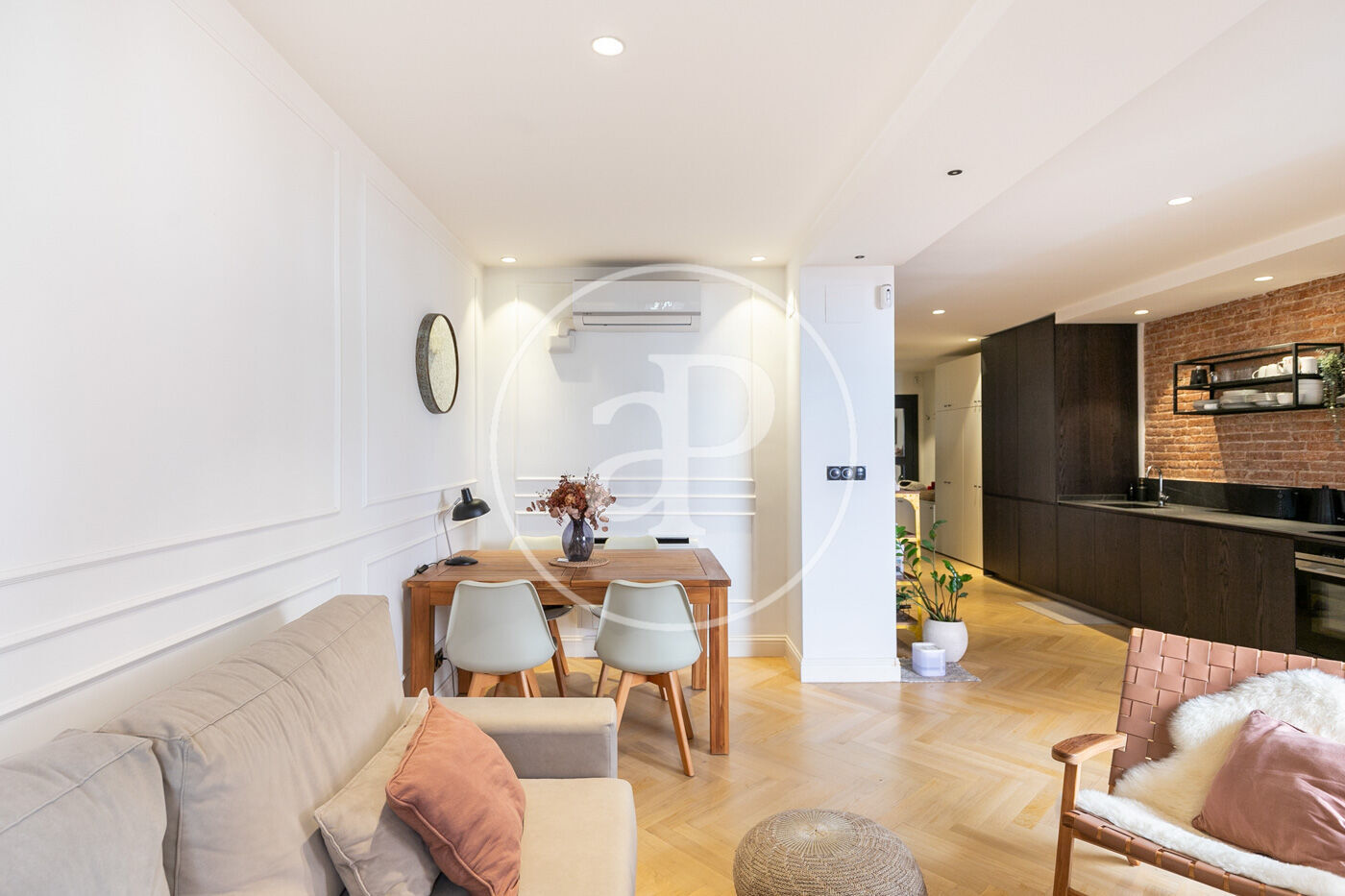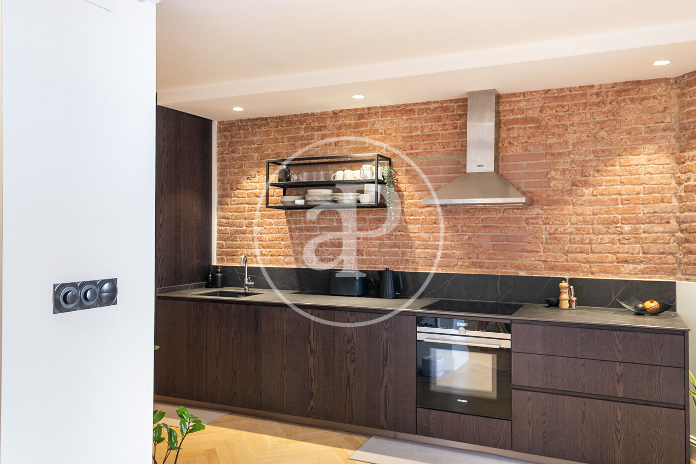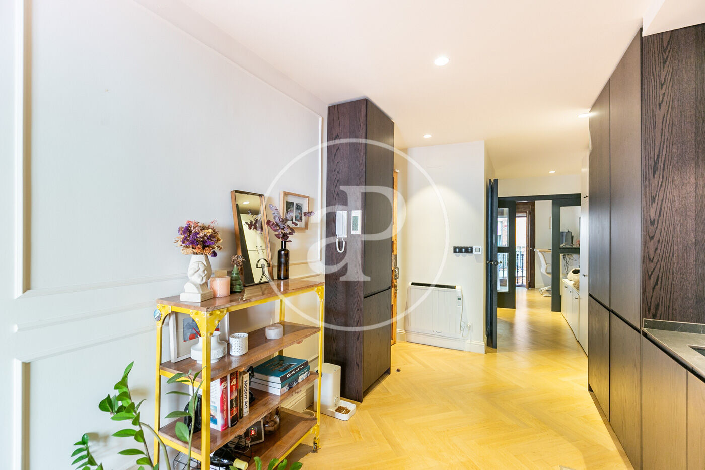 A mà dreta trobem la zona de dia, amb un bany complet i la cuina office, dissenyada amb molt de gust, que inclou els electrodomèstics. A continuació, l'ampli saló amb dues sortides al balcó i tots els acabats molt ben harmonitzats, en combinació amb els terres de parquet en espiga a totes les estances, excepte als banys, on s'ha instal·lat gres de disseny modern i actual.