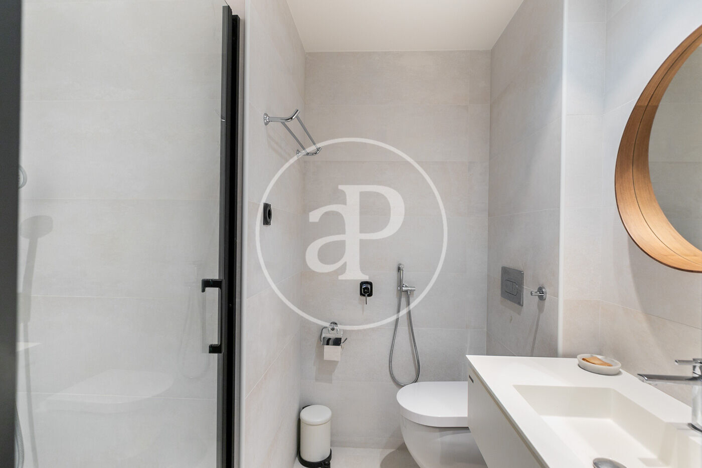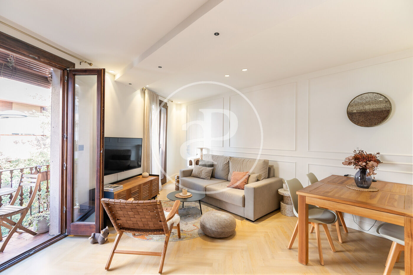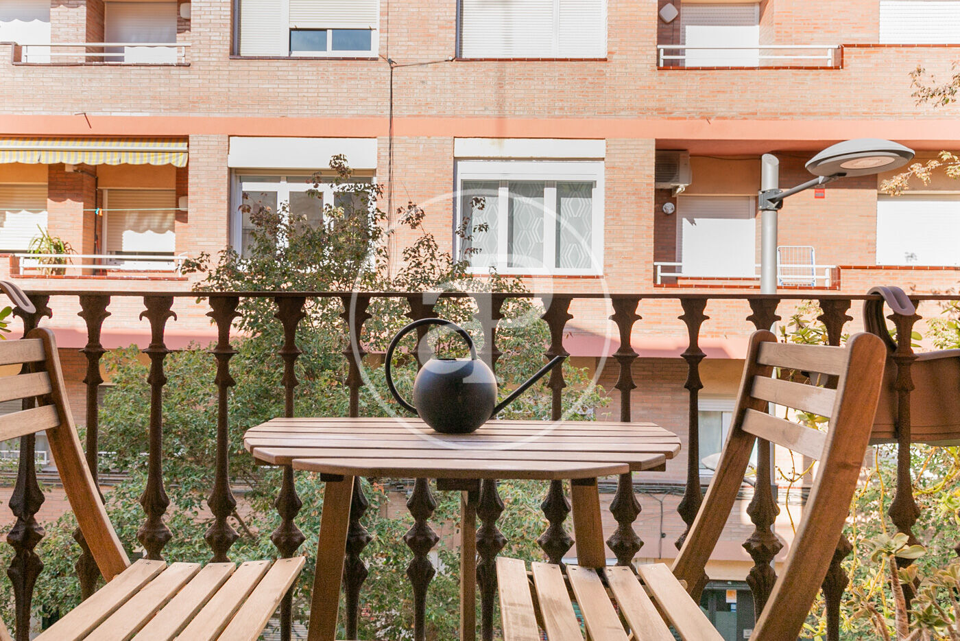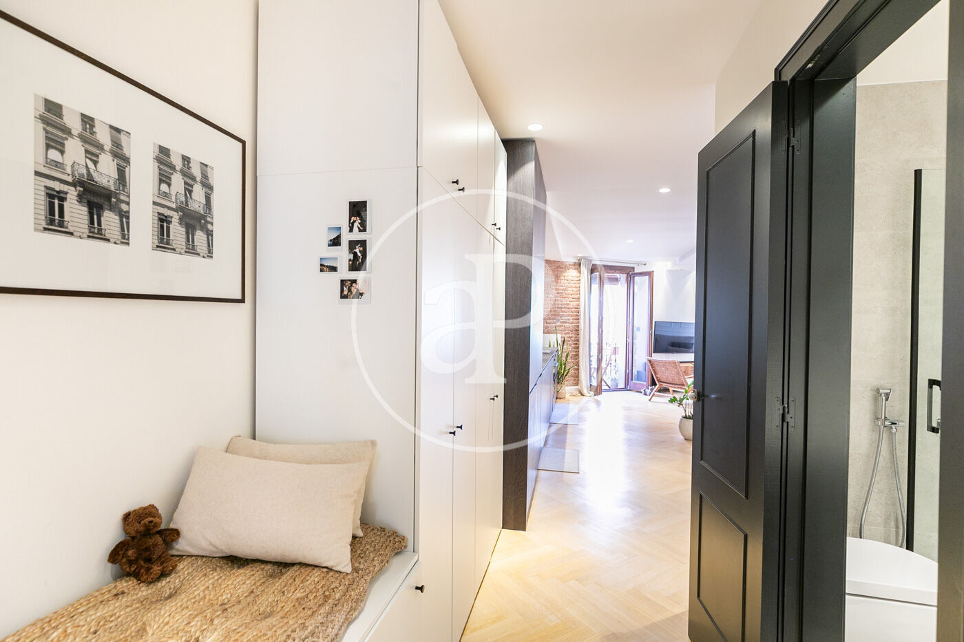 A mà dreta trobem la zona de dia, amb un bany complet i la cuina office, dissenyada amb molt de gust, que inclou els electrodomèstics. A continuació, l'ampli saló amb dues sortides al balcó i tots els acabats molt ben harmonitzats, en combinació amb els terres de parquet en espiga a totes les estances, excepte als banys, on s'ha instal·lat gres de disseny modern i actual.