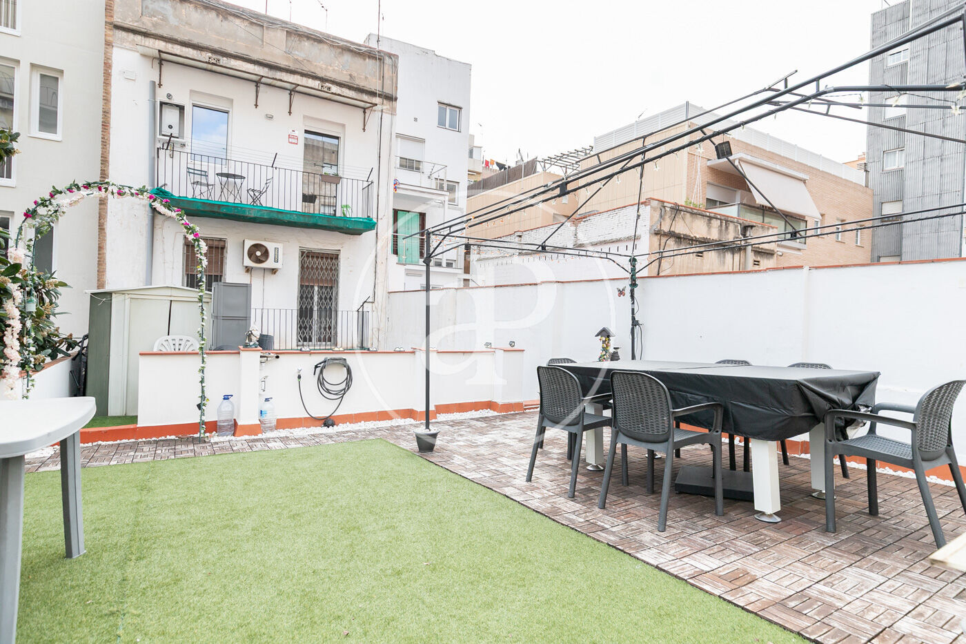 A Sants, al tranquil carrer Ventura Plaja, trobem aquesta meravellosa casa de 70m² (segons cadastre) reformada amb una gran terrassa exterior de 55m². La terrassa és molt assolellada, àmplia, exterior i molt silenciosa, ideal per crear diferents ambients segons els gustos del futur propietari.