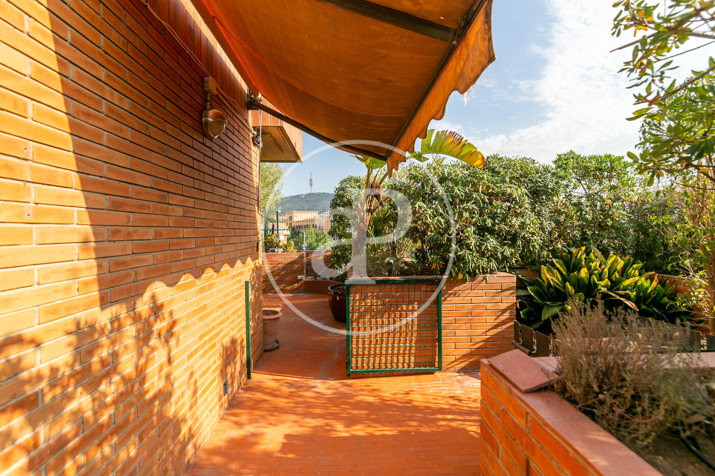 La gran terrassa de 160 m² que envolta l’habitatge ofereix vistes magnífiques al Tibidabo i al mar, i compta amb grans jardineres d’obra plenes de vegetació. Està completament protegida per a infants, disposa de reg automàtic i il·luminació amb focus. La sensació és la de viure en un xalet, però sense els seus inconvenients, ja que s’hi accedeix des de totes les habitacions, el saló-menjador i la cuina.
