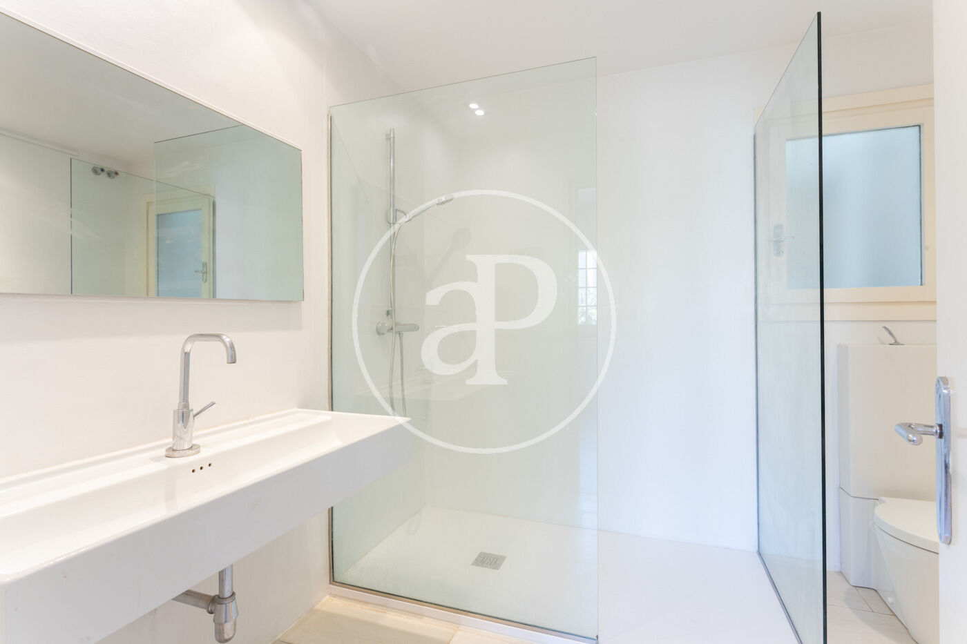 Un gran saló ple de llum natural, amb llar de foc que convida a tardes d’hivern acollidores, s’obre a una cuina semioberta equipada amb electrodomèstics d’alta gamma. Des d’aquí, les portes connecten directament amb un jardí privat de 80 m², ple d’arbres i plantes, on cada estació té la seva màgia. El porxo cobert és perfecte per a esmorzars tranquils o sopars a la fresca.