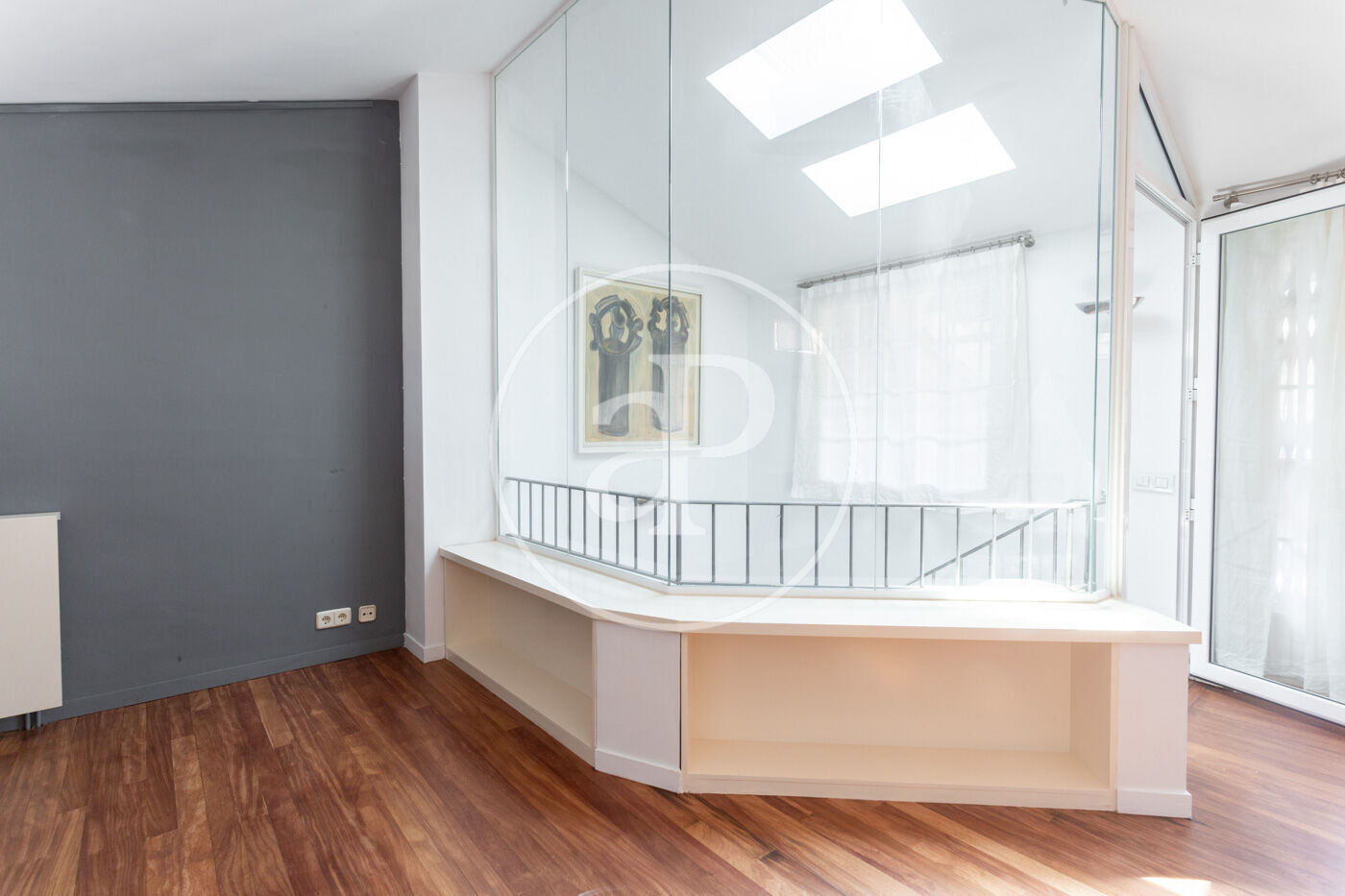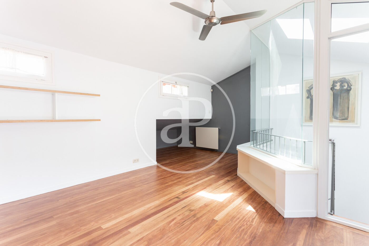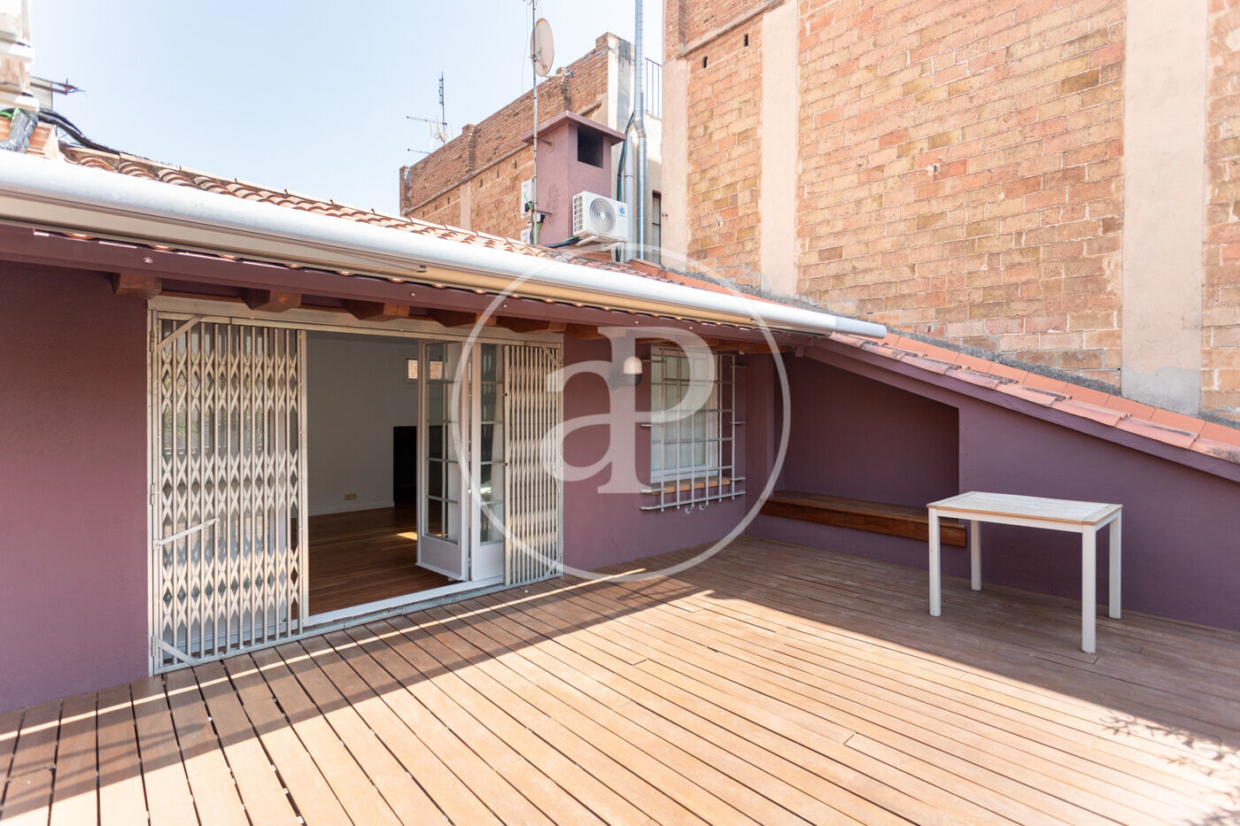 Un estudi banyat de llum natural, ideal per practicar ioga, treballar, crear o simplement somiar, amb sortida a una terrassa amb una gran taula per compartir moments amb família i amics sota el cel de Barcelona.