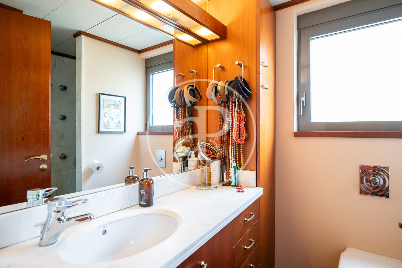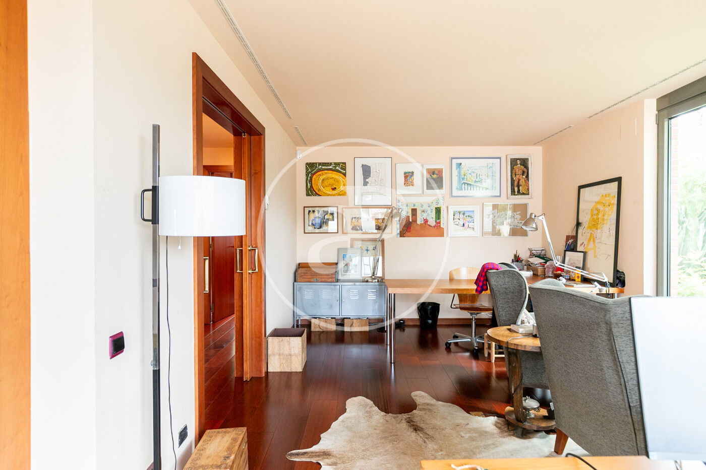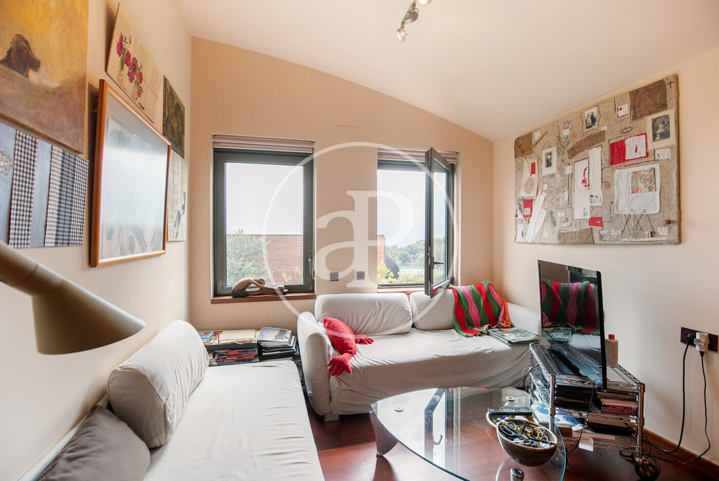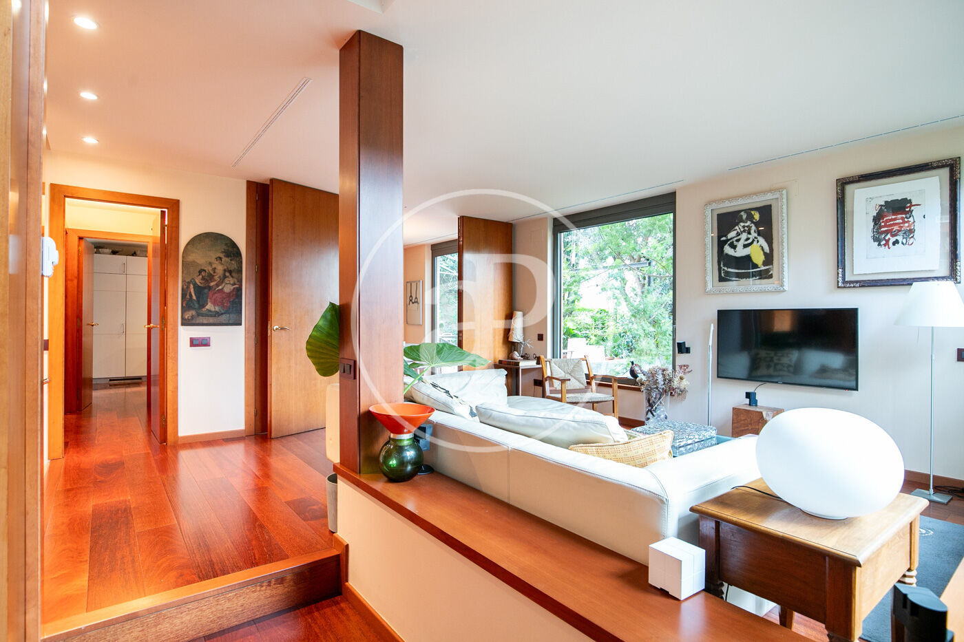 La sala principal, àmplia i diàfana, connecta amb les terrasses assolellades i el jardí privat, creant una continuïtat visual que multiplica la sensació d’espai i serenitat. La cuina, moderna i perfectament equipada, és el centre funcional de l’habitatge; un espai pensat tant per a l’ús diari com per a la gastronomia més exigent.