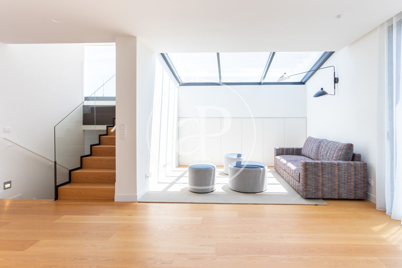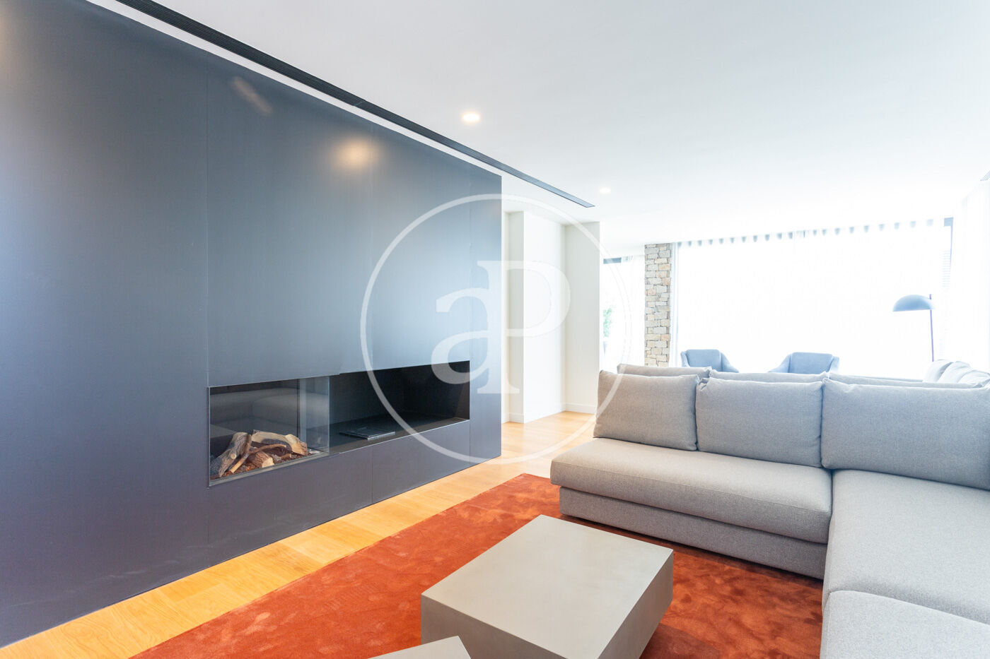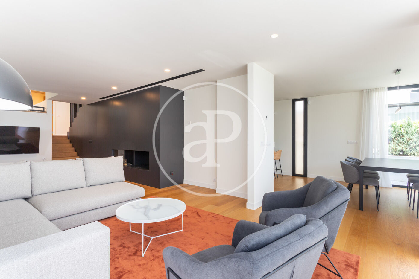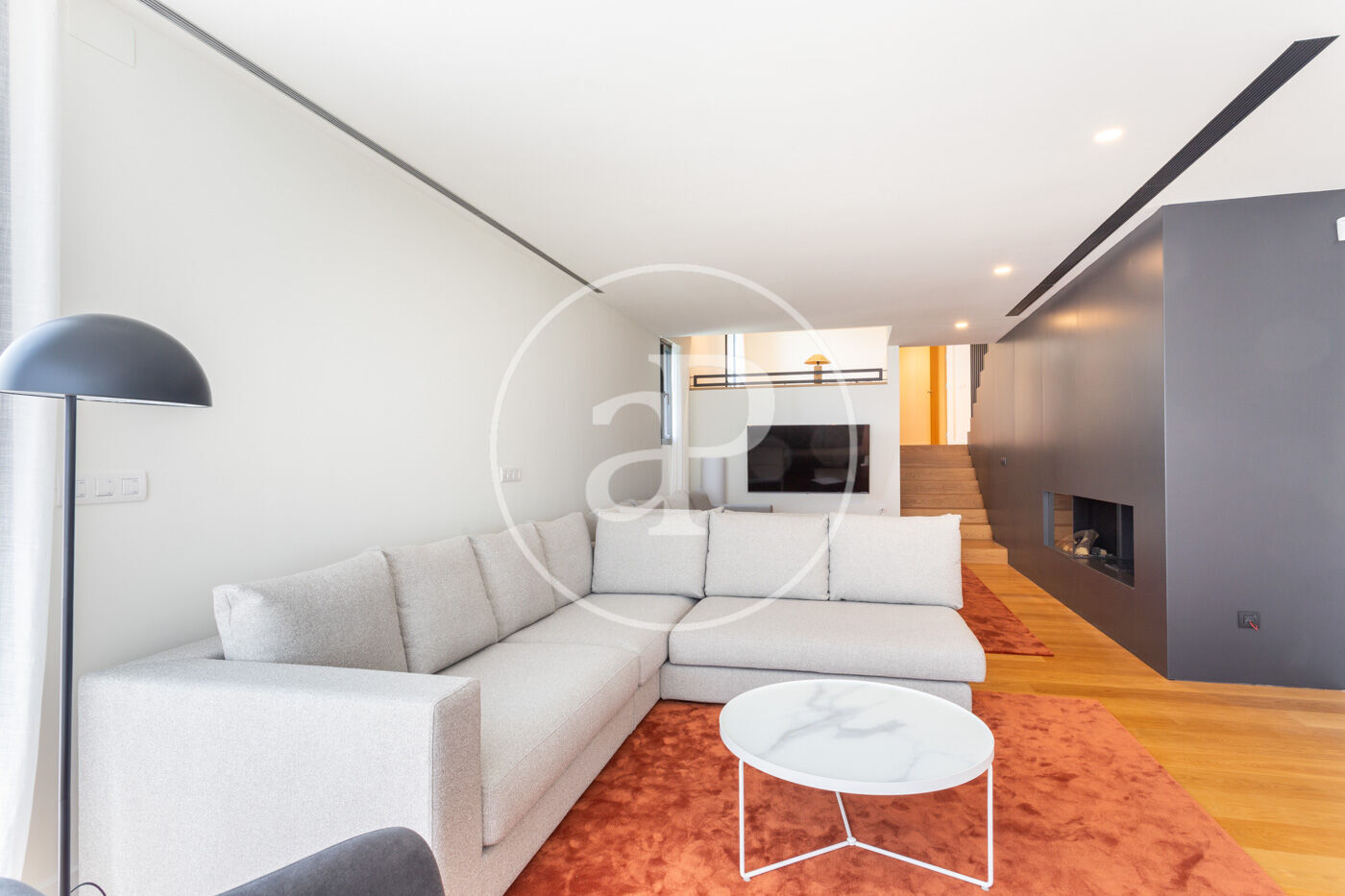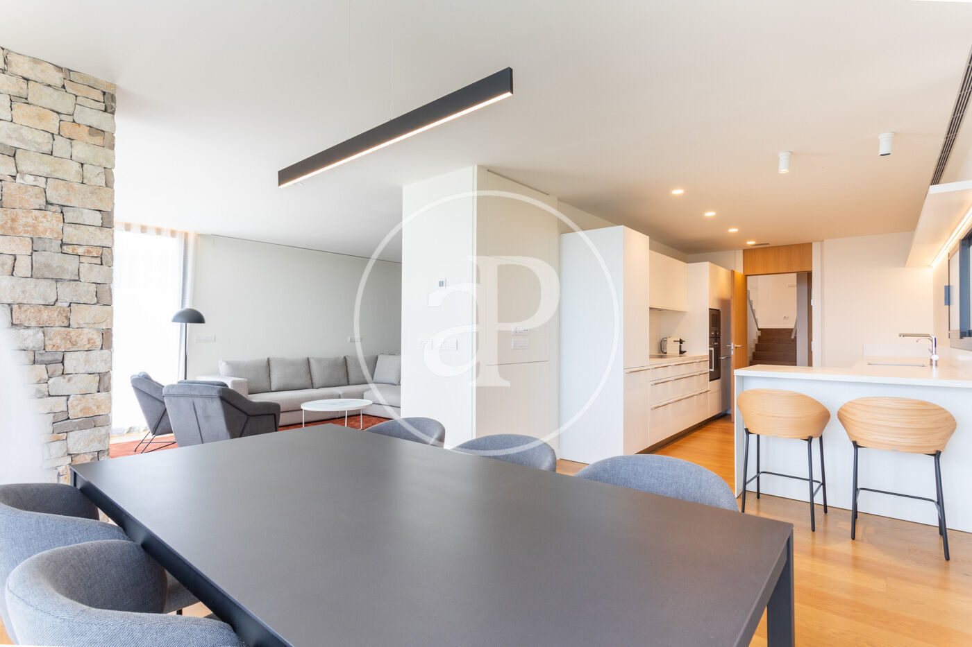 En entrar a l'habitatge ens trobem amb un rebedor amb accés a l'ascensor i a la banda un lavabo de cortesia. Baixant unes escales trobem el saló-menjador, molt lluminós i tranquil amb grans finestrals i una xemeneia de gas. A l'esquerra del saló es troba la cuina americana de disseny Bulthaup amb electrodomèstics Gaggenau. Des del saló s'accedeix al jardí i a la piscina.