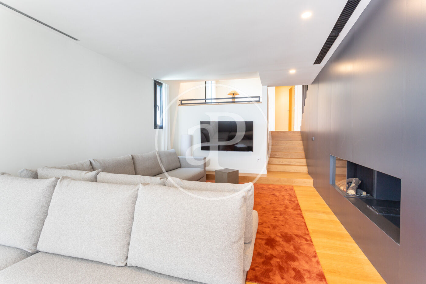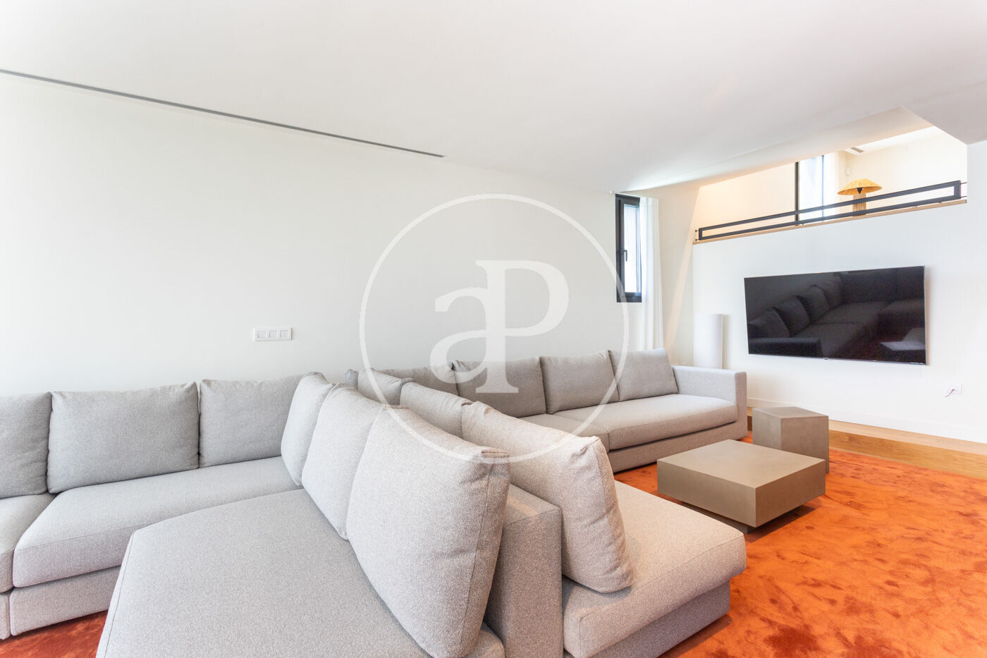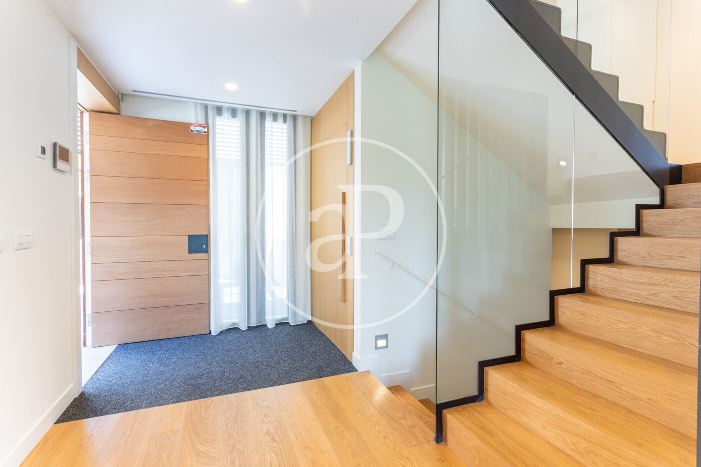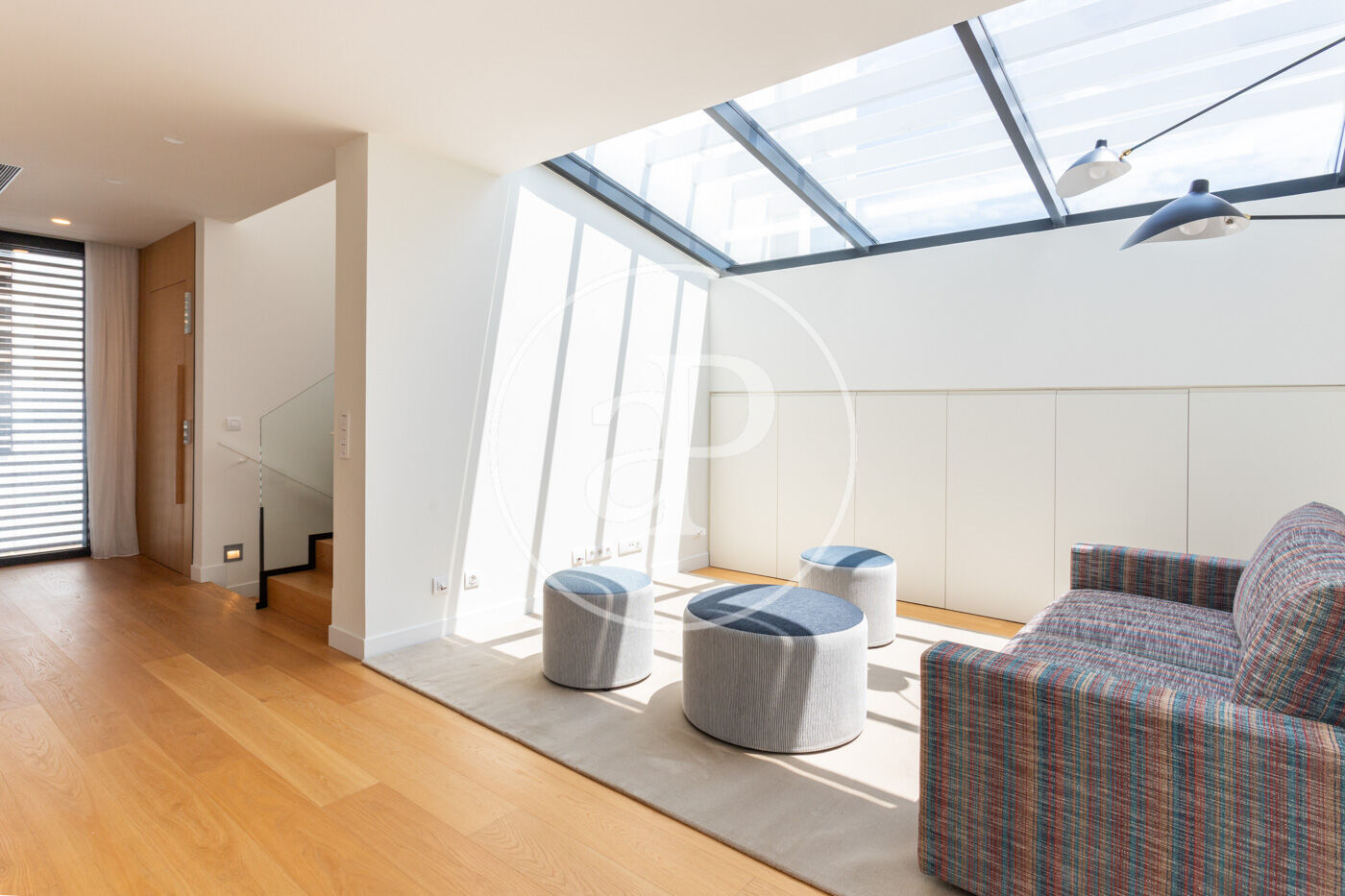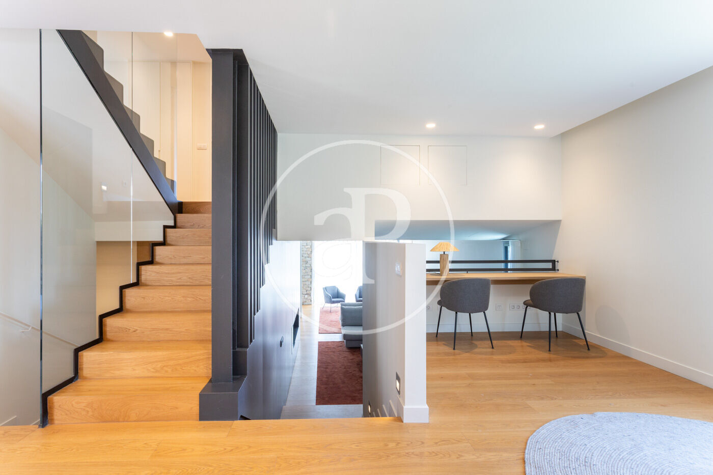 En entrar a l'habitatge ens trobem amb un rebedor amb accés a l'ascensor i a la banda un lavabo de cortesia. Baixant unes escales trobem el saló-menjador, molt lluminós i tranquil amb grans finestrals i una xemeneia de gas. A l'esquerra del saló es troba la cuina americana de disseny Bulthaup amb electrodomèstics Gaggenau. Des del saló s'accedeix al jardí i a la piscina.