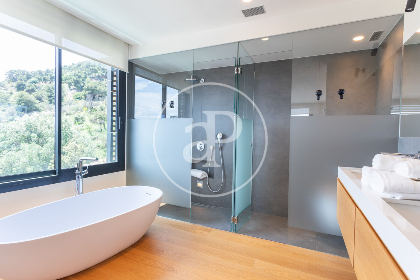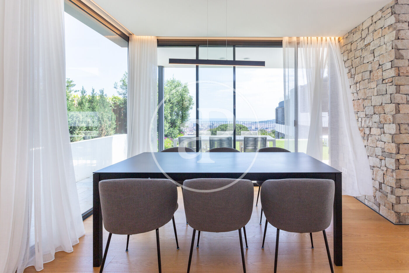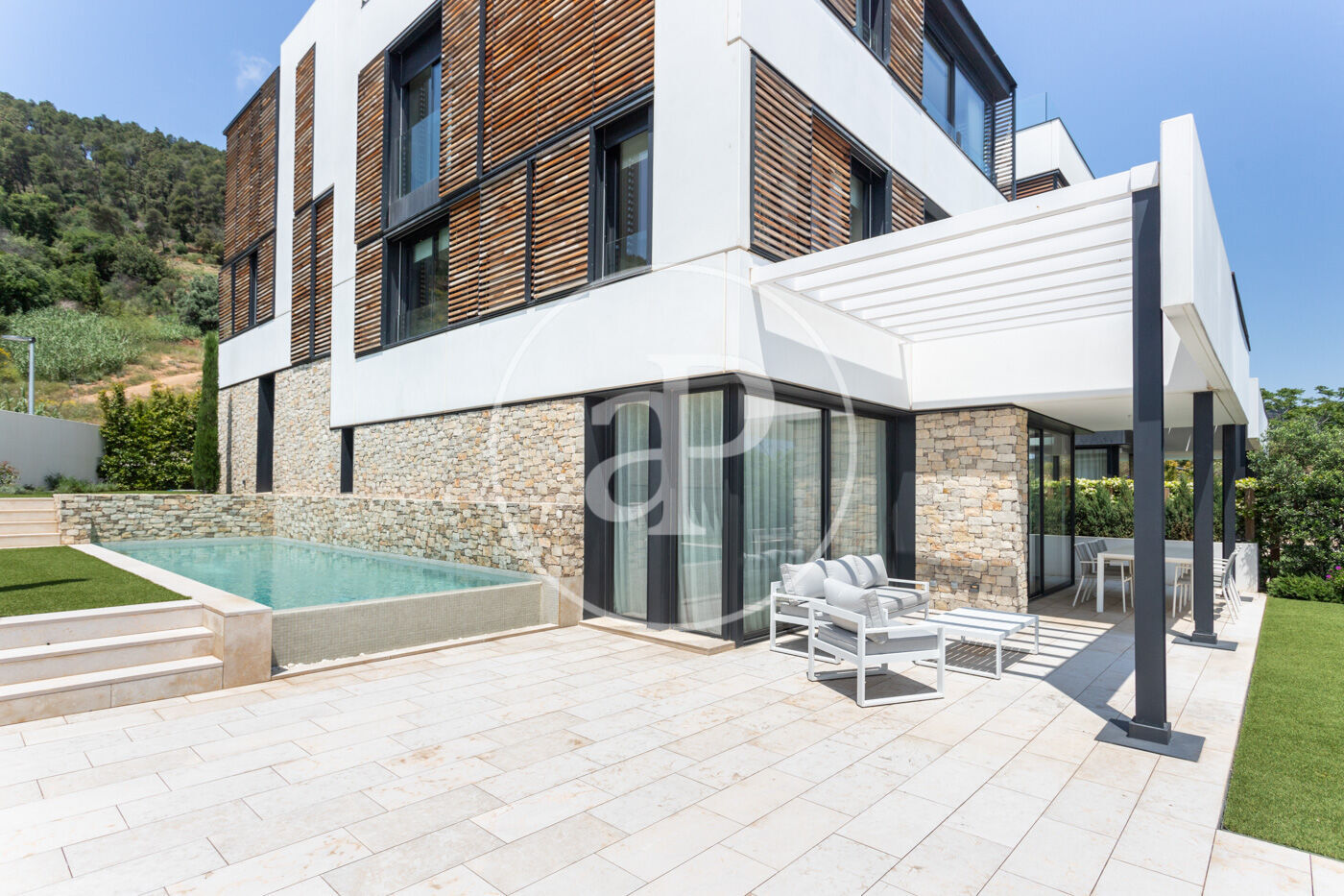 La casa és d'estructura de formigó, amb barreja de pedra natural, grans finestrals i contrafinestres corredisses de fusta, que ens permeten jugar amb la llum. A terra tenim un parquet natural de roure, amb calefacció radiant. La casa també té aire condicionat i fusteria d'alumini de màxima qualitat. La qualificació energètica de la casa és de nivell A.