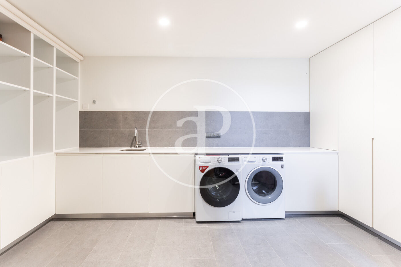 A la planta inferior, trobem una zona d'aigües equipada amb safareig, rentadora assecadora i zona de planxat i una zona de servei amb un dormitori i un bany amb dutxa.