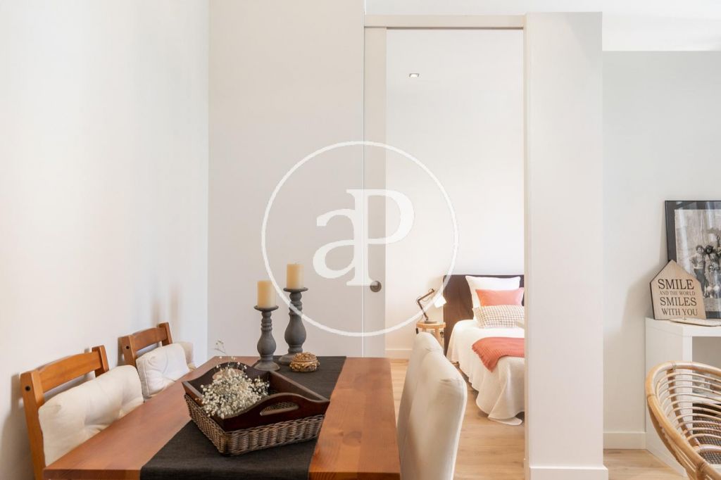 El pis té saló menjador amb sortida a l'agradable terrassa, una habitació de matrimoni amb grans armaris, bany complet amb dutxa i cuina totalment equipada. Tot l'habitatge té molta llum natural, terra de parquet natural, és exterior, té tendal elèctric, aire condicionat i calefacció gas. S’ha reformat amb materials de molt bona qualitat i amb molt de gust. La finca no té ascensor.