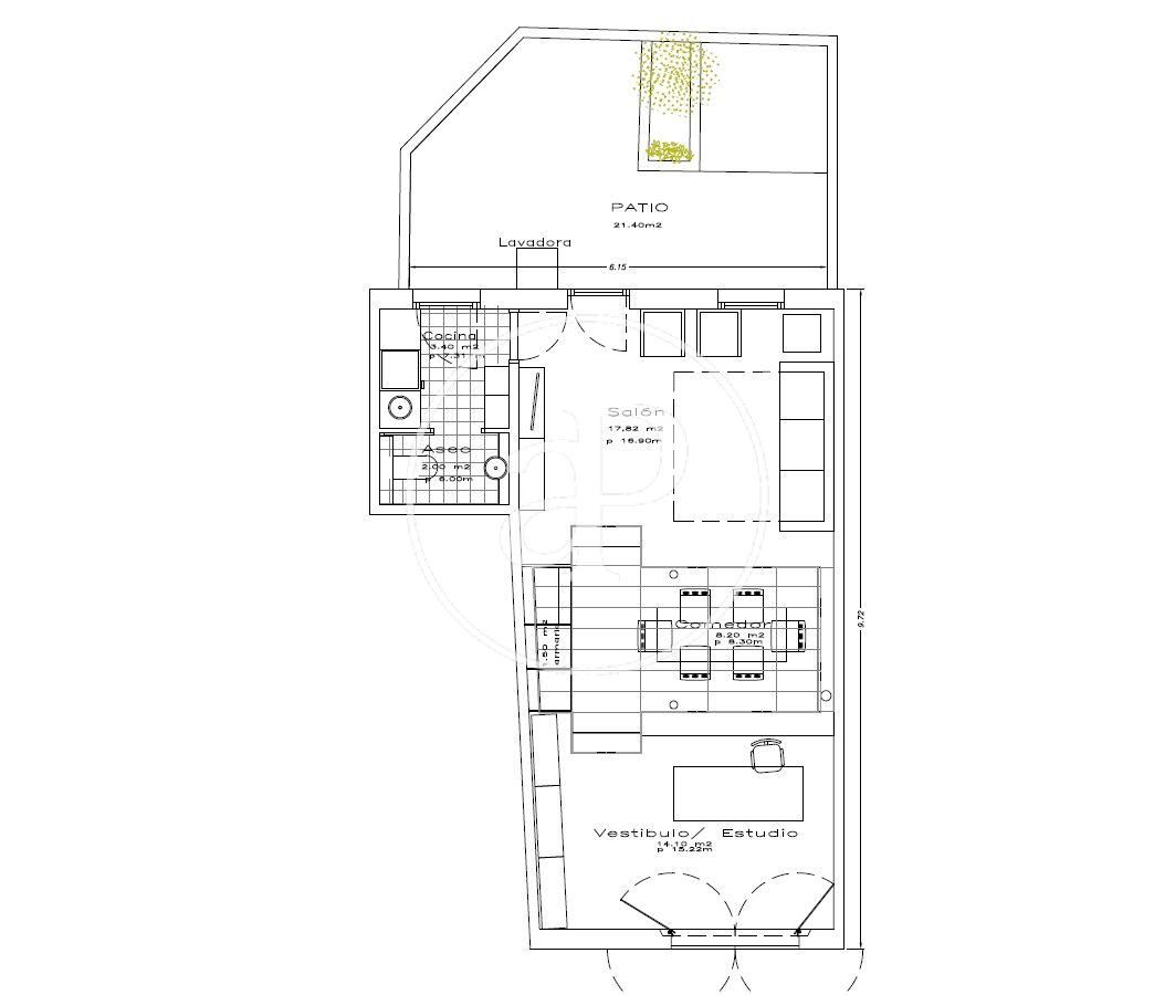 Des de l’entrada s’accedeix a tot un espai obert, començant per una zona de despatx i posteriorment s’accedeix al saló menjador. Té un sofà-llit doble i un armari de bon tamany. La cuina disposa de placa d’inducció i una nevera petita sota el taulell. Contigu a la cuina hi ha el bany de disseny. A la terrassa hi ha la rentadora.