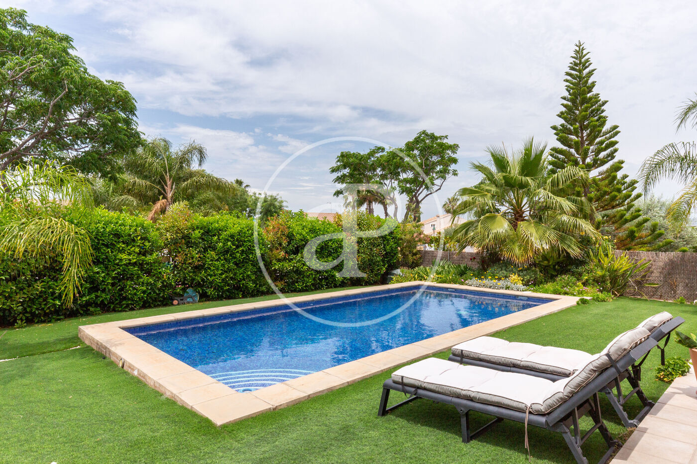 El jardí es troba en excel·lents condicions, amb dos porxos orientats de manera estratègica per gaudir al màxim del clima mediterrani. La piscina, amb manteniment automatitzat, es manté neta i funcional durant tot l’any. A més, l’habitatge disposa d’una àmplia zona d’aparcament exterior amb capacitat per a dos vehicles i un traster.