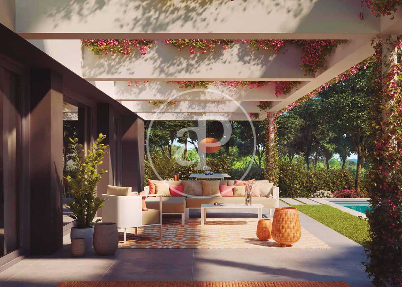 La sortida al jardí exterior, coronada per una pèrgola sobre una piscina de vora infinita.