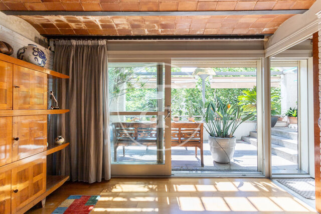 Davant del menjador, la sala d'estar. Un espai obert d'uns 23m2 aproximadament, molt ben distribuïts. Dissimulat al costat de la sala d'estar i accedint per una porta, arribem a la Mastersuite, una increïble habitació doble, molt ben decorada, amb sostres de volta catalana i sortida a un agradable pati interior, enjardinat, generant un petit oasi en aquest espai de la casa. En aquesta habitació trobem el segon bany, ampli i elegant equipat amb accessoris de Porcelanosa també, amb plat de dutxa i mobiliari de molt bona qualitat.
