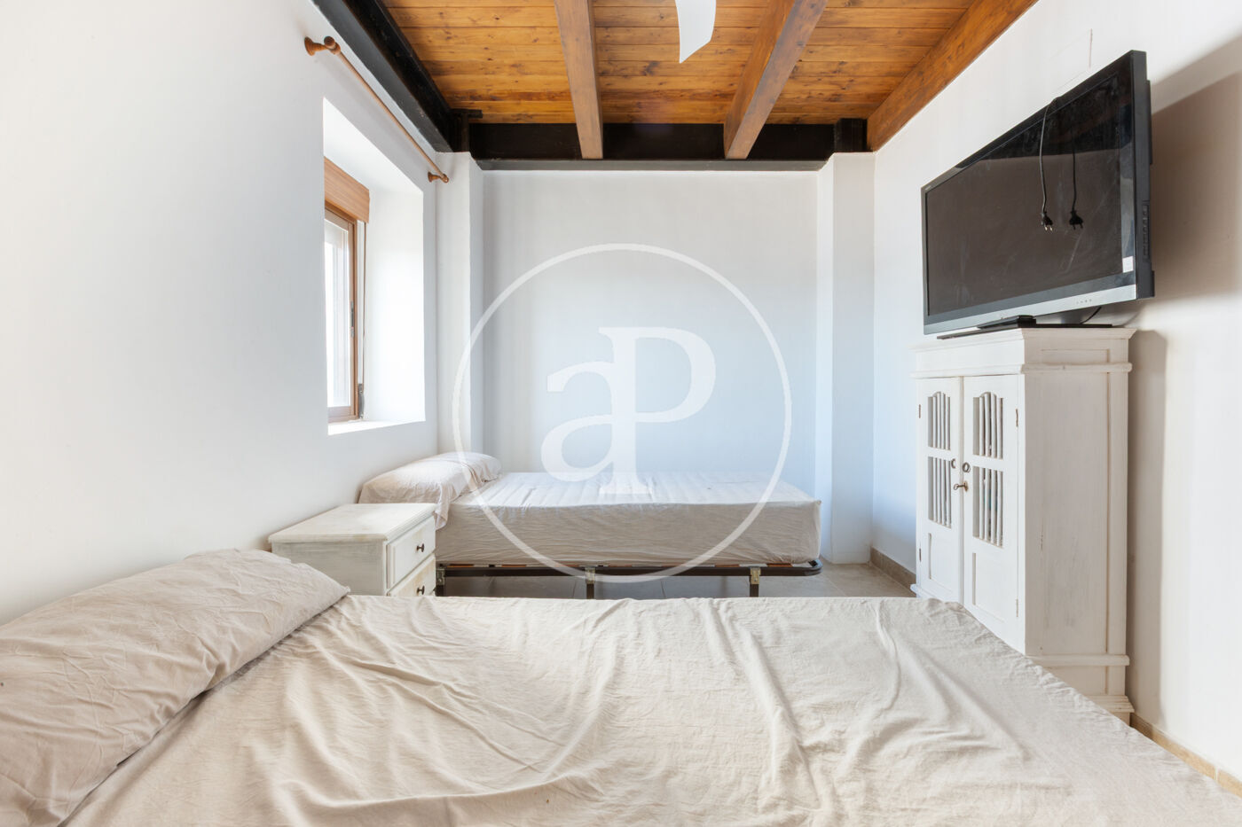 En un dels carrers amb millor accés a les zones comercials, a prop de Sant Miquel i de la Plaça d’Espanya, ens trobem amb un edifici racionalista de planta baixa i dues altures. A la planta baixa hi ha un local que actualment s’utilitza com a galeria d’art i que té moltes possibilitats de futur, ja que compta amb arcs, altells que li aporten un atractiu especial, a més de tres habitacions, un aseo i una sala de bugaderia. Aquest local té moltes possibilitats, ja que es pot organitzar per a una gran varietat d’activitats. D’altra banda, trobem l’entrada principal, a la qual s’accedeix per una porta de forja i vidre que dona pas a un hall amb paviment de marbre i que es distribueix de la següent manera: Primera planta: Un ampli hall amb escala, saló amb llar de foc, menjador, habitació doble amb bany en suite i sala. Cuina, aseo i amplis patis. Segona planta: Hall amb llar de foc, quatre dormitoris amb banys en suite, a més d’una terrassa superior a la teulada. L’habitatge, interiorment, té paviments hidràulics de 40 × 40 amb vetes en tons verds i ambre disposats en forma d’escac. Tota la fusteria és modernista. La casa és molt exterior i, per tant, està inundada de llum. Hi ha la possibilitat d’elevar una planta més i també de construir una piscina. És una casa que pot tenir molt d’encant! Possibilitat d’aparcament per a diversos cotxes.