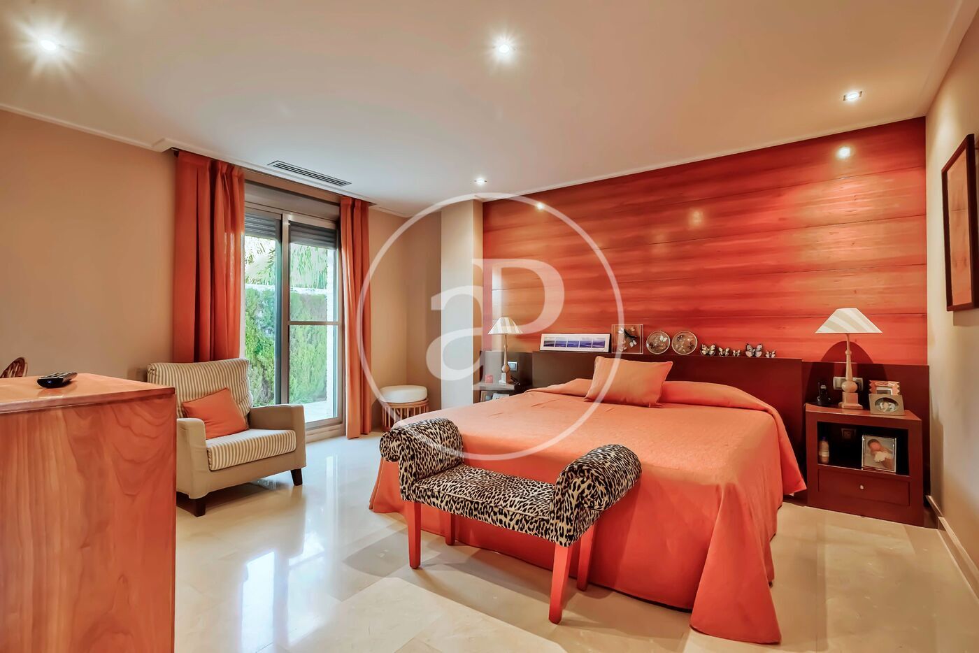L’habitatge es distribueix en tres nivells. A la planta baixa, un espaciós rebedor dona la benvinguda i condueix a un magnífic saló-menjador, perfecte per a reunions familiars o socials. La cuina, totalment equipada i amb accés directe al jardí, permet gaudir d’una connexió fluida entre l’interior i l’exterior. En aquesta mateixa planta es troba el dormitori principal, un autèntic refugi amb vestidor, bany en suite, eixida privada al jardí i un pràctic quart de bugada.