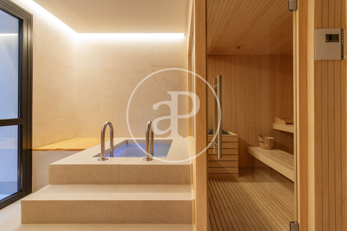dormitori, 1 bany, piscina, gimnàs, plaça d’aparcament, aire condicionat, armaris encastats, calefacció, consergeria i traster.