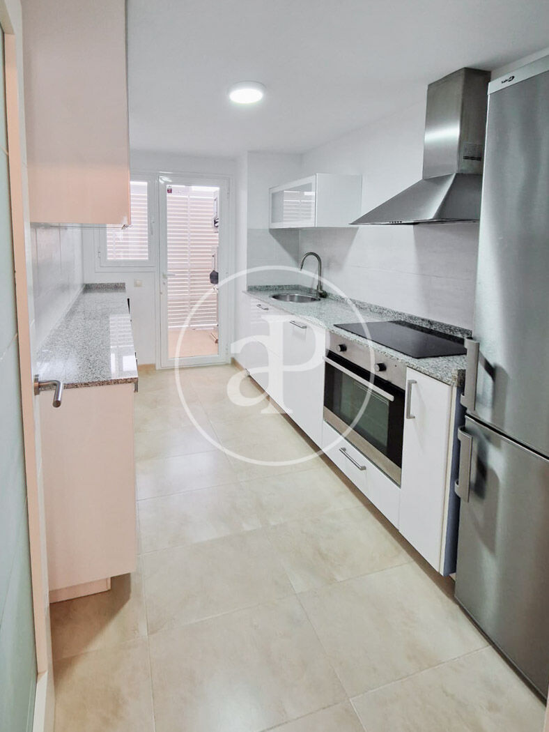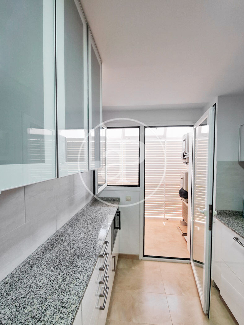 La cuina està totalment equipada i amb tots els electrodomèstics i és moderna i nova. Des de la cuina s'accedeix a un balcó on hi ha la zona bugaderia.