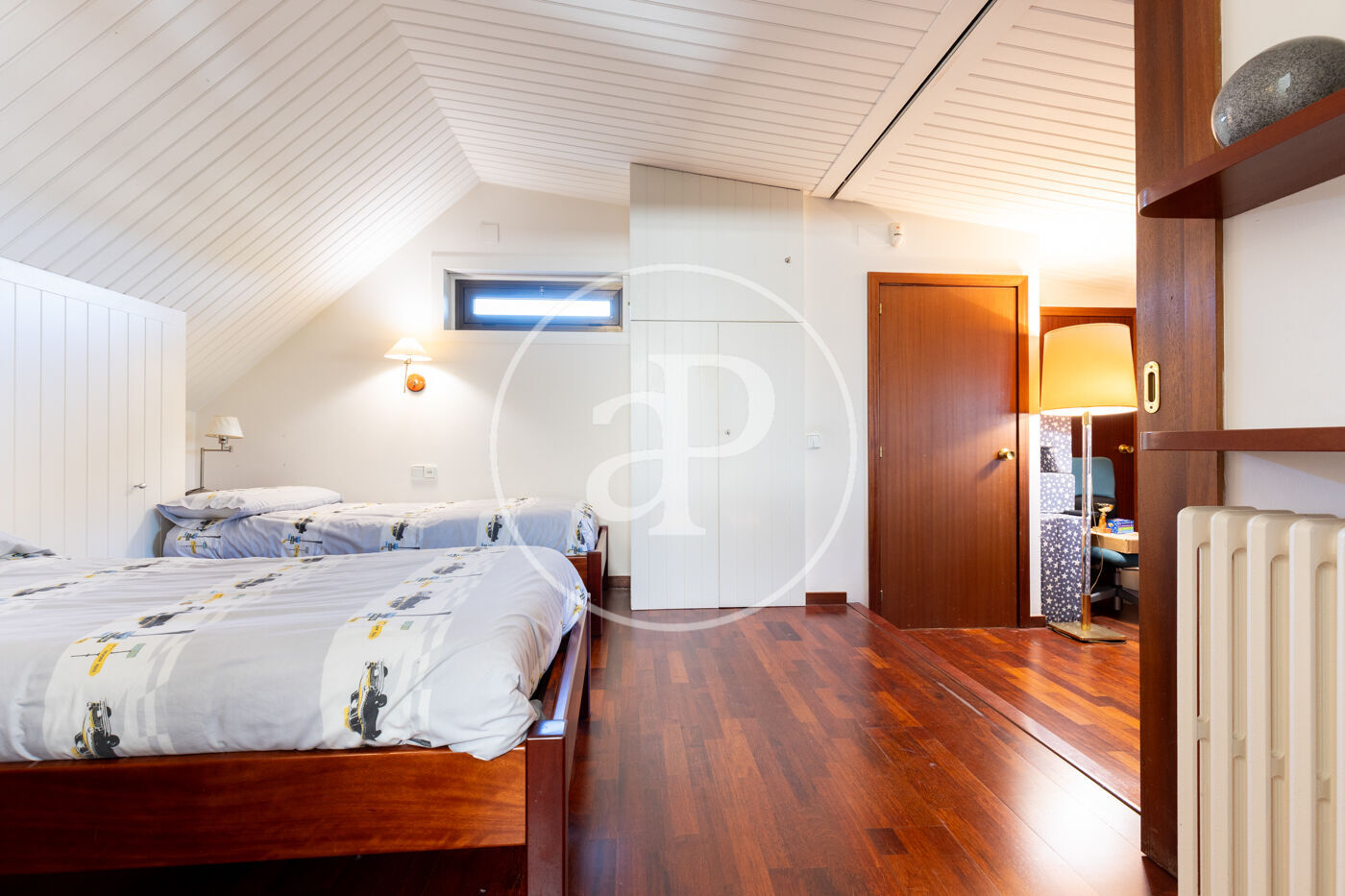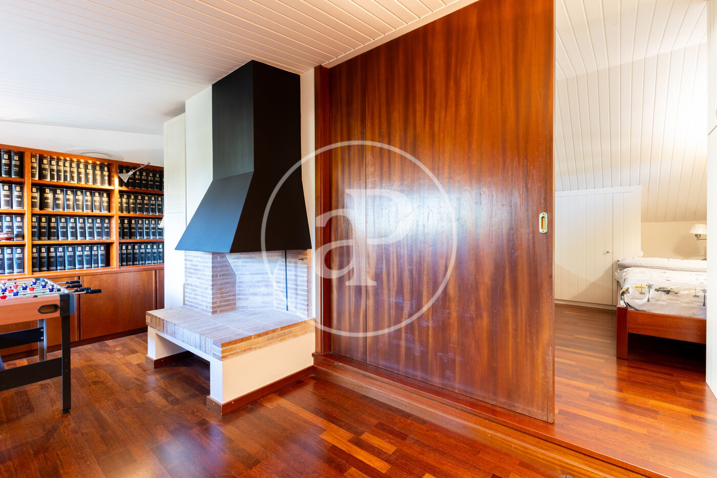 I encara hi ha més! Un altre espai que també t’enamorarà es troba a la planta superior: l’estudi-biblioteca amb llar de foc i sostre de fusta sota teulada. Un refugi perfecte per llegir, treballar o simplement contemplar el foc en silenci.