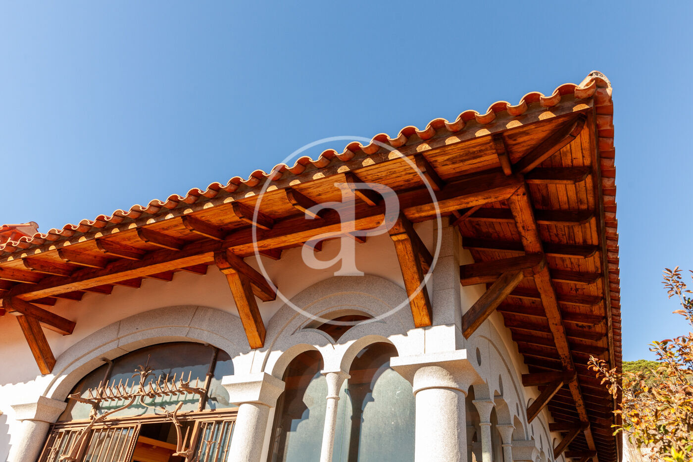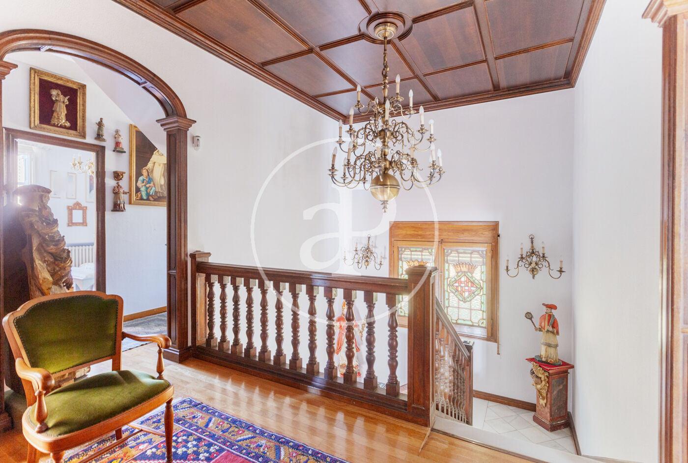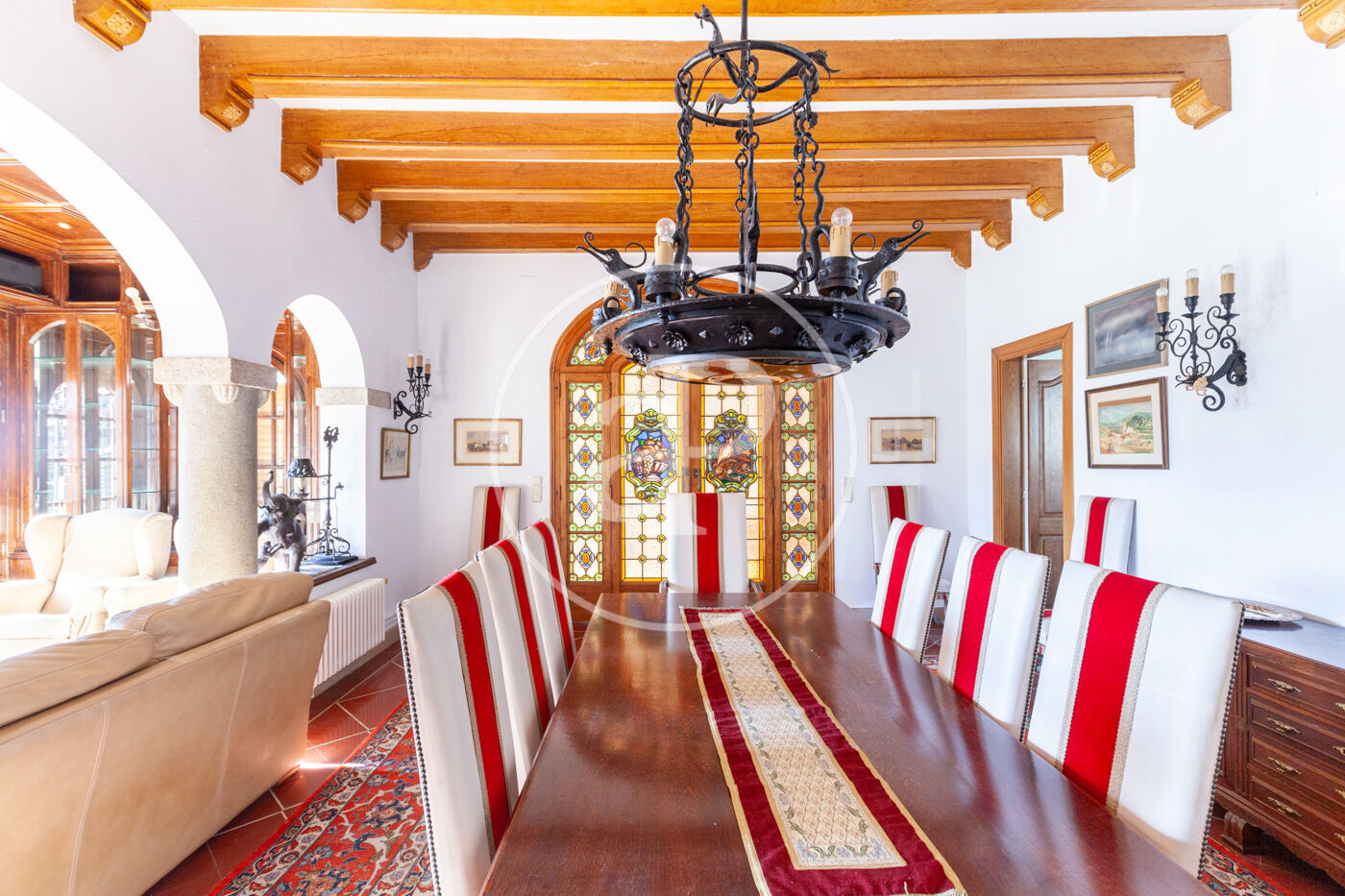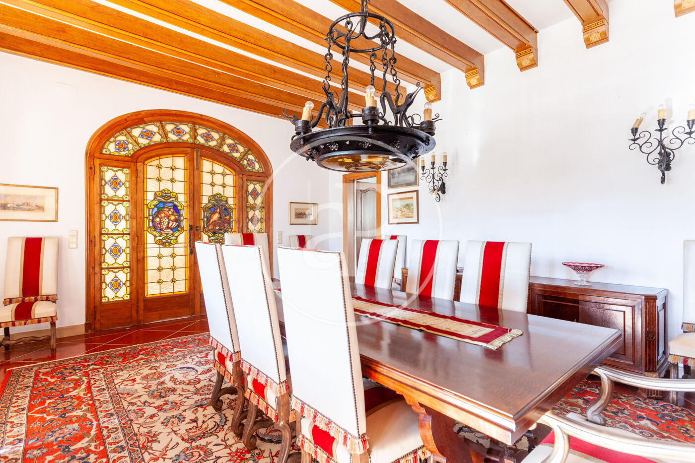 Amb una superfície construïda de 330 m² distribuïts en tres nivells, la vil·la destaca pels seus espais amplis banyats en llum natural gràcies a les seves vidrieres de colors i orientació sud-est. Els detalls arquitectònics, com les bigues de fusta, els arcs elegants, les columnes i el torreó, evoquen un estil atemporal que combina l’elegància senyorial amb un ambient acollidor.