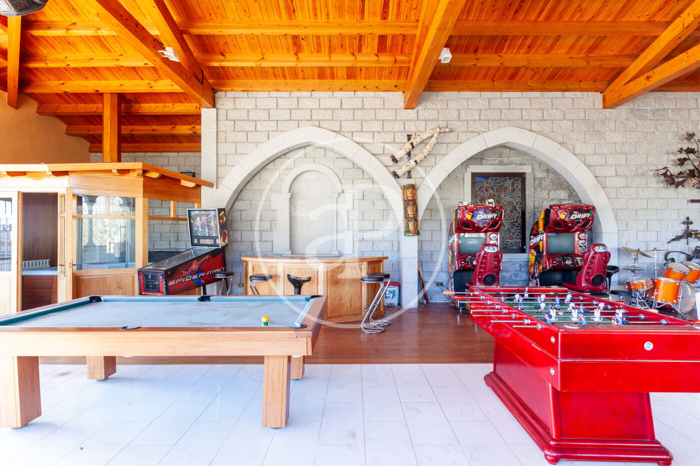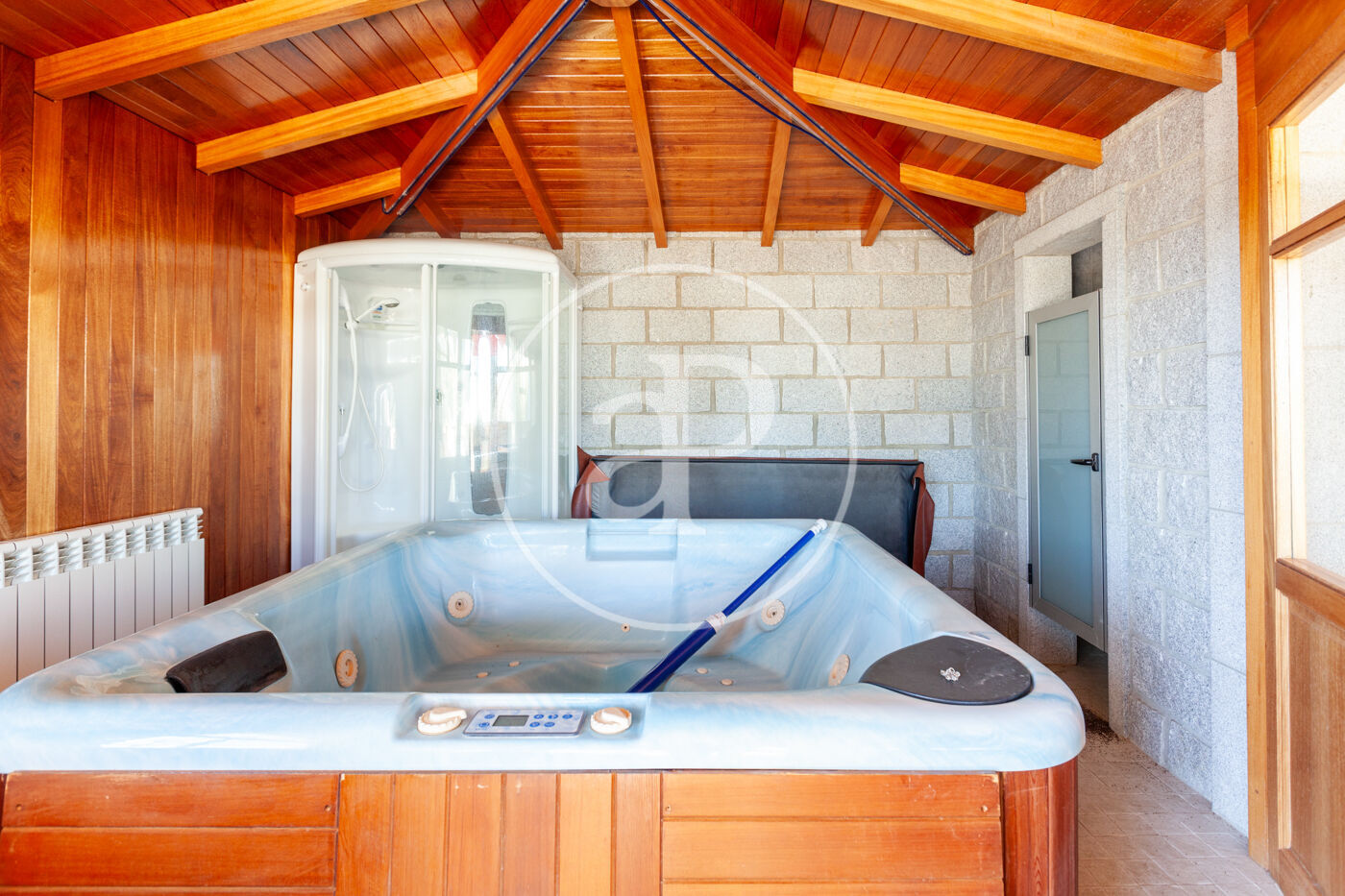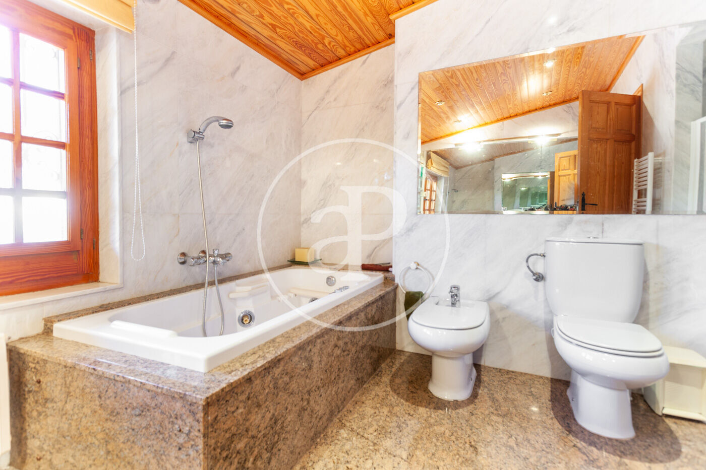 L’interior compta amb 6 dormitoris, incloent-hi una suite principal amb vistes panoràmiques i accés a una terrassa privada. Els terres de parquet i ceràmica aporten calidesa i sofisticació als espais, mentre que la xemeneia al saló es converteix en el cor de la casa. La propietat també disposa d’una sala de festes amb bar, un jacuzzi per a moments de relaxació i un celler per als amants del vi.