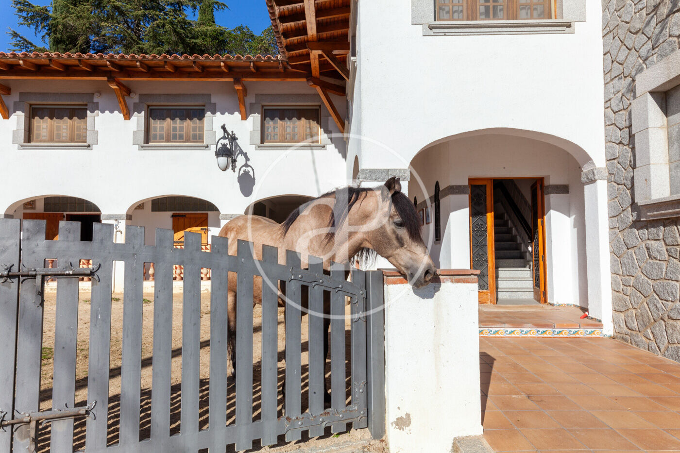 L’exterior és un autèntic paradís. Els jardins impecablement cuidats envolten una piscina d’aigua salada, perfecta per gaudir del clima mediterrani. A més, la finca compta amb estables per a cavalls, ideals per a aquells que busquen un estil de vida eqüestre, i un bosc privat que convida a passejades tranquil·les en plena natura.