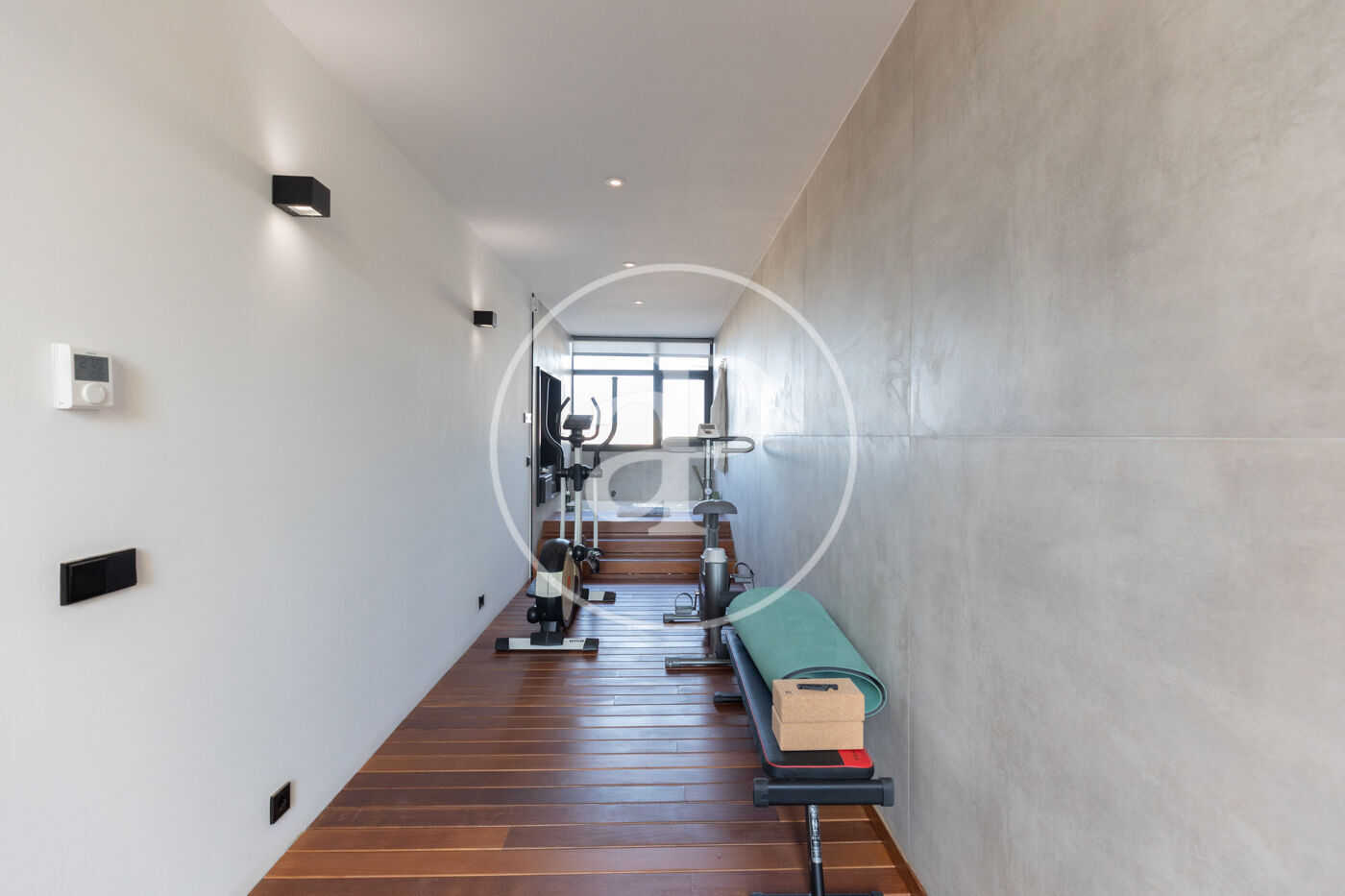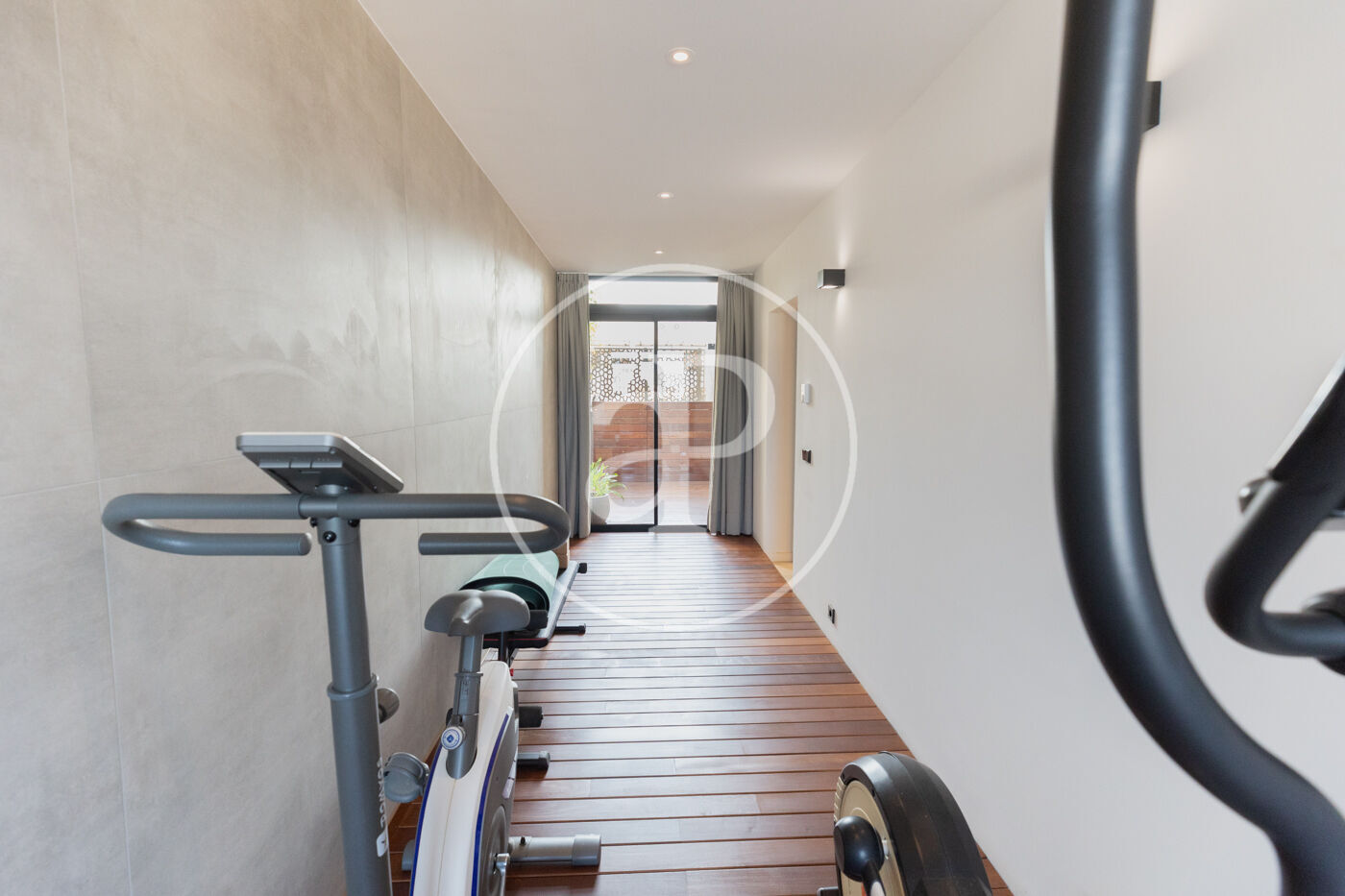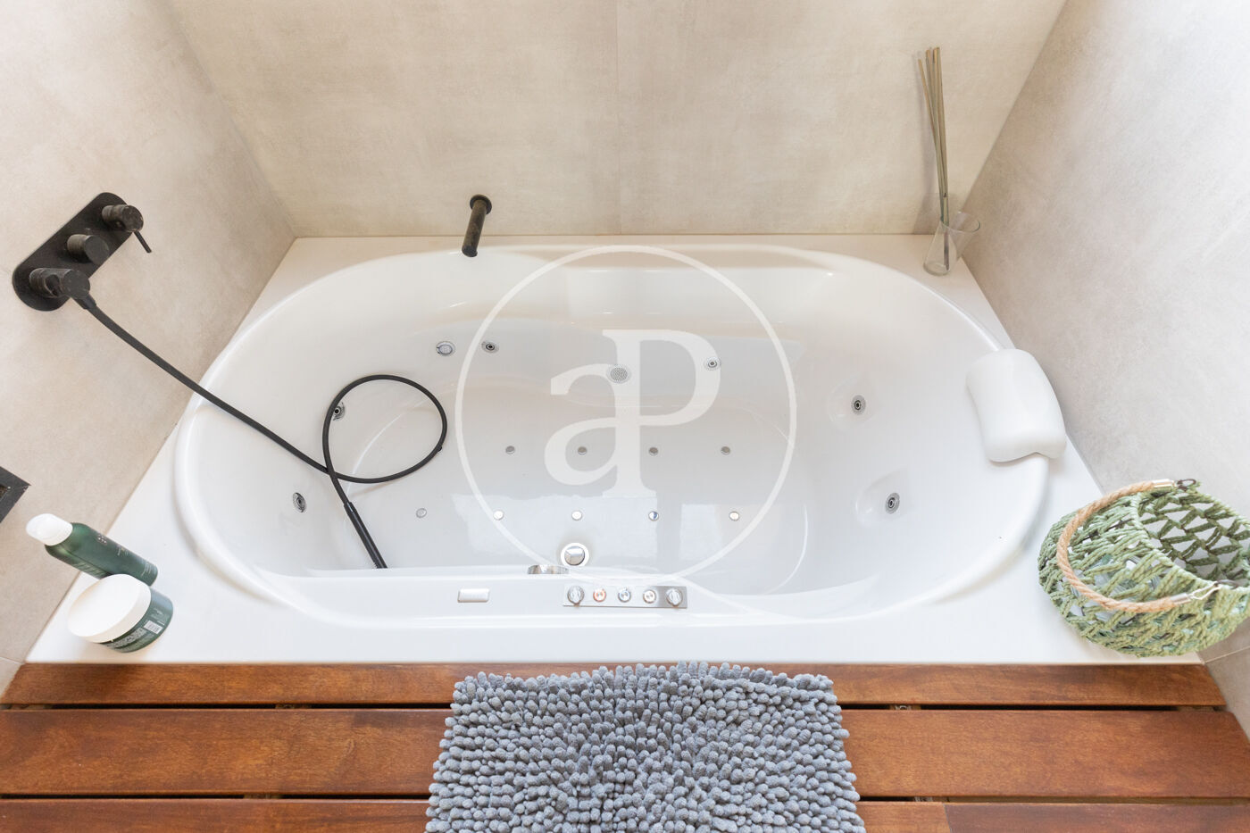 A l'exterior trobareu dues terrasses: una d'elles, dedicada al relax i al benestar, ofereix un espai de gimnàs, un jacuzzi i una zona reservada per a la pràctica de ioga, tot amb vistes espectaculars al castell de Bellver. La segona terrassa, més acollidora, està equipada amb una taula i cadires, ideal per menjar a l'aire lliure o moments de relaxació.