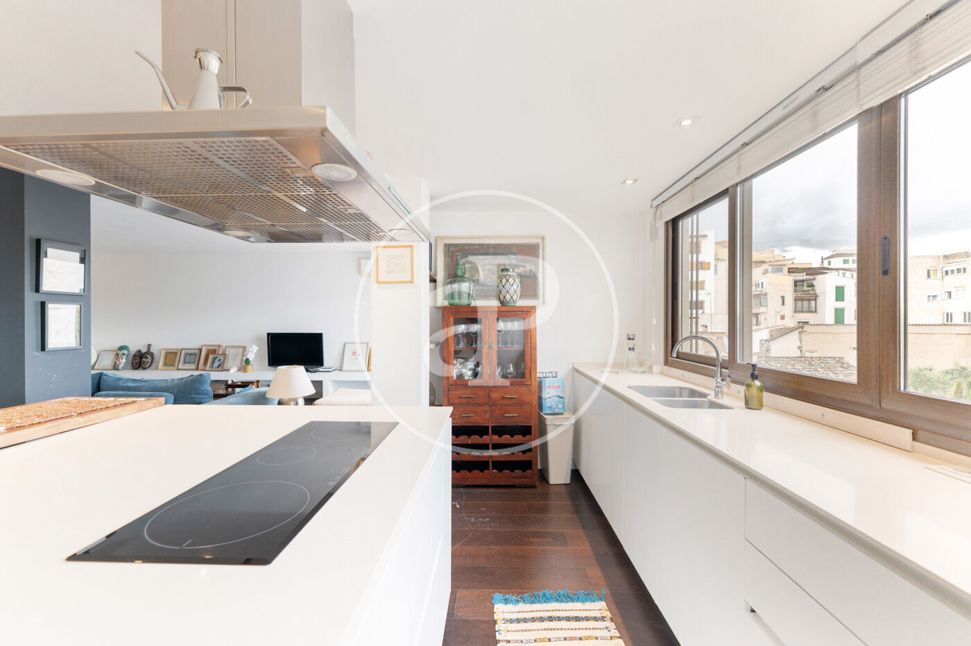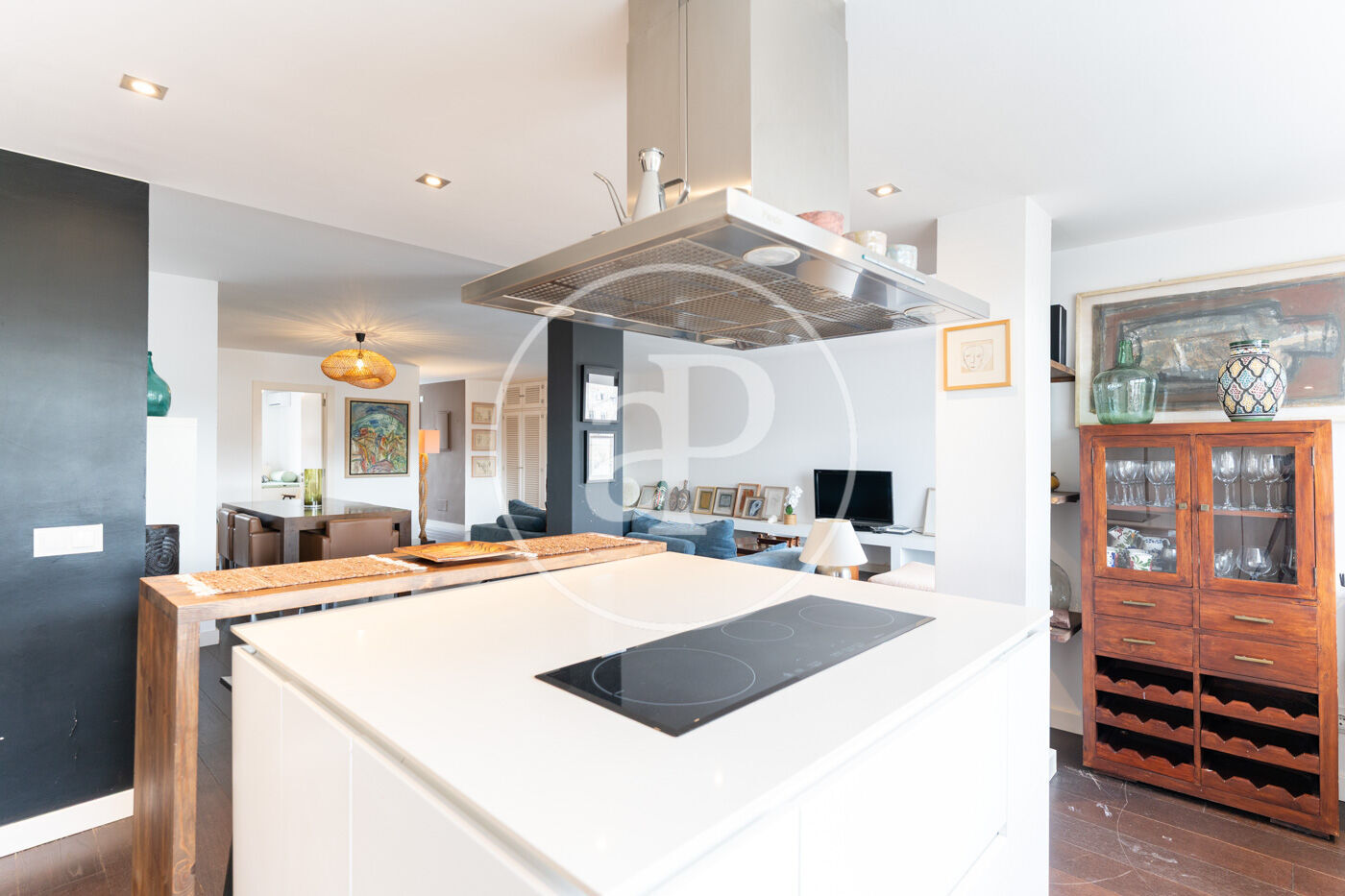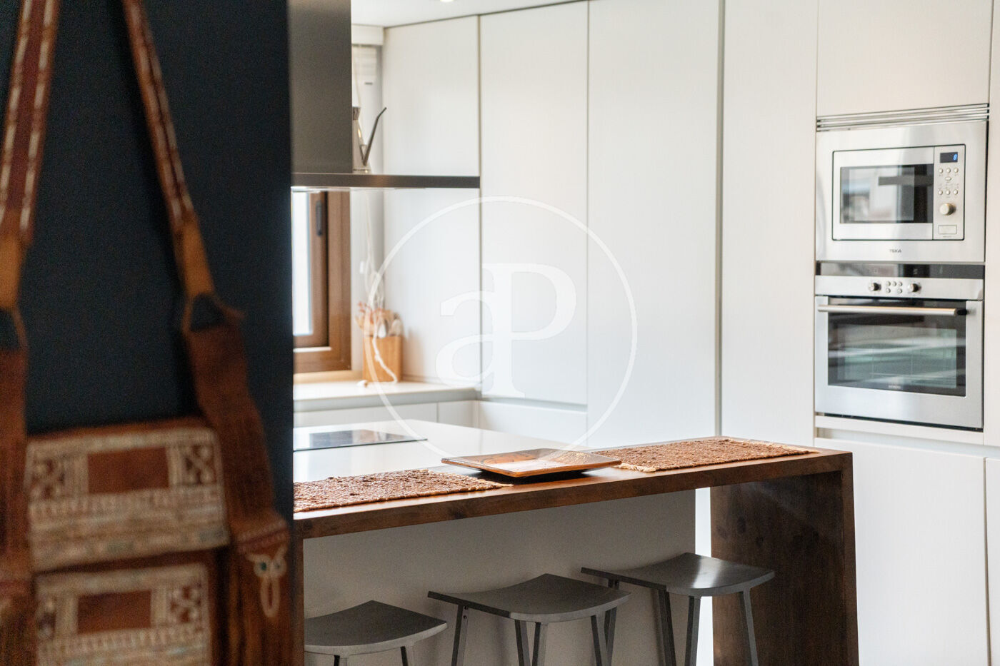 El saló-menjador, ampli i lluminós amb sortida directa a la terrassa, destaca pel seu estil contemporani i acollidor, amb una cuidada selecció de mobles i detalls decoratius que aporten personalitat: sofàs en tons blaus, taula de centre en fusta natural i peces úniques que creen un ambient elegant i relaxat. La il·luminació també juga un paper clau, amb làmpades de disseny que aporten calidesa i caràcter. La cuina oberta és minimalista i funcional, amb mobles blancs, electrodomèstics integrats i una illa central en fusta que afegeix contrast i sofisticació. És un espai pensat per gaudir tant del dia a dia com de trobades informals.