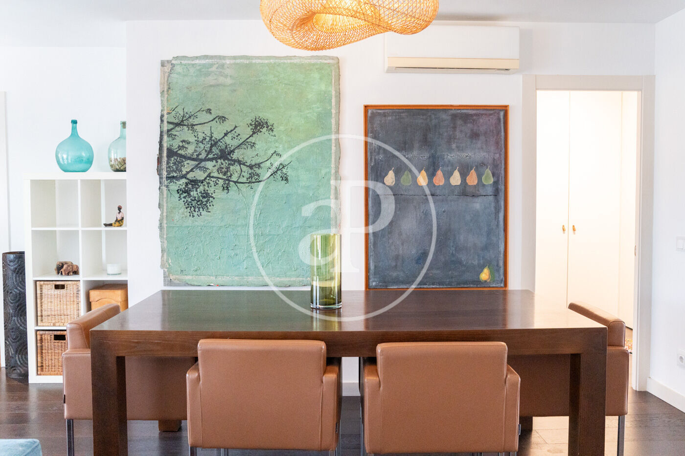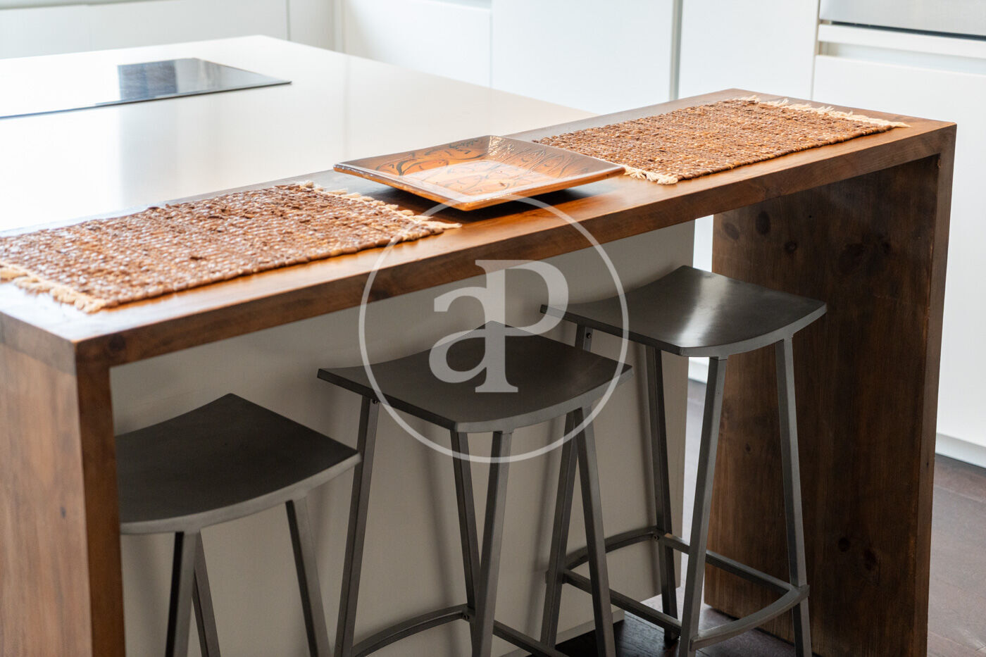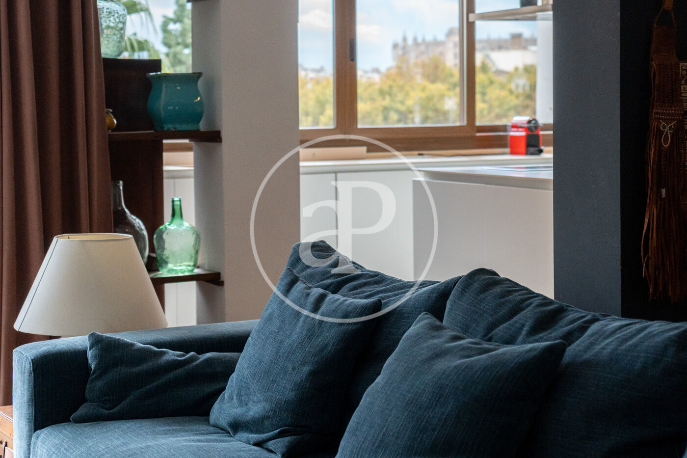 El saló-menjador, ampli i lluminós amb sortida directa a la terrassa, destaca pel seu estil contemporani i acollidor, amb una cuidada selecció de mobles i detalls decoratius que aporten personalitat: sofàs en tons blaus, taula de centre en fusta natural i peces úniques que creen un ambient elegant i relaxat. La il·luminació també juga un paper clau, amb làmpades de disseny que aporten calidesa i caràcter. La cuina oberta és minimalista i funcional, amb mobles blancs, electrodomèstics integrats i una illa central en fusta que afegeix contrast i sofisticació. És un espai pensat per gaudir tant del dia a dia com de trobades informals.
