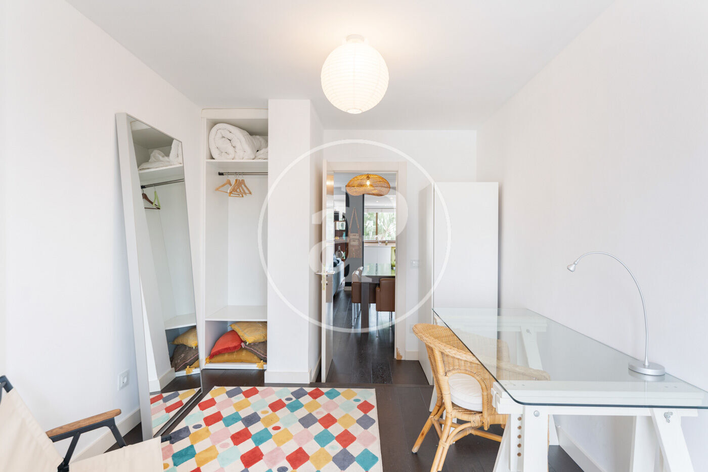 Les habitacions mantenen la mateixa línia estètica: la principal amb bany en suite amb banyera i armaris encastats, combina tons neutres amb una paret en gris fosc que aporta profunditat, mentre que la segona habitació ofereix un ambient versàtil, ideal com a dormitori o despatx, amb detalls en fibres naturals i tèxtils colorits. Disposa d’un altre bany complet amb plat de dutxa.
