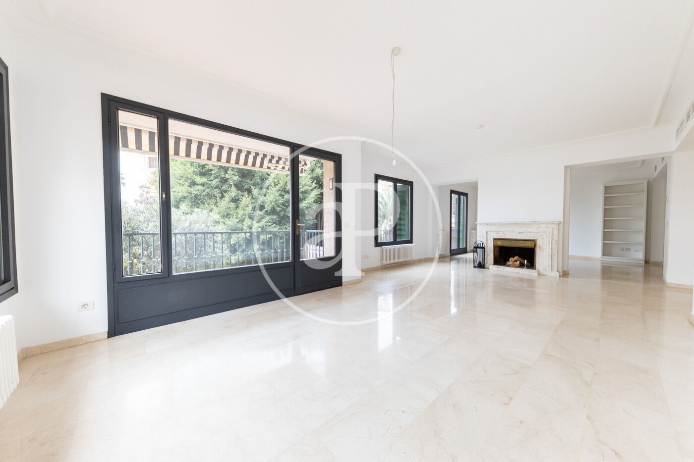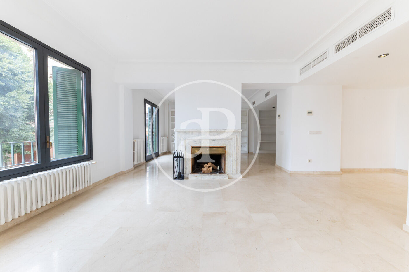 A l’entrada s’accedeix a un elegant rebedor que condueix a la zona de dia, composta per un menjador amb llar de foc que aporta calidesa a l’ambient, un ampli i lluminós saló amb grans finestrals amb accés a una terrassa amb vistes desprenudes i un espai obert ideal per crear una biblioteca o un segon saló, a més d’un lavabo de cortesia per a convidats. La cuina independent està completament moblada i equipada, amb espai suficient per incorporar-hi una taula d’esmorzar, i des d’ella s’accedeix a la bugaderia i a una habitació de servei amb bany complet i banyera.